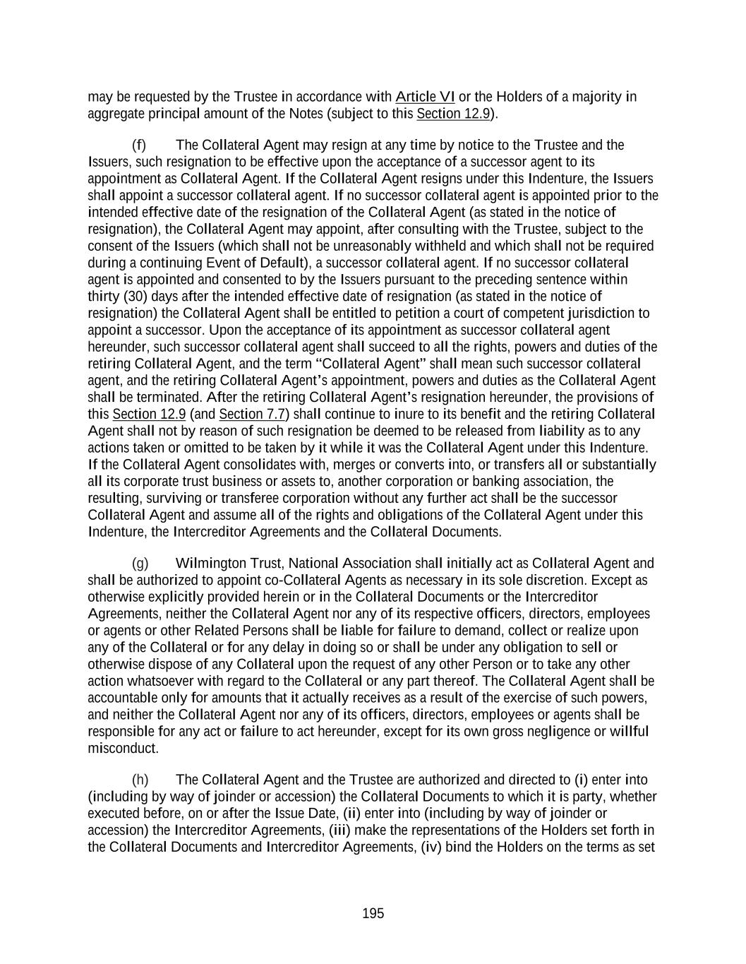 195 may be requested by the Trustee in accordance with Article VI or the Holders of a majority in aggregate principal amount of the Notes (subject to this Section 12.9). (f) The Collateral Agent may resign at any time by notice to the Trustee and the Issuers, such resignation to be effective upon the acceptance of a successor agent to its appointment as Collateral Agent. If the Collateral Agent resigns under this Indenture, the Issuers shall appoint a successor collateral agent. If no successor collateral agent is appointed prior to the intended effective date of the resignation of the Collateral Agent (as stated in the notice of resignation), the Collateral Agent may appoint, after consulting with the Trustee, subject to the consent of the Issuers (which shall not be unreasonably withheld and which shall not be required during a continuing Event of Default), a successor collateral agent. If no successor collateral agent is appointed and consented to by the Issuers pursuant to the preceding sentence within thirty (30) days after the intended effective date of resignation (as stated in the notice of resignation) the Collateral Agent shall be entitled to petition a court of competent jurisdiction to appoint a successor. Upon the acceptance of its appointment as successor collateral agent hereunder, such successor collateral agent shall succeed to all the rights, powers and duties of the retiring Collateral Agent, and the term “Collateral Agent” shall mean such successor collateral agent, and the retiring Collateral Agent’s appointment, powers and duties as the Collateral Agent shall be terminated. After the retiring Collateral Agent’s resignation hereunder, the provisions of this Section 12.9 (and Section 7.7) shall continue to inure to its benefit and the retiring Collateral Agent shall not by reason of such resignation be deemed to be released from liability as to any actions taken or omitted to be taken by it while it was the Collateral Agent under this Indenture. If the Collateral Agent consolidates with, merges or converts into, or transfers all or substantially all its corporate trust business or assets to, another corporation or banking association, the resulting, surviving or transferee corporation without any further act shall be the successor Collateral Agent and assume all of the rights and obligations of the Collateral Agent under this Indenture, the Intercreditor Agreements and the Collateral Documents. (g) Wilmington Trust, National Association shall initially act as Collateral Agent and shall be authorized to appoint co-Collateral Agents as necessary in its sole discretion. Except as otherwise explicitly provided herein or in the Collateral Documents or the Intercreditor Agreements, neither the Collateral Agent nor any of its respective officers, directors, employees or agents or other Related Persons shall be liable for failure to demand, collect or realize upon any of the Collateral or for any delay in doing so or shall be under any obligation to sell or otherwise dispose of any Collateral upon the request of any other Person or to take any other action whatsoever with regard to the Collateral or any part thereof. The Collateral Agent shall be accountable only for amounts that it actually receives as a result of the exercise of such powers, and neither the Collateral Agent nor any of its officers, directors, employees or agents shall be responsible for any act or failure to act hereunder, except for its own gross negligence or willful misconduct. (h) The Collateral Agent and the Trustee are authorized and directed to (i) enter into (including by way of joinder or accession) the Collateral Documents to which it is party, whether executed before, on or after the Issue Date, (ii) enter into (including by way of joinder or accession) the Intercreditor Agreements, (iii) make the representations of the Holders set forth in the Collateral Documents and Intercreditor Agreements, (iv) bind the Holders on the terms as set