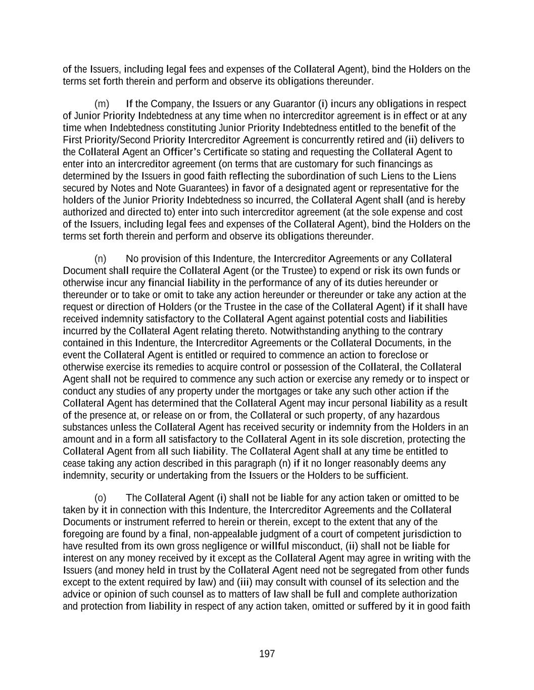 197 of the Issuers, including legal fees and expenses of the Collateral Agent), bind the Holders on the terms set forth therein and perform and observe its obligations thereunder. (m) If the Company, the Issuers or any Guarantor (i) incurs any obligations in respect of Junior Priority Indebtedness at any time when no intercreditor agreement is in effect or at any time when Indebtedness constituting Junior Priority Indebtedness entitled to the benefit of the First Priority/Second Priority Intercreditor Agreement is concurrently retired and (ii) delivers to the Collateral Agent an Officer’s Certificate so stating and requesting the Collateral Agent to enter into an intercreditor agreement (on terms that are customary for such financings as determined by the Issuers in good faith reflecting the subordination of such Liens to the Liens secured by Notes and Note Guarantees) in favor of a designated agent or representative for the holders of the Junior Priority Indebtedness so incurred, the Collateral Agent shall (and is hereby authorized and directed to) enter into such intercreditor agreement (at the sole expense and cost of the Issuers, including legal fees and expenses of the Collateral Agent), bind the Holders on the terms set forth therein and perform and observe its obligations thereunder. (n) No provision of this Indenture, the Intercreditor Agreements or any Collateral Document shall require the Collateral Agent (or the Trustee) to expend or risk its own funds or otherwise incur any financial liability in the performance of any of its duties hereunder or thereunder or to take or omit to take any action hereunder or thereunder or take any action at the request or direction of Holders (or the Trustee in the case of the Collateral Agent) if it shall have received indemnity satisfactory to the Collateral Agent against potential costs and liabilities incurred by the Collateral Agent relating thereto. Notwithstanding anything to the contrary contained in this Indenture, the Intercreditor Agreements or the Collateral Documents, in the event the Collateral Agent is entitled or required to commence an action to foreclose or otherwise exercise its remedies to acquire control or possession of the Collateral, the Collateral Agent shall not be required to commence any such action or exercise any remedy or to inspect or conduct any studies of any property under the mortgages or take any such other action if the Collateral Agent has determined that the Collateral Agent may incur personal liability as a result of the presence at, or release on or from, the Collateral or such property, of any hazardous substances unless the Collateral Agent has received security or indemnity from the Holders in an amount and in a form all satisfactory to the Collateral Agent in its sole discretion, protecting the Collateral Agent from all such liability. The Collateral Agent shall at any time be entitled to cease taking any action described in this paragraph (n) if it no longer reasonably deems any indemnity, security or undertaking from the Issuers or the Holders to be sufficient. (o) The Collateral Agent (i) shall not be liable for any action taken or omitted to be taken by it in connection with this Indenture, the Intercreditor Agreements and the Collateral Documents or instrument referred to herein or therein, except to the extent that any of the foregoing are found by a final, non-appealable judgment of a court of competent jurisdiction to have resulted from its own gross negligence or willful misconduct, (ii) shall not be liable for interest on any money received by it except as the Collateral Agent may agree in writing with the Issuers (and money held in trust by the Collateral Agent need not be segregated from other funds except to the extent required by law) and (iii) may consult with counsel of its selection and the advice or opinion of such counsel as to matters of law shall be full and complete authorization and protection from liability in respect of any action taken, omitted or suffered by it in good faith