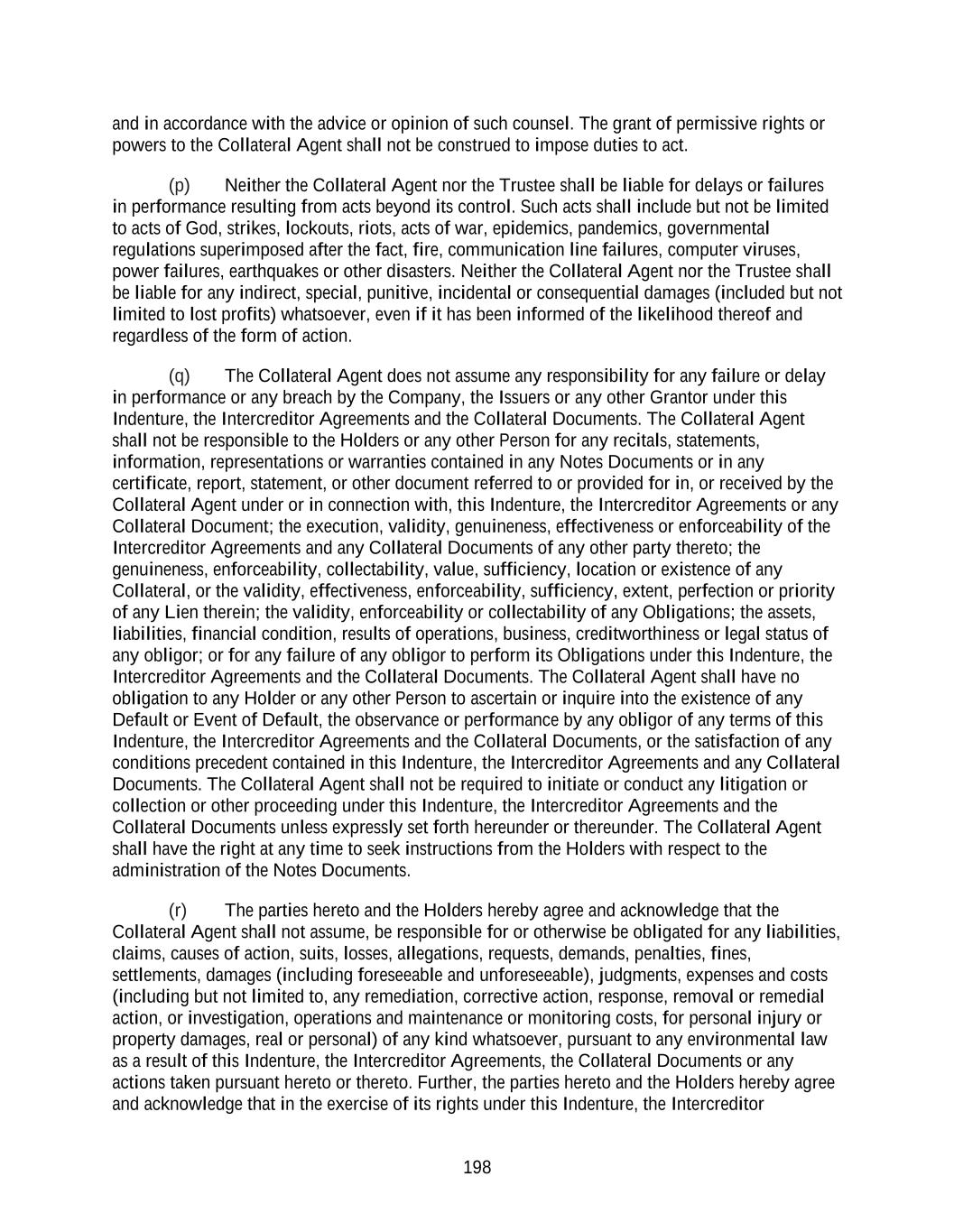 198 and in accordance with the advice or opinion of such counsel. The grant of permissive rights or powers to the Collateral Agent shall not be construed to impose duties to act. (p) Neither the Collateral Agent nor the Trustee shall be liable for delays or failures in performance resulting from acts beyond its control. Such acts shall include but not be limited to acts of God, strikes, lockouts, riots, acts of war, epidemics, pandemics, governmental regulations superimposed after the fact, fire, communication line failures, computer viruses, power failures, earthquakes or other disasters. Neither the Collateral Agent nor the Trustee shall be liable for any indirect, special, punitive, incidental or consequential damages (included but not limited to lost profits) whatsoever, even if it has been informed of the likelihood thereof and regardless of the form of action. (q) The Collateral Agent does not assume any responsibility for any failure or delay in performance or any breach by the Company, the Issuers or any other Grantor under this Indenture, the Intercreditor Agreements and the Collateral Documents. The Collateral Agent shall not be responsible to the Holders or any other Person for any recitals, statements, information, representations or warranties contained in any Notes Documents or in any certificate, report, statement, or other document referred to or provided for in, or received by the Collateral Agent under or in connection with, this Indenture, the Intercreditor Agreements or any Collateral Document; the execution, validity, genuineness, effectiveness or enforceability of the Intercreditor Agreements and any Collateral Documents of any other party thereto; the genuineness, enforceability, collectability, value, sufficiency, location or existence of any Collateral, or the validity, effectiveness, enforceability, sufficiency, extent, perfection or priority of any Lien therein; the validity, enforceability or collectability of any Obligations; the assets, liabilities, financial condition, results of operations, business, creditworthiness or legal status of any obligor; or for any failure of any obligor to perform its Obligations under this Indenture, the Intercreditor Agreements and the Collateral Documents. The Collateral Agent shall have no obligation to any Holder or any other Person to ascertain or inquire into the existence of any Default or Event of Default, the observance or performance by any obligor of any terms of this Indenture, the Intercreditor Agreements and the Collateral Documents, or the satisfaction of any conditions precedent contained in this Indenture, the Intercreditor Agreements and any Collateral Documents. The Collateral Agent shall not be required to initiate or conduct any litigation or collection or other proceeding under this Indenture, the Intercreditor Agreements and the Collateral Documents unless expressly set forth hereunder or thereunder. The Collateral Agent shall have the right at any time to seek instructions from the Holders with respect to the administration of the Notes Documents. (r) The parties hereto and the Holders hereby agree and acknowledge that the Collateral Agent shall not assume, be responsible for or otherwise be obligated for any liabilities, claims, causes of action, suits, losses, allegations, requests, demands, penalties, fines, settlements, damages (including foreseeable and unforeseeable), judgments, expenses and costs (including but not limited to, any remediation, corrective action, response, removal or remedial action, or investigation, operations and maintenance or monitoring costs, for personal injury or property damages, real or personal) of any kind whatsoever, pursuant to any environmental law as a result of this Indenture, the Intercreditor Agreements, the Collateral Documents or any actions taken pursuant hereto or thereto. Further, the parties hereto and the Holders hereby agree and acknowledge that in the exercise of its rights under this Indenture, the Intercreditor