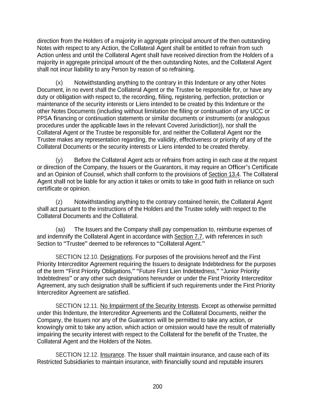 200 direction from the Holders of a majority in aggregate principal amount of the then outstanding Notes with respect to any Action, the Collateral Agent shall be entitled to refrain from such Action unless and until the Collateral Agent shall have received direction from the Holders of a majority in aggregate principal amount of the then outstanding Notes, and the Collateral Agent shall not incur liability to any Person by reason of so refraining. (x) Notwithstanding anything to the contrary in this Indenture or any other Notes Document, in no event shall the Collateral Agent or the Trustee be responsible for, or have any duty or obligation with respect to, the recording, filing, registering, perfection, protection or maintenance of the security interests or Liens intended to be created by this Indenture or the other Notes Documents (including without limitation the filing or continuation of any UCC or PPSA financing or continuation statements or similar documents or instruments (or analogous procedures under the applicable laws in the relevant Covered Jurisdiction)), nor shall the Collateral Agent or the Trustee be responsible for, and neither the Collateral Agent nor the Trustee makes any representation regarding, the validity, effectiveness or priority of any of the Collateral Documents or the security interests or Liens intended to be created thereby. (y) Before the Collateral Agent acts or refrains from acting in each case at the request or direction of the Company, the Issuers or the Guarantors, it may require an Officer’s Certificate and an Opinion of Counsel, which shall conform to the provisions of Section 13.4. The Collateral Agent shall not be liable for any action it takes or omits to take in good faith in reliance on such certificate or opinion. (z) Notwithstanding anything to the contrary contained herein, the Collateral Agent shall act pursuant to the instructions of the Holders and the Trustee solely with respect to the Collateral Documents and the Collateral. (aa) The Issuers and the Company shall pay compensation to, reimburse expenses of and indemnify the Collateral Agent in accordance with Section 7.7, with references in such Section to “Trustee” deemed to be references to “Collateral Agent.” SECTION 12.10. Designations. For purposes of the provisions hereof and the First Priority Intercreditor Agreement requiring the Issuers to designate Indebtedness for the purposes of the term “First Priority Obligations,” “Future First Lien Indebtedness,” “Junior Priority Indebtedness” or any other such designations hereunder or under the First Priority Intercreditor Agreement, any such designation shall be sufficient if such requirements under the First Priority Intercreditor Agreement are satisfied. SECTION 12.11. No Impairment of the Security Interests. Except as otherwise permitted under this Indenture, the Intercreditor Agreements and the Collateral Documents, neither the Company, the Issuers nor any of the Guarantors will be permitted to take any action, or knowingly omit to take any action, which action or omission would have the result of materially impairing the security interest with respect to the Collateral for the benefit of the Trustee, the Collateral Agent and the Holders of the Notes. SECTION 12.12. Insurance. The Issuer shall maintain insurance, and cause each of its Restricted Subsidiaries to maintain insurance, with financially sound and reputable insurers