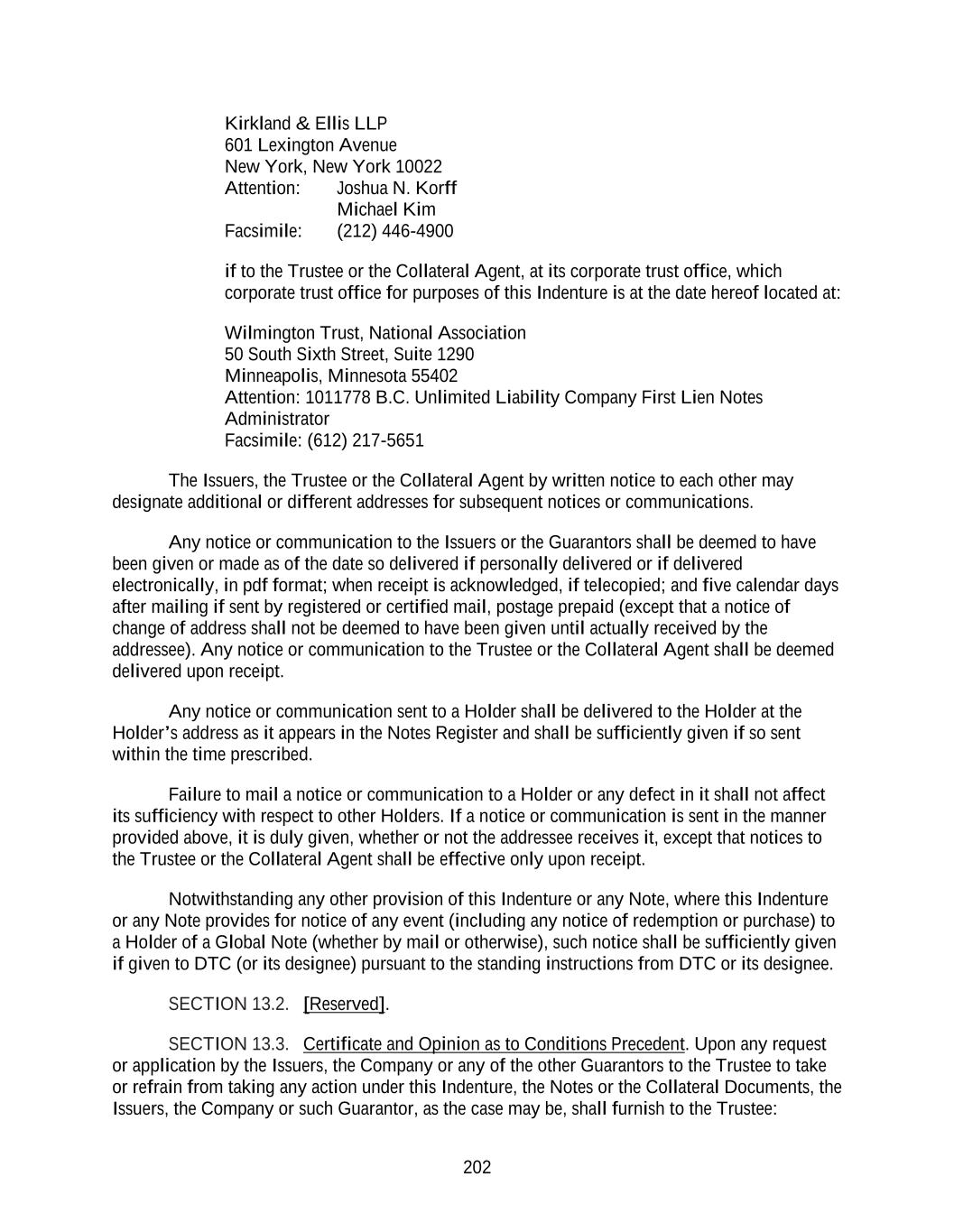 202 Kirkland & Ellis LLP 601 Lexington Avenue New York, New York 10022 Attention: Joshua N. Korff Michael Kim Facsimile: (212) 446-4900 if to the Trustee or the Collateral Agent, at its corporate trust office, which corporate trust office for purposes of this Indenture is at the date hereof located at: Wilmington Trust, National Association 50 South Sixth Street, Suite 1290 Minneapolis, Minnesota 55402 Attention: 1011778 B.C. Unlimited Liability Company First Lien Notes Administrator Facsimile: (612) 217-5651 The Issuers, the Trustee or the Collateral Agent by written notice to each other may designate additional or different addresses for subsequent notices or communications. Any notice or communication to the Issuers or the Guarantors shall be deemed to have been given or made as of the date so delivered if personally delivered or if delivered electronically, in pdf format; when receipt is acknowledged, if telecopied; and five calendar days after mailing if sent by registered or certified mail, postage prepaid (except that a notice of change of address shall not be deemed to have been given until actually received by the addressee). Any notice or communication to the Trustee or the Collateral Agent shall be deemed delivered upon receipt. Any notice or communication sent to a Holder shall be delivered to the Holder at the Holder’s address as it appears in the Notes Register and shall be sufficiently given if so sent within the time prescribed. Failure to mail a notice or communication to a Holder or any defect in it shall not affect its sufficiency with respect to other Holders. If a notice or communication is sent in the manner provided above, it is duly given, whether or not the addressee receives it, except that notices to the Trustee or the Collateral Agent shall be effective only upon receipt. Notwithstanding any other provision of this Indenture or any Note, where this Indenture or any Note provides for notice of any event (including any notice of redemption or purchase) to a Holder of a Global Note (whether by mail or otherwise), such notice shall be sufficiently given if given to DTC (or its designee) pursuant to the standing instructions from DTC or its designee. SECTION 13.2. [Reserved]. SECTION 13.3. Certificate and Opinion as to Conditions Precedent. Upon any request or application by the Issuers, the Company or any of the other Guarantors to the Trustee to take or refrain from taking any action under this Indenture, the Notes or the Collateral Documents, the Issuers, the Company or such Guarantor, as the case may be, shall furnish to the Trustee: