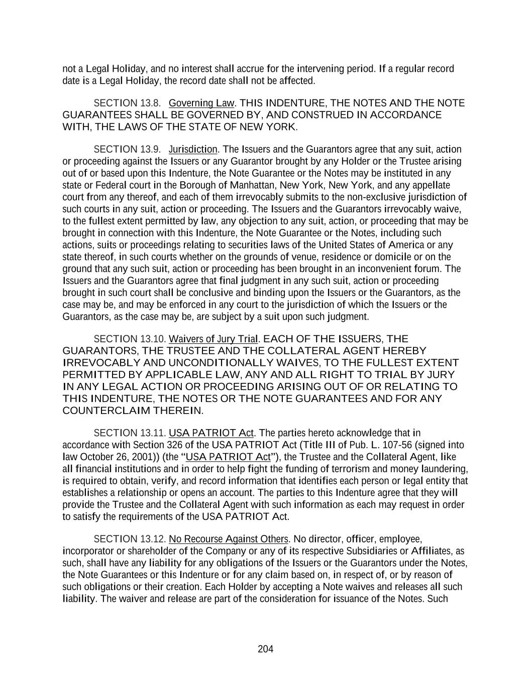 204 not a Legal Holiday, and no interest shall accrue for the intervening period. If a regular record date is a Legal Holiday, the record date shall not be affected. SECTION 13.8. Governing Law. THIS INDENTURE, THE NOTES AND THE NOTE GUARANTEES SHALL BE GOVERNED BY, AND CONSTRUED IN ACCORDANCE WITH, THE LAWS OF THE STATE OF NEW YORK. SECTION 13.9. Jurisdiction. The Issuers and the Guarantors agree that any suit, action or proceeding against the Issuers or any Guarantor brought by any Holder or the Trustee arising out of or based upon this Indenture, the Note Guarantee or the Notes may be instituted in any state or Federal court in the Borough of Manhattan, New York, New York, and any appellate court from any thereof, and each of them irrevocably submits to the non-exclusive jurisdiction of such courts in any suit, action or proceeding. The Issuers and the Guarantors irrevocably waive, to the fullest extent permitted by law, any objection to any suit, action, or proceeding that may be brought in connection with this Indenture, the Note Guarantee or the Notes, including such actions, suits or proceedings relating to securities laws of the United States of America or any state thereof, in such courts whether on the grounds of venue, residence or domicile or on the ground that any such suit, action or proceeding has been brought in an inconvenient forum. The Issuers and the Guarantors agree that final judgment in any such suit, action or proceeding brought in such court shall be conclusive and binding upon the Issuers or the Guarantors, as the case may be, and may be enforced in any court to the jurisdiction of which the Issuers or the Guarantors, as the case may be, are subject by a suit upon such judgment. SECTION 13.10. Waivers of Jury Trial. EACH OF THE ISSUERS, THE GUARANTORS, THE TRUSTEE AND THE COLLATERAL AGENT HEREBY IRREVOCABLY AND UNCONDITIONALLY WAIVES, TO THE FULLEST EXTENT PERMITTED BY APPLICABLE LAW, ANY AND ALL RIGHT TO TRIAL BY JURY IN ANY LEGAL ACTION OR PROCEEDING ARISING OUT OF OR RELATING TO THIS INDENTURE, THE NOTES OR THE NOTE GUARANTEES AND FOR ANY COUNTERCLAIM THEREIN. SECTION 13.11. USA PATRIOT Act. The parties hereto acknowledge that in accordance with Section 326 of the USA PATRIOT Act (Title III of Pub. L. 107-56 (signed into law October 26, 2001)) (the “USA PATRIOT Act”), the Trustee and the Collateral Agent, like all financial institutions and in order to help fight the funding of terrorism and money laundering, is required to obtain, verify, and record information that identifies each person or legal entity that establishes a relationship or opens an account. The parties to this Indenture agree that they will provide the Trustee and the Collateral Agent with such information as each may request in order to satisfy the requirements of the USA PATRIOT Act. SECTION 13.12. No Recourse Against Others. No director, officer, employee, incorporator or shareholder of the Company or any of its respective Subsidiaries or Affiliates, as such, shall have any liability for any obligations of the Issuers or the Guarantors under the Notes, the Note Guarantees or this Indenture or for any claim based on, in respect of, or by reason of such obligations or their creation. Each Holder by accepting a Note waives and releases all such liability. The waiver and release are part of the consideration for issuance of the Notes. Such