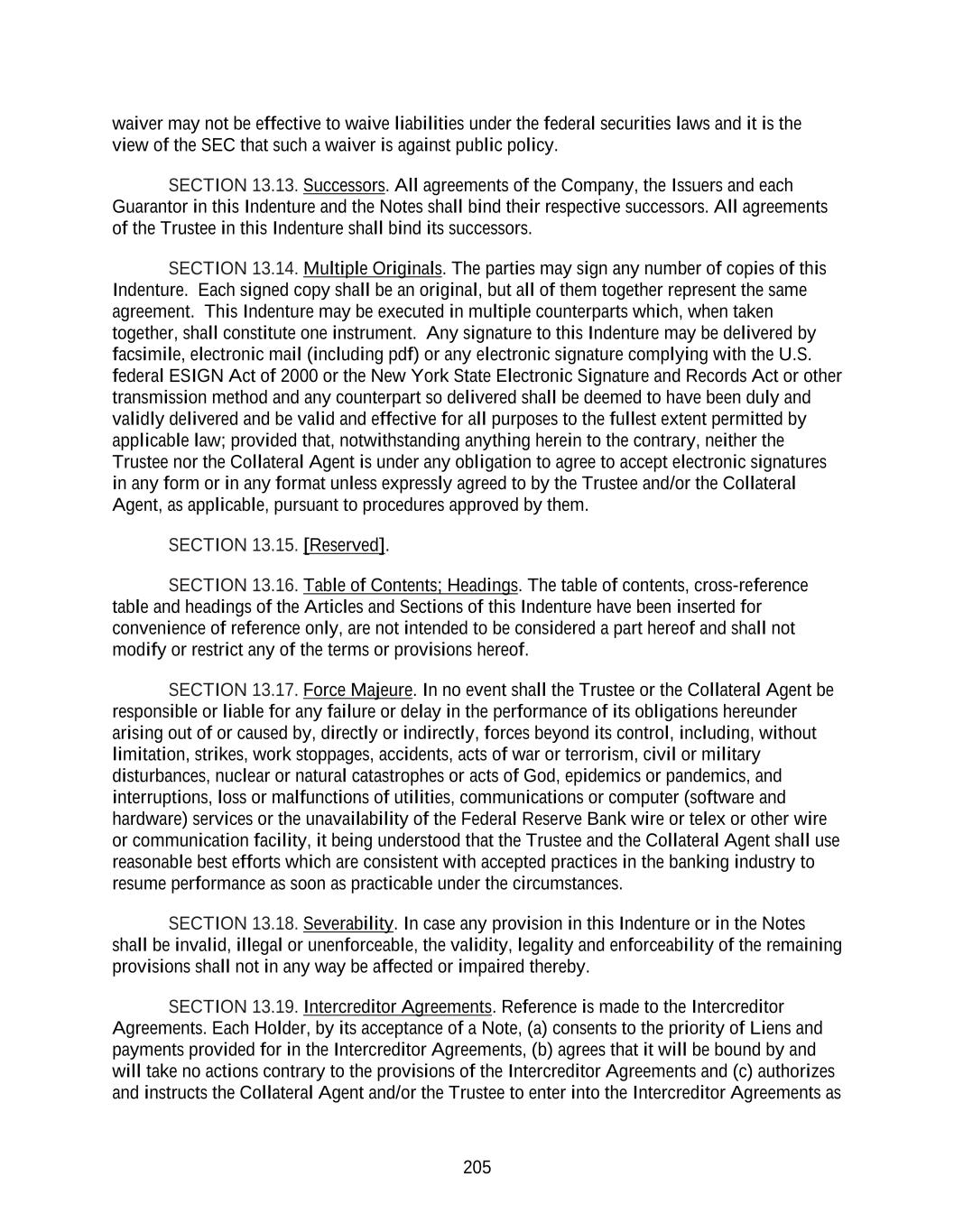 205 waiver may not be effective to waive liabilities under the federal securities laws and it is the view of the SEC that such a waiver is against public policy. SECTION 13.13. Successors. All agreements of the Company, the Issuers and each Guarantor in this Indenture and the Notes shall bind their respective successors. All agreements of the Trustee in this Indenture shall bind its successors. SECTION 13.14. Multiple Originals. The parties may sign any number of copies of this Indenture. Each signed copy shall be an original, but all of them together represent the same agreement. This Indenture may be executed in multiple counterparts which, when taken together, shall constitute one instrument. Any signature to this Indenture may be delivered by facsimile, electronic mail (including pdf) or any electronic signature complying with the U.S. federal ESIGN Act of 2000 or the New York State Electronic Signature and Records Act or other transmission method and any counterpart so delivered shall be deemed to have been duly and validly delivered and be valid and effective for all purposes to the fullest extent permitted by applicable law; provided that, notwithstanding anything herein to the contrary, neither the Trustee nor the Collateral Agent is under any obligation to agree to accept electronic signatures in any form or in any format unless expressly agreed to by the Trustee and/or the Collateral Agent, as applicable, pursuant to procedures approved by them. SECTION 13.15. [Reserved]. SECTION 13.16. Table of Contents; Headings. The table of contents, cross-reference table and headings of the Articles and Sections of this Indenture have been inserted for convenience of reference only, are not intended to be considered a part hereof and shall not modify or restrict any of the terms or provisions hereof. SECTION 13.17. Force Majeure. In no event shall the Trustee or the Collateral Agent be responsible or liable for any failure or delay in the performance of its obligations hereunder arising out of or caused by, directly or indirectly, forces beyond its control, including, without limitation, strikes, work stoppages, accidents, acts of war or terrorism, civil or military disturbances, nuclear or natural catastrophes or acts of God, epidemics or pandemics, and interruptions, loss or malfunctions of utilities, communications or computer (software and hardware) services or the unavailability of the Federal Reserve Bank wire or telex or other wire or communication facility, it being understood that the Trustee and the Collateral Agent shall use reasonable best efforts which are consistent with accepted practices in the banking industry to resume performance as soon as practicable under the circumstances. SECTION 13.18. Severability. In case any provision in this Indenture or in the Notes shall be invalid, illegal or unenforceable, the validity, legality and enforceability of the remaining provisions shall not in any way be affected or impaired thereby. SECTION 13.19. Intercreditor Agreements. Reference is made to the Intercreditor Agreements. Each Holder, by its acceptance of a Note, (a) consents to the priority of Liens and payments provided for in the Intercreditor Agreements, (b) agrees that it will be bound by and will take no actions contrary to the provisions of the Intercreditor Agreements and (c) authorizes and instructs the Collateral Agent and/or the Trustee to enter into the Intercreditor Agreements as