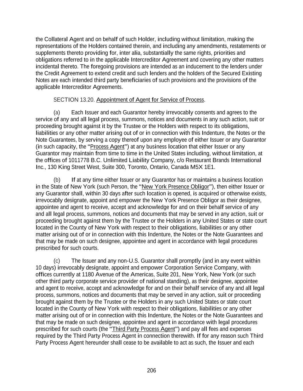 206 the Collateral Agent and on behalf of such Holder, including without limitation, making the representations of the Holders contained therein, and including any amendments, restatements or supplements thereto providing for, inter alia, substantially the same rights, priorities and obligations referred to in the applicable Intercreditor Agreement and covering any other matters incidental thereto. The foregoing provisions are intended as an inducement to the lenders under the Credit Agreement to extend credit and such lenders and the holders of the Secured Existing Notes are each intended third party beneficiaries of such provisions and the provisions of the applicable Intercreditor Agreements. SECTION 13.20. Appointment of Agent for Service of Process. (a) Each Issuer and each Guarantor hereby irrevocably consents and agrees to the service of any and all legal process, summons, notices and documents in any such action, suit or proceeding brought against it by the Trustee or the Holders with respect to its obligations, liabilities or any other matter arising out of or in connection with this Indenture, the Notes or the Note Guarantees, by serving a copy thereof upon any employee of either Issuer or any Guarantor (in such capacity, the “Process Agent”) at any business location that either Issuer or any Guarantor may maintain from time to time in the United States including, without limitation, at the offices of 1011778 B.C. Unlimited Liability Company, c/o Restaurant Brands International Inc., 130 King Street West, Suite 300, Toronto, Ontario, Canada M5X 1E1. (b) If at any time either Issuer or any Guarantor has or maintains a business location in the State of New York (such Person, the “New York Presence Obligor”), then either Issuer or any Guarantor shall, within 30 days after such location is opened, is acquired or otherwise exists, irrevocably designate, appoint and empower the New York Presence Obligor as their designee, appointee and agent to receive, accept and acknowledge for and on their behalf service of any and all legal process, summons, notices and documents that may be served in any action, suit or proceeding brought against them by the Trustee or the Holders in any United States or state court located in the County of New York with respect to their obligations, liabilities or any other matter arising out of or in connection with this Indenture, the Notes or the Note Guarantees and that may be made on such designee, appointee and agent in accordance with legal procedures prescribed for such courts. (c) The Issuer and any non-U.S. Guarantor shall promptly (and in any event within 10 days) irrevocably designate, appoint and empower Corporation Service Company, with offices currently at 1180 Avenue of the Americas, Suite 201, New York, New York (or such other third party corporate service provider of national standing), as their designee, appointee and agent to receive, accept and acknowledge for and on their behalf service of any and all legal process, summons, notices and documents that may be served in any action, suit or proceeding brought against them by the Trustee or the Holders in any such United States or state court located in the County of New York with respect to their obligations, liabilities or any other matter arising out of or in connection with this Indenture, the Notes or the Note Guarantees and that may be made on such designee, appointee and agent in accordance with legal procedures prescribed for such courts (the “Third Party Process Agent”) and pay all fees and expenses required by the Third Party Process Agent in connection therewith. If for any reason such Third Party Process Agent hereunder shall cease to be available to act as such, the Issuer and each