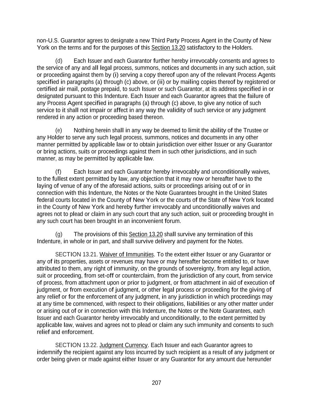 207 non-U.S. Guarantor agrees to designate a new Third Party Process Agent in the County of New York on the terms and for the purposes of this Section 13.20 satisfactory to the Holders. (d) Each Issuer and each Guarantor further hereby irrevocably consents and agrees to the service of any and all legal process, summons, notices and documents in any such action, suit or proceeding against them by (i) serving a copy thereof upon any of the relevant Process Agents specified in paragraphs (a) through (c) above, or (ii) or by mailing copies thereof by registered or certified air mail, postage prepaid, to such Issuer or such Guarantor, at its address specified in or designated pursuant to this Indenture. Each Issuer and each Guarantor agrees that the failure of any Process Agent specified in paragraphs (a) through (c) above, to give any notice of such service to it shall not impair or affect in any way the validity of such service or any judgment rendered in any action or proceeding based thereon. (e) Nothing herein shall in any way be deemed to limit the ability of the Trustee or any Holder to serve any such legal process, summons, notices and documents in any other manner permitted by applicable law or to obtain jurisdiction over either Issuer or any Guarantor or bring actions, suits or proceedings against them in such other jurisdictions, and in such manner, as may be permitted by applicable law. (f) Each Issuer and each Guarantor hereby irrevocably and unconditionally waives, to the fullest extent permitted by law, any objection that it may now or hereafter have to the laying of venue of any of the aforesaid actions, suits or proceedings arising out of or in connection with this Indenture, the Notes or the Note Guarantees brought in the United States federal courts located in the County of New York or the courts of the State of New York located in the County of New York and hereby further irrevocably and unconditionally waives and agrees not to plead or claim in any such court that any such action, suit or proceeding brought in any such court has been brought in an inconvenient forum. (g) The provisions of this Section 13.20 shall survive any termination of this Indenture, in whole or in part, and shall survive delivery and payment for the Notes. SECTION 13.21. Waiver of Immunities. To the extent either Issuer or any Guarantor or any of its properties, assets or revenues may have or may hereafter become entitled to, or have attributed to them, any right of immunity, on the grounds of sovereignty, from any legal action, suit or proceeding, from set-off or counterclaim, from the jurisdiction of any court, from service of process, from attachment upon or prior to judgment, or from attachment in aid of execution of judgment, or from execution of judgment, or other legal process or proceeding for the giving of any relief or for the enforcement of any judgment, in any jurisdiction in which proceedings may at any time be commenced, with respect to their obligations, liabilities or any other matter under or arising out of or in connection with this Indenture, the Notes or the Note Guarantees, each Issuer and each Guarantor hereby irrevocably and unconditionally, to the extent permitted by applicable law, waives and agrees not to plead or claim any such immunity and consents to such relief and enforcement. SECTION 13.22. Judgment Currency. Each Issuer and each Guarantor agrees to indemnify the recipient against any loss incurred by such recipient as a result of any judgment or order being given or made against either Issuer or any Guarantor for any amount due hereunder