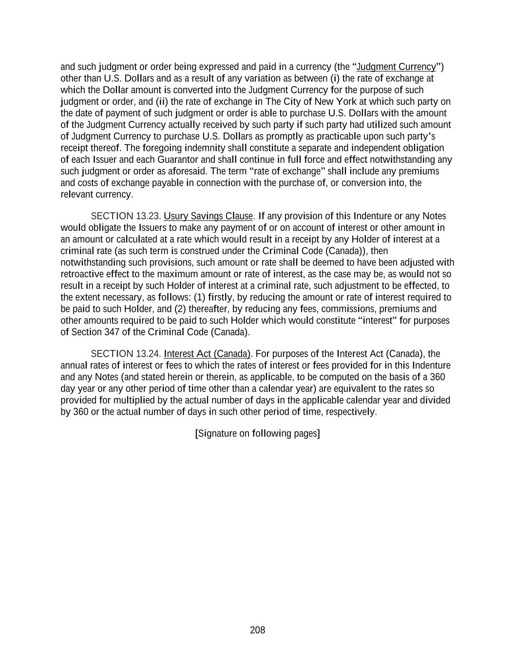 208 and such judgment or order being expressed and paid in a currency (the “Judgment Currency”) other than U.S. Dollars and as a result of any variation as between (i) the rate of exchange at which the Dollar amount is converted into the Judgment Currency for the purpose of such judgment or order, and (ii) the rate of exchange in The City of New York at which such party on the date of payment of such judgment or order is able to purchase U.S. Dollars with the amount of the Judgment Currency actually received by such party if such party had utilized such amount of Judgment Currency to purchase U.S. Dollars as promptly as practicable upon such party’s receipt thereof. The foregoing indemnity shall constitute a separate and independent obligation of each Issuer and each Guarantor and shall continue in full force and effect notwithstanding any such judgment or order as aforesaid. The term “rate of exchange” shall include any premiums and costs of exchange payable in connection with the purchase of, or conversion into, the relevant currency. SECTION 13.23. Usury Savings Clause. If any provision of this Indenture or any Notes would obligate the Issuers to make any payment of or on account of interest or other amount in an amount or calculated at a rate which would result in a receipt by any Holder of interest at a criminal rate (as such term is construed under the Criminal Code (Canada)), then notwithstanding such provisions, such amount or rate shall be deemed to have been adjusted with retroactive effect to the maximum amount or rate of interest, as the case may be, as would not so result in a receipt by such Holder of interest at a criminal rate, such adjustment to be effected, to the extent necessary, as follows: (1) firstly, by reducing the amount or rate of interest required to be paid to such Holder, and (2) thereafter, by reducing any fees, commissions, premiums and other amounts required to be paid to such Holder which would constitute “interest” for purposes of Section 347 of the Criminal Code (Canada). SECTION 13.24. Interest Act (Canada). For purposes of the Interest Act (Canada), the annual rates of interest or fees to which the rates of interest or fees provided for in this Indenture and any Notes (and stated herein or therein, as applicable, to be computed on the basis of a 360 day year or any other period of time other than a calendar year) are equivalent to the rates so provided for multiplied by the actual number of days in the applicable calendar year and divided by 360 or the actual number of days in such other period of time, respectively. [Signature on following pages]
