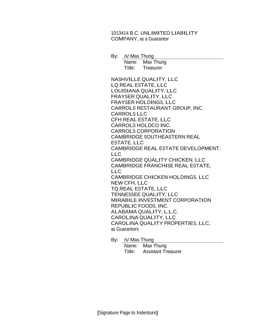 [Signature Page to Indenture] 1013414 B.C. UNLIMITED LIABILITY COMPANY, as a Guarantor By: /s/ Max Thung Name: Max Thung Title: Treasurer NASHVILLE QUALITY, LLC LQ REAL ESTATE, LLC LOUISIANA QUALITY, LLC FRAYSER QUALITY, LLC FRAYSER HOLDINGS, LLC CARROLS RESTAURANT GROUP, INC. CARROLS LLC CFH REAL ESTATE, LLC CARROLS HOLDCO INC. CARROLS CORPORATION CAMBRIDGE SOUTHEASTERN REAL ESTATE, LLC CAMBRIDGE REAL ESTATE DEVELOPMENT, LLC CAMBRIDGE QUALITY CHICKEN, LLC CAMBRIDGE FRANCHISE REAL ESTATE, LLC CAMBRIDGE CHICKEN HOLDINGS, LLC NEW CFH, LLC TQ REAL ESTATE, LLC TENNESSEE QUALITY, LLC MIRABILE INVESTMENT CORPORATION REPUBLIC FOODS, INC. ALABAMA QUALITY, L.L.C. CAROLINA QUALITY, LLC CAROLINA QUALITY PROPERTIES, LLC, as Guarantors By: /s/ Max Thung Name: Max Thung Title: Assistant Treasurer