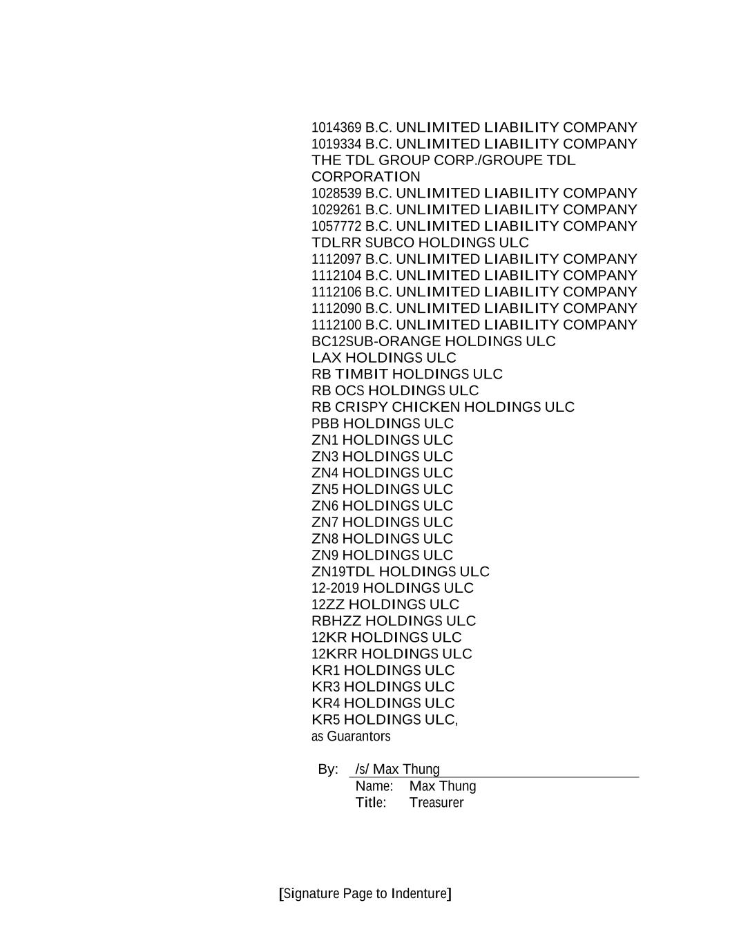 [Signature Page to Indenture] 1014369 B.C. UNLIMITED LIABILITY COMPANY 1019334 B.C. UNLIMITED LIABILITY COMPANY THE TDL GROUP CORP./GROUPE TDL CORPORATION 1028539 B.C. UNLIMITED LIABILITY COMPANY 1029261 B.C. UNLIMITED LIABILITY COMPANY 1057772 B.C. UNLIMITED LIABILITY COMPANY TDLRR SUBCO HOLDINGS ULC 1112097 B.C. UNLIMITED LIABILITY COMPANY 1112104 B.C. UNLIMITED LIABILITY COMPANY 1112106 B.C. UNLIMITED LIABILITY COMPANY 1112090 B.C. UNLIMITED LIABILITY COMPANY 1112100 B.C. UNLIMITED LIABILITY COMPANY BC12SUB-ORANGE HOLDINGS ULC LAX HOLDINGS ULC RB TIMBIT HOLDINGS ULC RB OCS HOLDINGS ULC RB CRISPY CHICKEN HOLDINGS ULC PBB HOLDINGS ULC ZN1 HOLDINGS ULC ZN3 HOLDINGS ULC ZN4 HOLDINGS ULC ZN5 HOLDINGS ULC ZN6 HOLDINGS ULC ZN7 HOLDINGS ULC ZN8 HOLDINGS ULC ZN9 HOLDINGS ULC ZN19TDL HOLDINGS ULC 12-2019 HOLDINGS ULC 12ZZ HOLDINGS ULC RBHZZ HOLDINGS ULC 12KR HOLDINGS ULC 12KRR HOLDINGS ULC KR1 HOLDINGS ULC KR3 HOLDINGS ULC KR4 HOLDINGS ULC KR5 HOLDINGS ULC, as Guarantors By: /s/ Max Thung Name: Max Thung Title: Treasurer