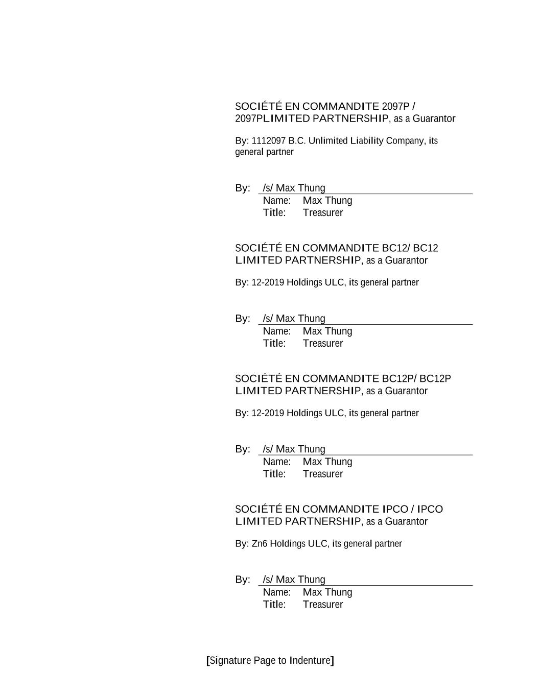 [Signature Page to Indenture] SOCIÉTÉ EN COMMANDITE 2097P / 2097PLIMITED PARTNERSHIP, as a Guarantor By: 1112097 B.C. Unlimited Liability Company, its general partner By: /s/ Max Thung Name: Max Thung Title: Treasurer SOCIÉTÉ EN COMMANDITE BC12/ BC12 LIMITED PARTNERSHIP, as a Guarantor By: 12-2019 Holdings ULC, its general partner By: /s/ Max Thung Name: Max Thung Title: Treasurer SOCIÉTÉ EN COMMANDITE BC12P/ BC12P LIMITED PARTNERSHIP, as a Guarantor By: 12-2019 Holdings ULC, its general partner By: /s/ Max Thung Name: Max Thung Title: Treasurer SOCIÉTÉ EN COMMANDITE IPCO / IPCO LIMITED PARTNERSHIP, as a Guarantor By: Zn6 Holdings ULC, its general partner By: /s/ Max Thung Name: Max Thung Title: Treasurer