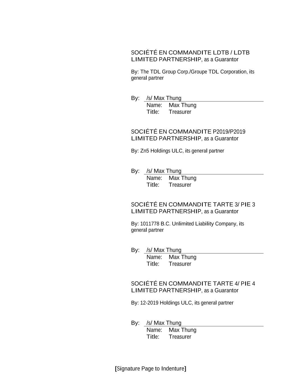 [Signature Page to Indenture] SOCIÉTÉ EN COMMANDITE LDTB / LDTB LIMITED PARTNERSHIP, as a Guarantor By: The TDL Group Corp./Groupe TDL Corporation, its general partner By: /s/ Max Thung Name: Max Thung Title: Treasurer SOCIÉTÉ EN COMMANDITE P2019/P2019 LIMITED PARTNERSHIP, as a Guarantor By: Zn5 Holdings ULC, its general partner By: /s/ Max Thung Name: Max Thung Title: Treasurer SOCIÉTÉ EN COMMANDITE TARTE 3/ PIE 3 LIMITED PARTNERSHIP, as a Guarantor By: 1011778 B.C. Unlimited Liability Company, its general partner By: /s/ Max Thung Name: Max Thung Title: Treasurer SOCIÉTÉ EN COMMANDITE TARTE 4/ PIE 4 LIMITED PARTNERSHIP, as a Guarantor By: 12-2019 Holdings ULC, its general partner By: /s/ Max Thung Name: Max Thung Title: Treasurer