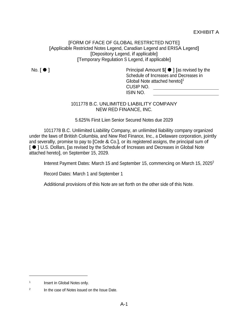 A-1 EXHIBIT A [FORM OF FACE OF GLOBAL RESTRICTED NOTE] [Applicable Restricted Notes Legend, Canadian Legend and ERISA Legend] [Depository Legend, if applicable] [Temporary Regulation S Legend, if applicable] No. [ ] Principal Amount $[ ] [as revised by the Schedule of Increases and Decreases in Global Note attached hereto]1 CUSIP NO. ISIN NO. 1011778 B.C. UNLIMITED LIABILITY COMPANY NEW RED FINANCE, INC. 5.625% First Lien Senior Secured Notes due 2029 1011778 B.C. Unlimited Liability Company, an unlimited liability company organized under the laws of British Columbia, and New Red Finance, Inc., a Delaware corporation, jointly and severally, promise to pay to [Cede & Co.], or its registered assigns, the principal sum of [ ] U.S. Dollars, [as revised by the Schedule of Increases and Decreases in Global Note attached hereto], on September 15, 2029. Interest Payment Dates: March 15 and September 15, commencing on March 15, 20252 Record Dates: March 1 and September 1 Additional provisions of this Note are set forth on the other side of this Note. 1 Insert in Global Notes only. 2 In the case of Notes issued on the Issue Date.