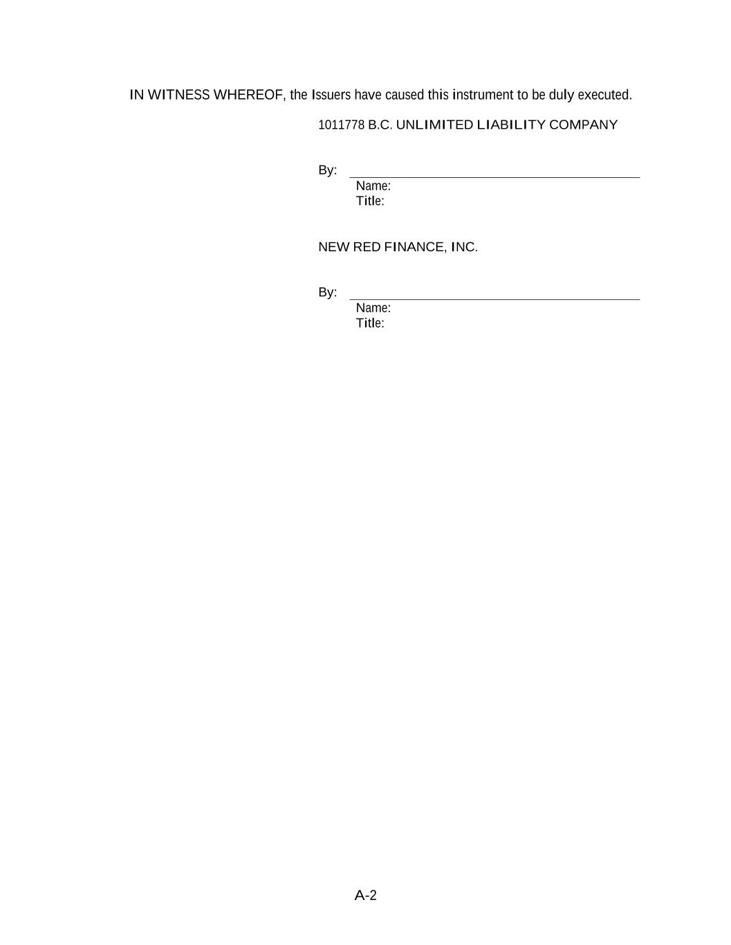 A-2 IN WITNESS WHEREOF, the Issuers have caused this instrument to be duly executed. 1011778 B.C. UNLIMITED LIABILITY COMPANY By: Name: Title: NEW RED FINANCE, INC. By: Name: Title: