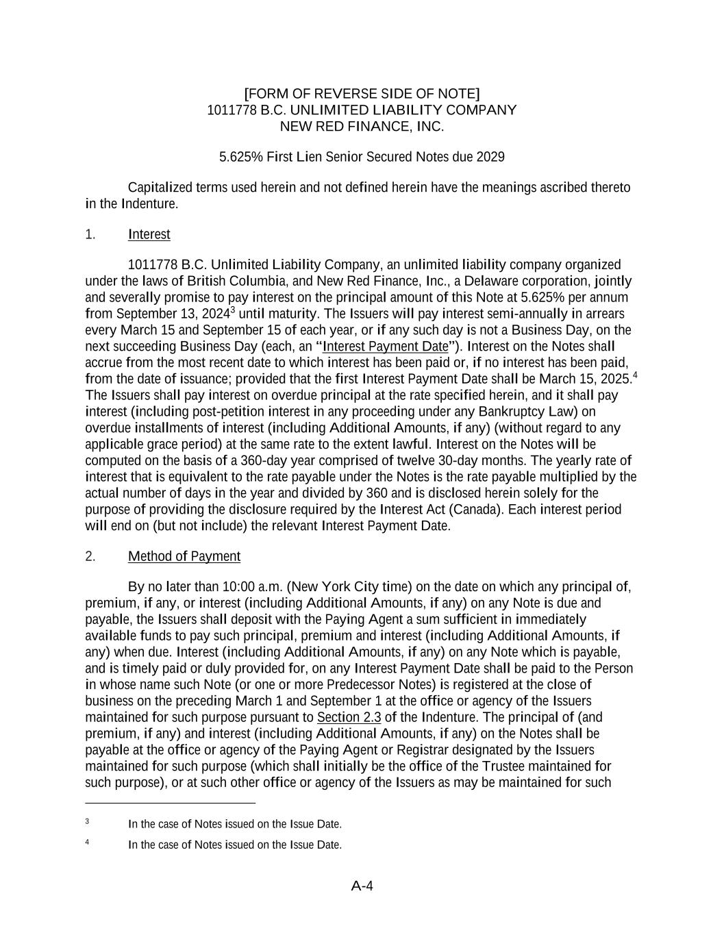 A-4 [FORM OF REVERSE SIDE OF NOTE] 1011778 B.C. UNLIMITED LIABILITY COMPANY NEW RED FINANCE, INC. 5.625% First Lien Senior Secured Notes due 2029 Capitalized terms used herein and not defined herein have the meanings ascribed thereto in the Indenture. 1. Interest 1011778 B.C. Unlimited Liability Company, an unlimited liability company organized under the laws of British Columbia, and New Red Finance, Inc., a Delaware corporation, jointly and severally promise to pay interest on the principal amount of this Note at 5.625% per annum from September 13, 20243 until maturity. The Issuers will pay interest semi-annually in arrears every March 15 and September 15 of each year, or if any such day is not a Business Day, on the next succeeding Business Day (each, an “Interest Payment Date”). Interest on the Notes shall accrue from the most recent date to which interest has been paid or, if no interest has been paid, from the date of issuance; provided that the first Interest Payment Date shall be March 15, 2025.4 The Issuers shall pay interest on overdue principal at the rate specified herein, and it shall pay interest (including post-petition interest in any proceeding under any Bankruptcy Law) on overdue installments of interest (including Additional Amounts, if any) (without regard to any applicable grace period) at the same rate to the extent lawful. Interest on the Notes will be computed on the basis of a 360-day year comprised of twelve 30-day months. The yearly rate of interest that is equivalent to the rate payable under the Notes is the rate payable multiplied by the actual number of days in the year and divided by 360 and is disclosed herein solely for the purpose of providing the disclosure required by the Interest Act (Canada). Each interest period will end on (but not include) the relevant Interest Payment Date. 2. Method of Payment By no later than 10:00 a.m. (New York City time) on the date on which any principal of, premium, if any, or interest (including Additional Amounts, if any) on any Note is due and payable, the Issuers shall deposit with the Paying Agent a sum sufficient in immediately available funds to pay such principal, premium and interest (including Additional Amounts, if any) when due. Interest (including Additional Amounts, if any) on any Note which is payable, and is timely paid or duly provided for, on any Interest Payment Date shall be paid to the Person in whose name such Note (or one or more Predecessor Notes) is registered at the close of business on the preceding March 1 and September 1 at the office or agency of the Issuers maintained for such purpose pursuant to Section 2.3 of the Indenture. The principal of (and premium, if any) and interest (including Additional Amounts, if any) on the Notes shall be payable at the office or agency of the Paying Agent or Registrar designated by the Issuers maintained for such purpose (which shall initially be the office of the Trustee maintained for such purpose), or at such other office or agency of the Issuers as may be maintained for such 3 In the case of Notes issued on the Issue Date. 4 In the case of Notes issued on the Issue Date.