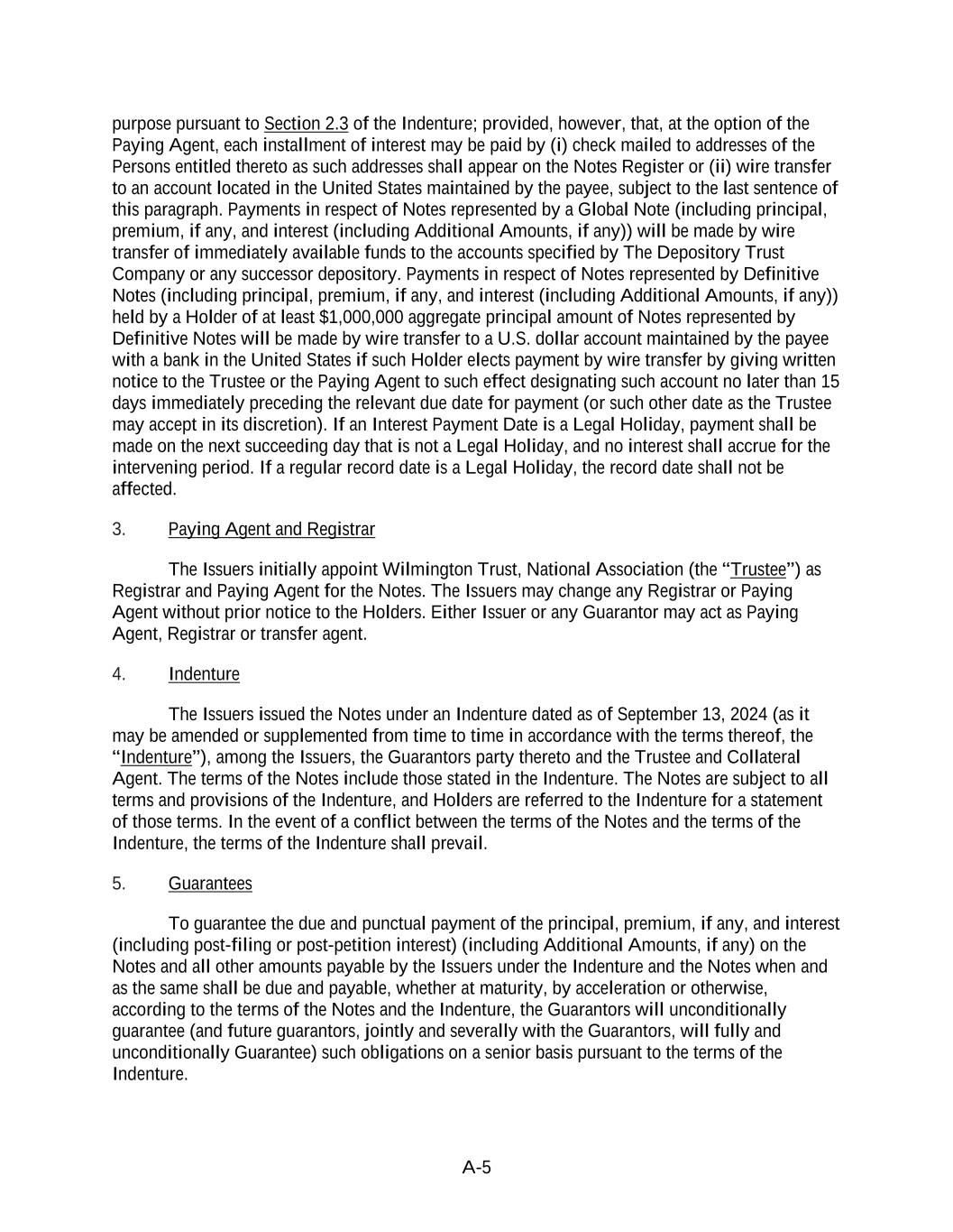 A-5 purpose pursuant to Section 2.3 of the Indenture; provided, however, that, at the option of the Paying Agent, each installment of interest may be paid by (i) check mailed to addresses of the Persons entitled thereto as such addresses shall appear on the Notes Register or (ii) wire transfer to an account located in the United States maintained by the payee, subject to the last sentence of this paragraph. Payments in respect of Notes represented by a Global Note (including principal, premium, if any, and interest (including Additional Amounts, if any)) will be made by wire transfer of immediately available funds to the accounts specified by The Depository Trust Company or any successor depository. Payments in respect of Notes represented by Definitive Notes (including principal, premium, if any, and interest (including Additional Amounts, if any)) held by a Holder of at least $1,000,000 aggregate principal amount of Notes represented by Definitive Notes will be made by wire transfer to a U.S. dollar account maintained by the payee with a bank in the United States if such Holder elects payment by wire transfer by giving written notice to the Trustee or the Paying Agent to such effect designating such account no later than 15 days immediately preceding the relevant due date for payment (or such other date as the Trustee may accept in its discretion). If an Interest Payment Date is a Legal Holiday, payment shall be made on the next succeeding day that is not a Legal Holiday, and no interest shall accrue for the intervening period. If a regular record date is a Legal Holiday, the record date shall not be affected. 3. Paying Agent and Registrar The Issuers initially appoint Wilmington Trust, National Association (the “Trustee”) as Registrar and Paying Agent for the Notes. The Issuers may change any Registrar or Paying Agent without prior notice to the Holders. Either Issuer or any Guarantor may act as Paying Agent, Registrar or transfer agent. 4. Indenture The Issuers issued the Notes under an Indenture dated as of September 13, 2024 (as it may be amended or supplemented from time to time in accordance with the terms thereof, the “Indenture”), among the Issuers, the Guarantors party thereto and the Trustee and Collateral Agent. The terms of the Notes include those stated in the Indenture. The Notes are subject to all terms and provisions of the Indenture, and Holders are referred to the Indenture for a statement of those terms. In the event of a conflict between the terms of the Notes and the terms of the Indenture, the terms of the Indenture shall prevail. 5. Guarantees To guarantee the due and punctual payment of the principal, premium, if any, and interest (including post-filing or post-petition interest) (including Additional Amounts, if any) on the Notes and all other amounts payable by the Issuers under the Indenture and the Notes when and as the same shall be due and payable, whether at maturity, by acceleration or otherwise, according to the terms of the Notes and the Indenture, the Guarantors will unconditionally guarantee (and future guarantors, jointly and severally with the Guarantors, will fully and unconditionally Guarantee) such obligations on a senior basis pursuant to the terms of the Indenture.