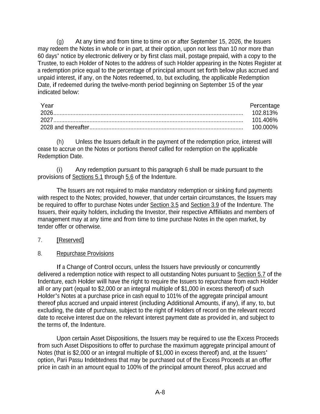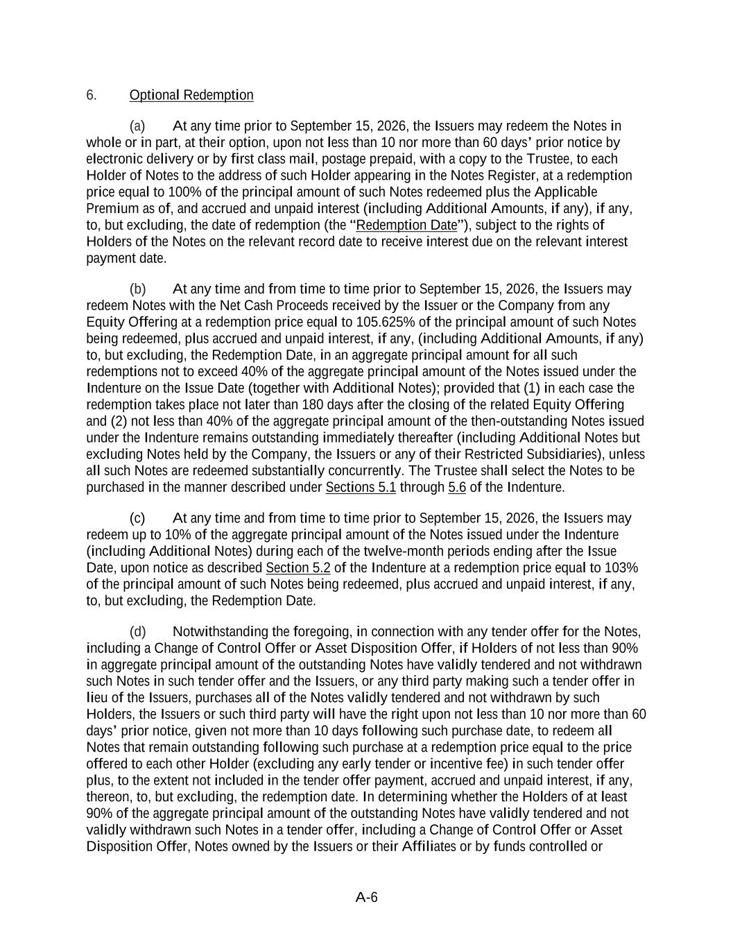 A-6 6. Optional Redemption (a) At any time prior to September 15, 2026, the Issuers may redeem the Notes in whole or in part, at their option, upon not less than 10 nor more than 60 days’ prior notice by electronic delivery or by first class mail, postage prepaid, with a copy to the Trustee, to each Holder of Notes to the address of such Holder appearing in the Notes Register, at a redemption price equal to 100% of the principal amount of such Notes redeemed plus the Applicable Premium as of, and accrued and unpaid interest (including Additional Amounts, if any), if any, to, but excluding, the date of redemption (the “Redemption Date”), subject to the rights of Holders of the Notes on the relevant record date to receive interest due on the relevant interest payment date. (b) At any time and from time to time prior to September 15, 2026, the Issuers may redeem Notes with the Net Cash Proceeds received by the Issuer or the Company from any Equity Offering at a redemption price equal to 105.625% of the principal amount of such Notes being redeemed, plus accrued and unpaid interest, if any, (including Additional Amounts, if any) to, but excluding, the Redemption Date, in an aggregate principal amount for all such redemptions not to exceed 40% of the aggregate principal amount of the Notes issued under the Indenture on the Issue Date (together with Additional Notes); provided that (1) in each case the redemption takes place not later than 180 days after the closing of the related Equity Offering and (2) not less than 40% of the aggregate principal amount of the then-outstanding Notes issued under the Indenture remains outstanding immediately thereafter (including Additional Notes but excluding Notes held by the Company, the Issuers or any of their Restricted Subsidiaries), unless all such Notes are redeemed substantially concurrently. The Trustee shall select the Notes to be purchased in the manner described under Sections 5.1 through 5.6 of the Indenture. (c) At any time and from time to time prior to September 15, 2026, the Issuers may redeem up to 10% of the aggregate principal amount of the Notes issued under the Indenture (including Additional Notes) during each of the twelve-month periods ending after the Issue Date, upon notice as described Section 5.2 of the Indenture at a redemption price equal to 103% of the principal amount of such Notes being redeemed, plus accrued and unpaid interest, if any, to, but excluding, the Redemption Date. (d) Notwithstanding the foregoing, in connection with any tender offer for the Notes, including a Change of Control Offer or Asset Disposition Offer, if Holders of not less than 90% in aggregate principal amount of the outstanding Notes have validly tendered and not withdrawn such Notes in such tender offer and the Issuers, or any third party making such a tender offer in lieu of the Issuers, purchases all of the Notes validly tendered and not withdrawn by such Holders, the Issuers or such third party will have the right upon not less than 10 nor more than 60 days’ prior notice, given not more than 10 days following such purchase date, to redeem all Notes that remain outstanding following such purchase at a redemption price equal to the price offered to each other Holder (excluding any early tender or incentive fee) in such tender offer plus, to the extent not included in the tender offer payment, accrued and unpaid interest, if any, thereon, to, but excluding, the redemption date. In determining whether the Holders of at least 90% of the aggregate principal amount of the outstanding Notes have validly tendered and not validly withdrawn such Notes in a tender offer, including a Change of Control Offer or Asset Disposition Offer, Notes owned by the Issuers or their Affiliates or by funds controlled or