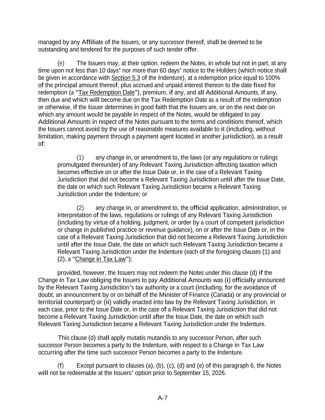 A-7 managed by any Affiliate of the Issuers, or any successor thereof, shall be deemed to be outstanding and tendered for the purposes of such tender offer. (e) The Issuers may, at their option, redeem the Notes, in whole but not in part, at any time upon not less than 10 days’ nor more than 60 days’ notice to the Holders (which notice shall be given in accordance with Section 5.3 of the Indenture), at a redemption price equal to 100% of the principal amount thereof, plus accrued and unpaid interest thereon to the date fixed for redemption (a “Tax Redemption Date”), premium, if any, and all Additional Amounts, if any, then due and which will become due on the Tax Redemption Date as a result of the redemption or otherwise, if the Issuer determines in good faith that the Issuers are, or on the next date on which any amount would be payable in respect of the Notes, would be obligated to pay Additional Amounts in respect of the Notes pursuant to the terms and conditions thereof, which the Issuers cannot avoid by the use of reasonable measures available to it (including, without limitation, making payment through a payment agent located in another jurisdiction), as a result of: (1) any change in, or amendment to, the laws (or any regulations or rulings promulgated thereunder) of any Relevant Taxing Jurisdiction affecting taxation which becomes effective on or after the Issue Date or, in the case of a Relevant Taxing Jurisdiction that did not become a Relevant Taxing Jurisdiction until after the Issue Date, the date on which such Relevant Taxing Jurisdiction became a Relevant Taxing Jurisdiction under the Indenture; or (2) any change in, or amendment to, the official application, administration, or interpretation of the laws, regulations or rulings of any Relevant Taxing Jurisdiction (including by virtue of a holding, judgment, or order by a court of competent jurisdiction or change in published practice or revenue guidance), on or after the Issue Date or, in the case of a Relevant Taxing Jurisdiction that did not become a Relevant Taxing Jurisdiction until after the Issue Date, the date on which such Relevant Taxing Jurisdiction became a Relevant Taxing Jurisdiction under the Indenture (each of the foregoing clauses (1) and (2), a “Change in Tax Law”); provided, however, the Issuers may not redeem the Notes under this clause (d) if the Change in Tax Law obliging the Issuers to pay Additional Amounts was (i) officially announced by the Relevant Taxing Jurisdiction’s tax authority or a court (including, for the avoidance of doubt, an announcement by or on behalf of the Minister of Finance (Canada) or any provincial or territorial counterpart) or (ii) validly enacted into law by the Relevant Taxing Jurisdiction, in each case, prior to the Issue Date or, in the case of a Relevant Taxing Jurisdiction that did not become a Relevant Taxing Jurisdiction until after the Issue Date, the date on which such Relevant Taxing Jurisdiction became a Relevant Taxing Jurisdiction under the Indenture. This clause (d) shall apply mutatis mutandis to any successor Person, after such successor Person becomes a party to the Indenture, with respect to a Change in Tax Law occurring after the time such successor Person becomes a party to the Indenture. (f) Except pursuant to clauses (a), (b), (c), (d) and (e) of this paragraph 6, the Notes will not be redeemable at the Issuers’ option prior to September 15, 2026.