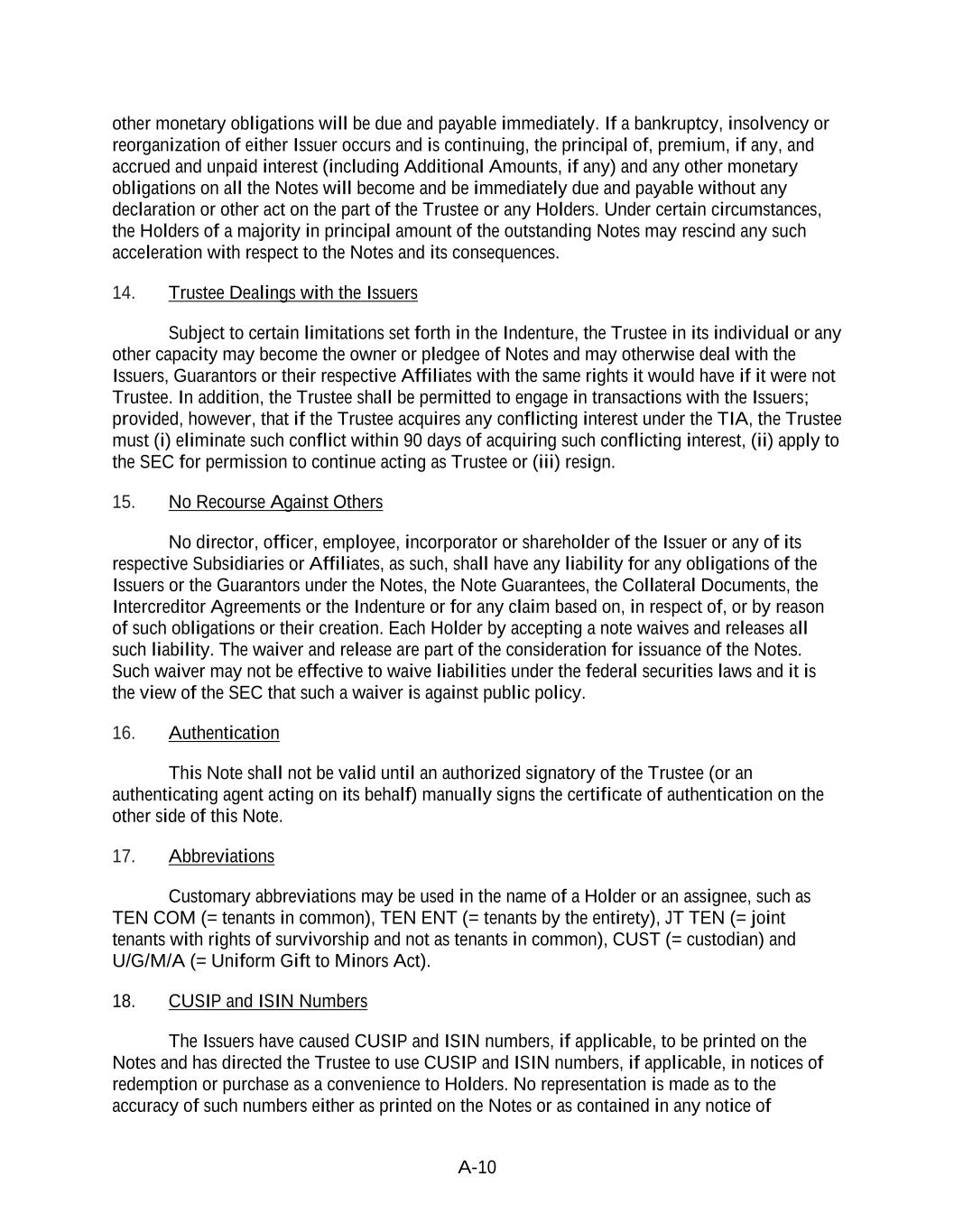 A-10 other monetary obligations will be due and payable immediately. If a bankruptcy, insolvency or reorganization of either Issuer occurs and is continuing, the principal of, premium, if any, and accrued and unpaid interest (including Additional Amounts, if any) and any other monetary obligations on all the Notes will become and be immediately due and payable without any declaration or other act on the part of the Trustee or any Holders. Under certain circumstances, the Holders of a majority in principal amount of the outstanding Notes may rescind any such acceleration with respect to the Notes and its consequences. 14. Trustee Dealings with the Issuers Subject to certain limitations set forth in the Indenture, the Trustee in its individual or any other capacity may become the owner or pledgee of Notes and may otherwise deal with the Issuers, Guarantors or their respective Affiliates with the same rights it would have if it were not Trustee. In addition, the Trustee shall be permitted to engage in transactions with the Issuers; provided, however, that if the Trustee acquires any conflicting interest under the TIA, the Trustee must (i) eliminate such conflict within 90 days of acquiring such conflicting interest, (ii) apply to the SEC for permission to continue acting as Trustee or (iii) resign. 15. No Recourse Against Others No director, officer, employee, incorporator or shareholder of the Issuer or any of its respective Subsidiaries or Affiliates, as such, shall have any liability for any obligations of the Issuers or the Guarantors under the Notes, the Note Guarantees, the Collateral Documents, the Intercreditor Agreements or the Indenture or for any claim based on, in respect of, or by reason of such obligations or their creation. Each Holder by accepting a note waives and releases all such liability. The waiver and release are part of the consideration for issuance of the Notes. Such waiver may not be effective to waive liabilities under the federal securities laws and it is the view of the SEC that such a waiver is against public policy. 16. Authentication This Note shall not be valid until an authorized signatory of the Trustee (or an authenticating agent acting on its behalf) manually signs the certificate of authentication on the other side of this Note. 17. Abbreviations Customary abbreviations may be used in the name of a Holder or an assignee, such as TEN COM (= tenants in common), TEN ENT (= tenants by the entirety), JT TEN (= joint tenants with rights of survivorship and not as tenants in common), CUST (= custodian) and U/G/M/A (= Uniform Gift to Minors Act). 18. CUSIP and ISIN Numbers The Issuers have caused CUSIP and ISIN numbers, if applicable, to be printed on the Notes and has directed the Trustee to use CUSIP and ISIN numbers, if applicable, in notices of redemption or purchase as a convenience to Holders. No representation is made as to the accuracy of such numbers either as printed on the Notes or as contained in any notice of