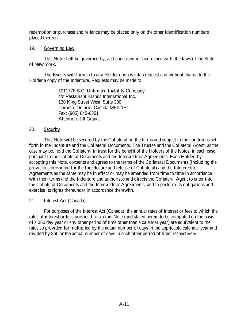 A-11 redemption or purchase and reliance may be placed only on the other identification numbers placed thereon. 19. Governing Law This Note shall be governed by, and construed in accordance with, the laws of the State of New York. The Issuers will furnish to any Holder upon written request and without charge to the Holder a copy of the Indenture. Requests may be made to: 1011778 B.C. Unlimited Liability Company c/o Restaurant Brands International Inc. 130 King Street West, Suite 300 Toronto, Ontario, Canada M5X 1E1 Fax: (905) 845-6351 Attention: Jill Granat 20. Security This Note will be secured by the Collateral on the terms and subject to the conditions set forth in the Indenture and the Collateral Documents. The Trustee and the Collateral Agent, as the case may be, hold the Collateral in trust for the benefit of the Holders of the Notes, in each case pursuant to the Collateral Documents and the Intercreditor Agreements. Each Holder, by accepting this Note, consents and agrees to the terms of the Collateral Documents (including the provisions providing for the foreclosure and release of Collateral) and the Intercreditor Agreements as the same may be in effect or may be amended from time to time in accordance with their terms and the Indenture and authorizes and directs the Collateral Agent to enter into the Collateral Documents and the Intercreditor Agreements, and to perform its obligations and exercise its rights thereunder in accordance therewith. 21. Interest Act (Canada) For purposes of the Interest Act (Canada), the annual rates of interest or fees to which the rates of interest or fees provided for in this Note (and stated herein to be computed on the basis of a 360 day year or any other period of time other than a calendar year) are equivalent to the rates so provided for multiplied by the actual number of days in the applicable calendar year and divided by 360 or the actual number of days in such other period of time, respectively.