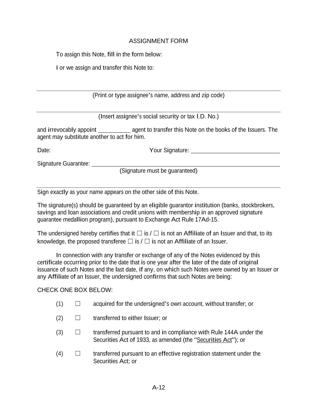 A-12 ASSIGNMENT FORM To assign this Note, fill in the form below: I or we assign and transfer this Note to: (Print or type assignee’s name, address and zip code) (Insert assignee’s social security or tax I.D. No.) and irrevocably appoint agent to transfer this Note on the books of the Issuers. The agent may substitute another to act for him. Date: Your Signature: Signature Guarantee: (Signature must be guaranteed) Sign exactly as your name appears on the other side of this Note. The signature(s) should be guaranteed by an eligible guarantor institution (banks, stockbrokers, savings and loan associations and credit unions with membership in an approved signature guarantee medallion program), pursuant to Exchange Act Rule 17Ad-15. The undersigned hereby certifies that it ☐ is / ☐ is not an Affiliate of an Issuer and that, to its knowledge, the proposed transferee ☐ is / ☐ is not an Affiliate of an Issuer. In connection with any transfer or exchange of any of the Notes evidenced by this certificate occurring prior to the date that is one year after the later of the date of original issuance of such Notes and the last date, if any, on which such Notes were owned by an Issuer or any Affiliate of an Issuer, the undersigned confirms that such Notes are being: CHECK ONE BOX BELOW: (1) ☐ acquired for the undersigned’s own account, without transfer; or (2) ☐ transferred to either Issuer; or (3) ☐ transferred pursuant to and in compliance with Rule 144A under the Securities Act of 1933, as amended (the “Securities Act”); or (4) ☐ transferred pursuant to an effective registration statement under the Securities Act; or
