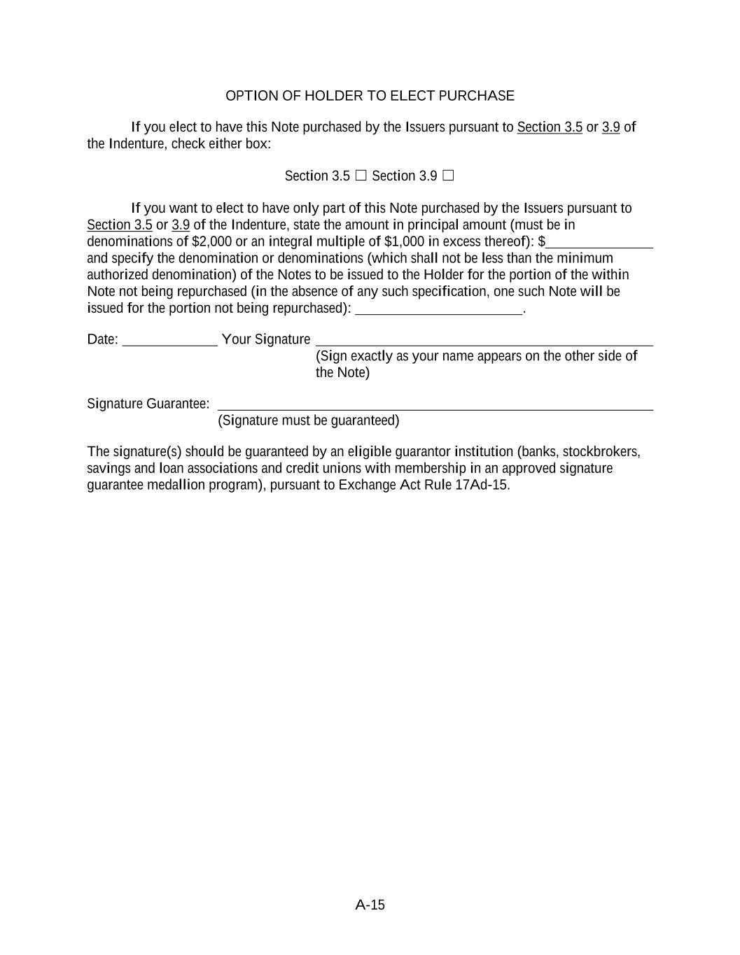 A-15 OPTION OF HOLDER TO ELECT PURCHASE If you elect to have this Note purchased by the Issuers pursuant to Section 3.5 or 3.9 of the Indenture, check either box: Section 3.5 ☐ Section 3.9 ☐ If you want to elect to have only part of this Note purchased by the Issuers pursuant to Section 3.5 or 3.9 of the Indenture, state the amount in principal amount (must be in denominations of $2,000 or an integral multiple of $1,000 in excess thereof): $ and specify the denomination or denominations (which shall not be less than the minimum authorized denomination) of the Notes to be issued to the Holder for the portion of the within Note not being repurchased (in the absence of any such specification, one such Note will be issued for the portion not being repurchased): . Date: Your Signature (Sign exactly as your name appears on the other side of the Note) Signature Guarantee: (Signature must be guaranteed) The signature(s) should be guaranteed by an eligible guarantor institution (banks, stockbrokers, savings and loan associations and credit unions with membership in an approved signature guarantee medallion program), pursuant to Exchange Act Rule 17Ad-15.