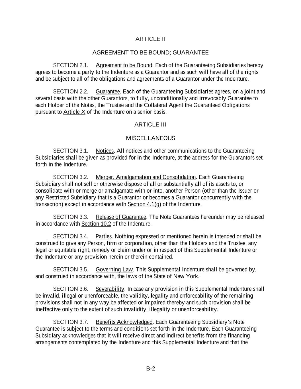 B-2 ARTICLE II AGREEMENT TO BE BOUND; GUARANTEE SECTION 2.1. Agreement to be Bound. Each of the Guaranteeing Subsidiaries hereby agrees to become a party to the Indenture as a Guarantor and as such will have all of the rights and be subject to all of the obligations and agreements of a Guarantor under the Indenture. SECTION 2.2. Guarantee. Each of the Guaranteeing Subsidiaries agrees, on a joint and several basis with the other Guarantors, to fully, unconditionally and irrevocably Guarantee to each Holder of the Notes, the Trustee and the Collateral Agent the Guaranteed Obligations pursuant to Article X of the Indenture on a senior basis. ARTICLE III MISCELLANEOUS SECTION 3.1. Notices. All notices and other communications to the Guaranteeing Subsidiaries shall be given as provided for in the Indenture, at the address for the Guarantors set forth in the Indenture. SECTION 3.2. Merger, Amalgamation and Consolidation. Each Guaranteeing Subsidiary shall not sell or otherwise dispose of all or substantially all of its assets to, or consolidate with or merge or amalgamate with or into, another Person (other than the Issuer or any Restricted Subsidiary that is a Guarantor or becomes a Guarantor concurrently with the transaction) except in accordance with Section 4.1(g) of the Indenture. SECTION 3.3. Release of Guarantee. The Note Guarantees hereunder may be released in accordance with Section 10.2 of the Indenture. SECTION 3.4. Parties. Nothing expressed or mentioned herein is intended or shall be construed to give any Person, firm or corporation, other than the Holders and the Trustee, any legal or equitable right, remedy or claim under or in respect of this Supplemental Indenture or the Indenture or any provision herein or therein contained. SECTION 3.5. Governing Law. This Supplemental Indenture shall be governed by, and construed in accordance with, the laws of the State of New York. SECTION 3.6. Severability. In case any provision in this Supplemental Indenture shall be invalid, illegal or unenforceable, the validity, legality and enforceability of the remaining provisions shall not in any way be affected or impaired thereby and such provision shall be ineffective only to the extent of such invalidity, illegality or unenforceability. SECTION 3.7. Benefits Acknowledged. Each Guaranteeing Subsidiary’s Note Guarantee is subject to the terms and conditions set forth in the Indenture. Each Guaranteeing Subsidiary acknowledges that it will receive direct and indirect benefits from the financing arrangements contemplated by the Indenture and this Supplemental Indenture and that the