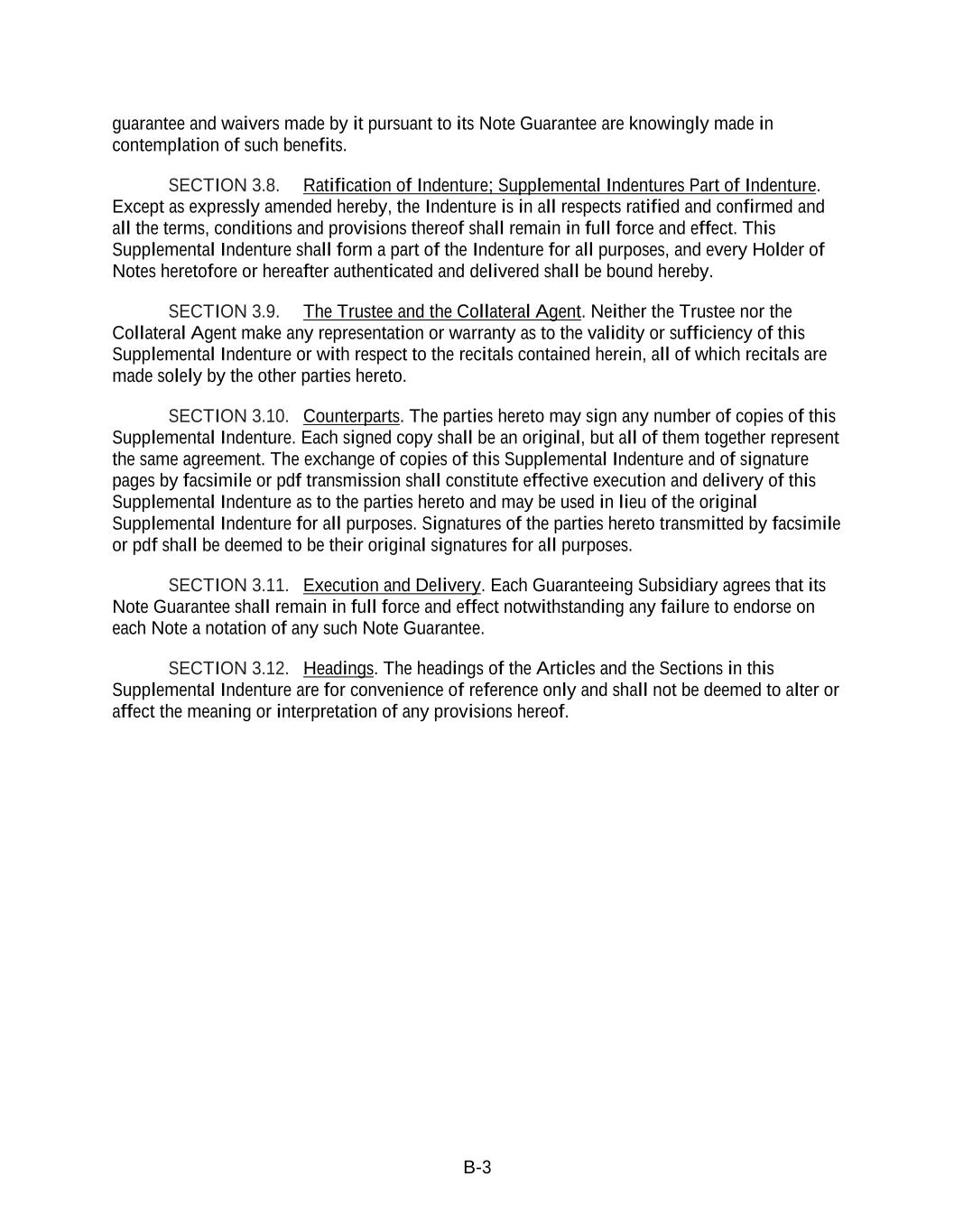 B-3 guarantee and waivers made by it pursuant to its Note Guarantee are knowingly made in contemplation of such benefits. SECTION 3.8. Ratification of Indenture; Supplemental Indentures Part of Indenture. Except as expressly amended hereby, the Indenture is in all respects ratified and confirmed and all the terms, conditions and provisions thereof shall remain in full force and effect. This Supplemental Indenture shall form a part of the Indenture for all purposes, and every Holder of Notes heretofore or hereafter authenticated and delivered shall be bound hereby. SECTION 3.9. The Trustee and the Collateral Agent. Neither the Trustee nor the Collateral Agent make any representation or warranty as to the validity or sufficiency of this Supplemental Indenture or with respect to the recitals contained herein, all of which recitals are made solely by the other parties hereto. SECTION 3.10. Counterparts. The parties hereto may sign any number of copies of this Supplemental Indenture. Each signed copy shall be an original, but all of them together represent the same agreement. The exchange of copies of this Supplemental Indenture and of signature pages by facsimile or pdf transmission shall constitute effective execution and delivery of this Supplemental Indenture as to the parties hereto and may be used in lieu of the original Supplemental Indenture for all purposes. Signatures of the parties hereto transmitted by facsimile or pdf shall be deemed to be their original signatures for all purposes. SECTION 3.11. Execution and Delivery. Each Guaranteeing Subsidiary agrees that its Note Guarantee shall remain in full force and effect notwithstanding any failure to endorse on each Note a notation of any such Note Guarantee. SECTION 3.12. Headings. The headings of the Articles and the Sections in this Supplemental Indenture are for convenience of reference only and shall not be deemed to alter or affect the meaning or interpretation of any provisions hereof.