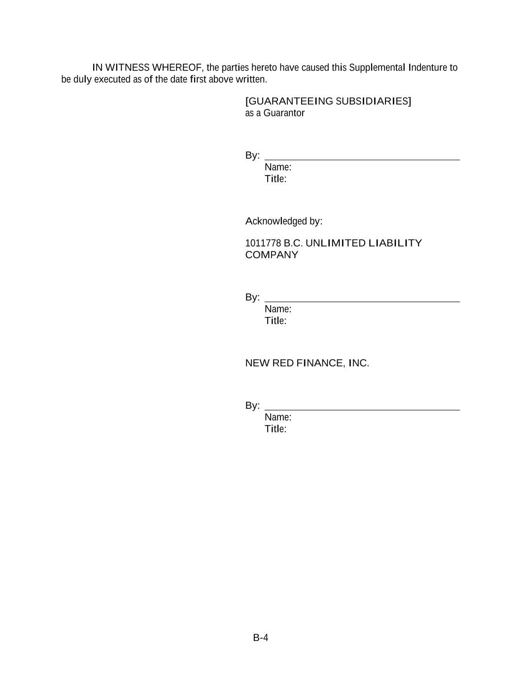 B-4 IN WITNESS WHEREOF, the parties hereto have caused this Supplemental Indenture to be duly executed as of the date first above written. [GUARANTEEING SUBSIDIARIES] as a Guarantor By: Name: Title: Acknowledged by: 1011778 B.C. UNLIMITED LIABILITY COMPANY By: Name: Title: NEW RED FINANCE, INC. By: Name: Title: