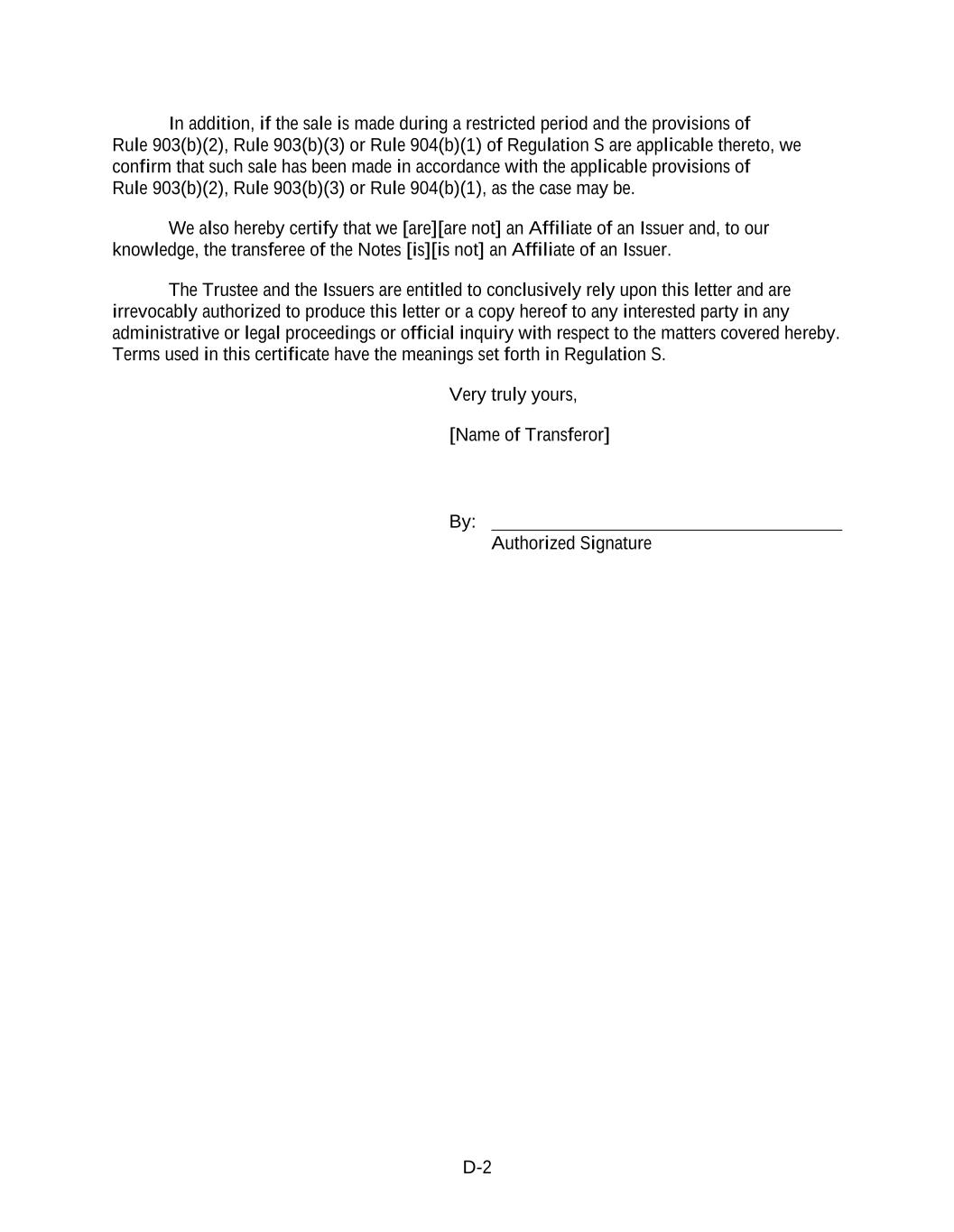D-2 In addition, if the sale is made during a restricted period and the provisions of Rule 903(b)(2), Rule 903(b)(3) or Rule 904(b)(1) of Regulation S are applicable thereto, we confirm that such sale has been made in accordance with the applicable provisions of Rule 903(b)(2), Rule 903(b)(3) or Rule 904(b)(1), as the case may be. We also hereby certify that we [are][are not] an Affiliate of an Issuer and, to our knowledge, the transferee of the Notes [is][is not] an Affiliate of an Issuer. The Trustee and the Issuers are entitled to conclusively rely upon this letter and are irrevocably authorized to produce this letter or a copy hereof to any interested party in any administrative or legal proceedings or official inquiry with respect to the matters covered hereby. Terms used in this certificate have the meanings set forth in Regulation S. Very truly yours, [Name of Transferor] By: Authorized Signature