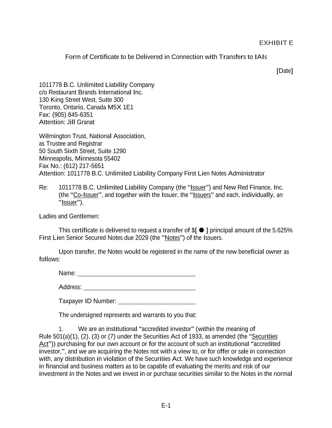 E-1 EXHIBIT E Form of Certificate to be Delivered in Connection with Transfers to IAIs [Date] 1011778 B.C. Unlimited Liability Company c/o Restaurant Brands International Inc. 130 King Street West, Suite 300 Toronto, Ontario, Canada M5X 1E1 Fax: (905) 845-6351 Attention: Jill Granat Wilmington Trust, National Association, as Trustee and Registrar 50 South Sixth Street, Suite 1290 Minneapolis, Minnesota 55402 Fax No.: (612) 217-5651 Attention: 1011778 B.C. Unlimited Liability Company First Lien Notes Administrator Re: 1011778 B.C. Unlimited Liability Company (the “Issuer”) and New Red Finance, Inc. (the “Co-Issuer”, and together with the Issuer, the “Issuers” and each, individually, an “Issuer”). Ladies and Gentlemen: This certificate is delivered to request a transfer of $[ ] principal amount of the 5.625% First Lien Senior Secured Notes due 2029 (the “Notes”) of the Issuers. Upon transfer, the Notes would be registered in the name of the new beneficial owner as follows: Name: Address: Taxpayer ID Number: The undersigned represents and warrants to you that: 1. We are an institutional “accredited investor” (within the meaning of Rule 501(a)(1), (2), (3) or (7) under the Securities Act of 1933, as amended (the “Securities Act”)) purchasing for our own account or for the account of such an institutional “accredited investor,”, and we are acquiring the Notes not with a view to, or for offer or sale in connection with, any distribution in violation of the Securities Act. We have such knowledge and experience in financial and business matters as to be capable of evaluating the merits and risk of our investment in the Notes and we invest in or purchase securities similar to the Notes in the normal