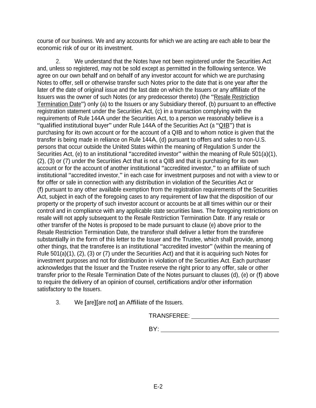 E-2 course of our business. We and any accounts for which we are acting are each able to bear the economic risk of our or its investment. 2. We understand that the Notes have not been registered under the Securities Act and, unless so registered, may not be sold except as permitted in the following sentence. We agree on our own behalf and on behalf of any investor account for which we are purchasing Notes to offer, sell or otherwise transfer such Notes prior to the date that is one year after the later of the date of original issue and the last date on which the Issuers or any affiliate of the Issuers was the owner of such Notes (or any predecessor thereto) (the “Resale Restriction Termination Date”) only (a) to the Issuers or any Subsidiary thereof, (b) pursuant to an effective registration statement under the Securities Act, (c) in a transaction complying with the requirements of Rule 144A under the Securities Act, to a person we reasonably believe is a “qualified institutional buyer” under Rule 144A of the Securities Act (a “QIB”) that is purchasing for its own account or for the account of a QIB and to whom notice is given that the transfer is being made in reliance on Rule 144A, (d) pursuant to offers and sales to non-U.S. persons that occur outside the United States within the meaning of Regulation S under the Securities Act, (e) to an institutional “accredited investor” within the meaning of Rule 501(a)(1), (2), (3) or (7) under the Securities Act that is not a QIB and that is purchasing for its own account or for the account of another institutional “accredited investor,” to an affiliate of such institutional “accredited investor,” in each case for investment purposes and not with a view to or for offer or sale in connection with any distribution in violation of the Securities Act or (f) pursuant to any other available exemption from the registration requirements of the Securities Act, subject in each of the foregoing cases to any requirement of law that the disposition of our property or the property of such investor account or accounts be at all times within our or their control and in compliance with any applicable state securities laws. The foregoing restrictions on resale will not apply subsequent to the Resale Restriction Termination Date. If any resale or other transfer of the Notes is proposed to be made pursuant to clause (e) above prior to the Resale Restriction Termination Date, the transferor shall deliver a letter from the transferee substantially in the form of this letter to the Issuer and the Trustee, which shall provide, among other things, that the transferee is an institutional “accredited investor” (within the meaning of Rule 501(a)(1), (2), (3) or (7) under the Securities Act) and that it is acquiring such Notes for investment purposes and not for distribution in violation of the Securities Act. Each purchaser acknowledges that the Issuer and the Trustee reserve the right prior to any offer, sale or other transfer prior to the Resale Termination Date of the Notes pursuant to clauses (d), (e) or (f) above to require the delivery of an opinion of counsel, certifications and/or other information satisfactory to the Issuers. 3. We [are][are not] an Affiliate of the Issuers. TRANSFEREE: BY: