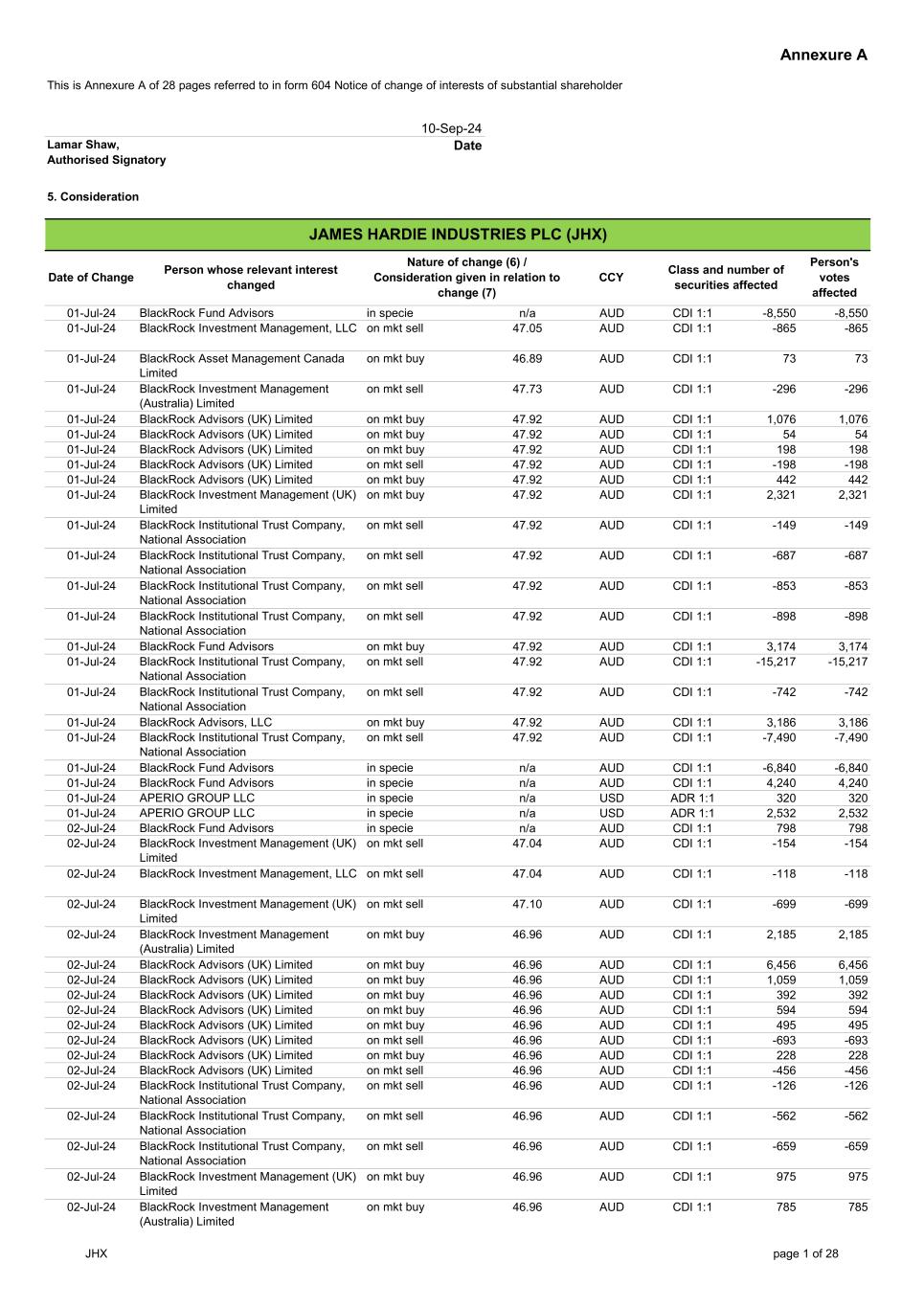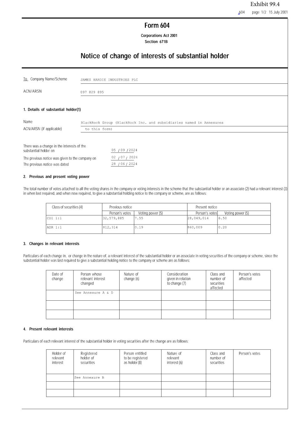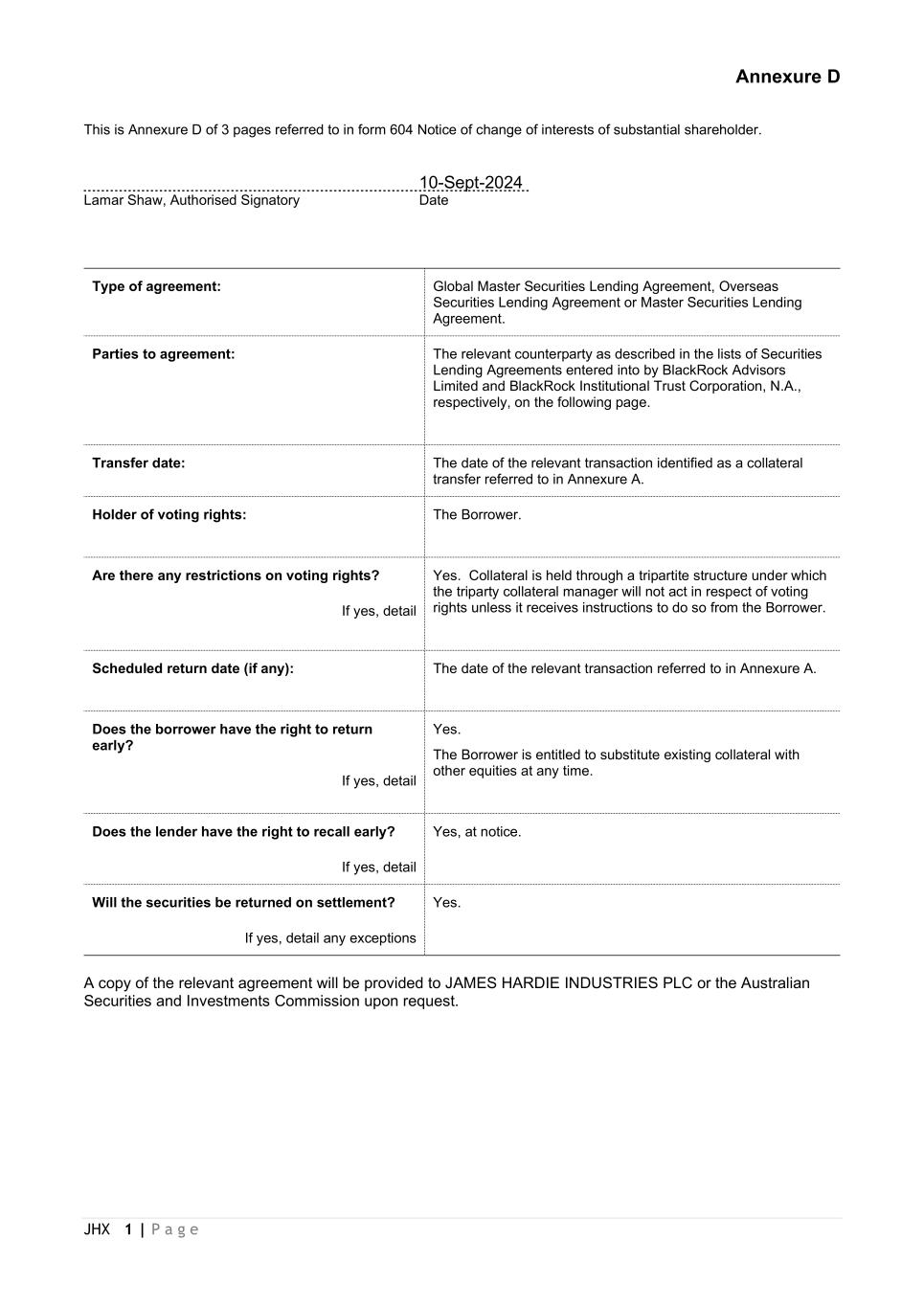 Forward-looking statements are based on the Company’s current expectations, estimates and assumptions and because forward-looking statements address future results, events and conditions, they, by their very nature, involve inherent risks and uncertainties, many of which are unforeseeable and beyond the Company’s control. Such known and unknown risks, uncertainties and other factors may cause actual results, performance or other achievements to differ materially from the anticipated results, performance or achievements expressed, projected or implied by these forward-looking statements. These factors, some of which are discussed under “Risk Factors” in Section 3 of the Form 20-F filed with the Securities and Exchange Commission on 20 May 2024, include, but are not limited to: all matters relating to or arising out of the prior manufacture of products that contained asbestos by current and former Company subsidiaries; required contributions to AICF, any shortfall in AICF funding and the effect of currency exchange rate movements on the amount recorded in the Company’s financial statements as an asbestos liability; compliance with and changes in tax laws and treatments; competition and product pricing in the markets in which the Company operates; the consequences of product failures or defects; exposure to environmental, asbestos, putative consumer class action or other legal proceedings; general economic and market conditions; the supply and cost of raw materials; possible increases in competition and the potential that competitors could copy the Company’s products; compliance with and changes in environmental and health and safety laws; risks of conducting business internationally; compliance with and changes in laws and regulations; currency exchange risks; dependence on customer preference and the concentration of the Company’s customer base; dependence on residential and commercial construction markets; the effect of adverse changes in climate or weather patterns; use of accounting estimates; and all other risks identified in the Company’s reports filed with Australian, Irish and US securities regulatory agencies and exchanges (as appropriate). The Company cautions you that the foregoing list of factors is not exhaustive and that other risks and uncertainties may cause actual results to differ materially from those referenced in the Company’s forward-looking statements. Forward-looking statements speak only as of the date they are made and are statements of the Company’s current expectations concerning future results, events and conditions. The Company assumes no obligation to update any forward-looking statements or information except as required by law.