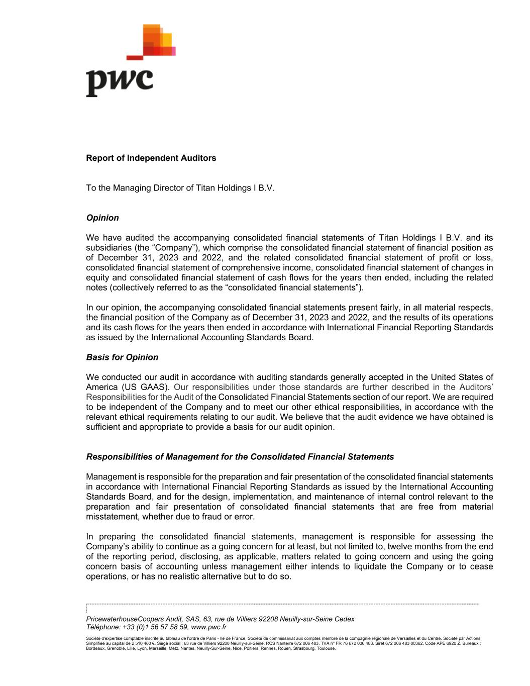 PricewaterhouseCoopers Audit, SAS, 63, rue de Villiers 92208 Neuilly-sur-Seine Cedex Téléphone: +33 (0)1 56 57 58 59, www.pwc.fr Société d'expertise comptable inscrite au tableau de l'ordre de Paris - Ile de France. Société de commissariat aux comptes membre de la compagnie régionale de Versailles et du Centre. Société par Actions Simplifiée au capital de 2 510 460 €. Siège social : 63 rue de Villiers 92200 Neuilly-sur-Seine. RCS Nanterre 672 006 483. TVA n° FR 76 672 006 483. Siret 672 006 483 00362. Code APE 6920 Z. Bureaux : Bordeaux, Grenoble, Lille, Lyon, Marseille, Metz, Nantes, Neuilly-Sur-Seine, Nice, Poitiers, Rennes, Rouen, Strasbourg, Toulouse. Report of Independent Auditors To the Managing Director of Titan Holdings I B.V. Opinion We have audited the accompanying consolidated financial statements of Titan Holdings I B.V. and its subsidiaries (the “Company”), which comprise the consolidated financial statement of financial position as of December 31, 2023 and 2022, and the related consolidated financial statement of profit or loss, consolidated financial statement of comprehensive income, consolidated financial statement of changes in equity and consolidated financial statement of cash flows for the years then ended, including the related notes (collectively referred to as the “consolidated financial statements”). In our opinion, the accompanying consolidated financial statements present fairly, in all material respects, the financial position of the Company as of December 31, 2023 and 2022, and the results of its operations and its cash flows for the years then ended in accordance with International Financial Reporting Standards as issued by the International Accounting Standards Board. Basis for Opinion We conducted our audit in accordance with auditing standards generally accepted in the United States of America (US GAAS). Our responsibilities under those standards are further described in the Auditors’ Responsibilities for the Audit of the Consolidated Financial Statements section of our report. We are required to be independent of the Company and to meet our other ethical responsibilities, in accordance with the relevant ethical requirements relating to our audit. We believe that the audit evidence we have obtained is sufficient and appropriate to provide a basis for our audit opinion. Responsibilities of Management for the Consolidated Financial Statements Management is responsible for the preparation and fair presentation of the consolidated financial statements in accordance with International Financial Reporting Standards as issued by the International Accounting Standards Board, and for the design, implementation, and maintenance of internal control relevant to the preparation and fair presentation of consolidated financial statements that are free from material misstatement, whether due to fraud or error. In preparing the consolidated financial statements, management is responsible for assessing the Company’s ability to continue as a going concern for at least, but not limited to, twelve months from the end of the reporting period, disclosing, as applicable, matters related to going concern and using the going concern basis of accounting unless management either intends to liquidate the Company or to cease operations, or has no realistic alternative but to do so.