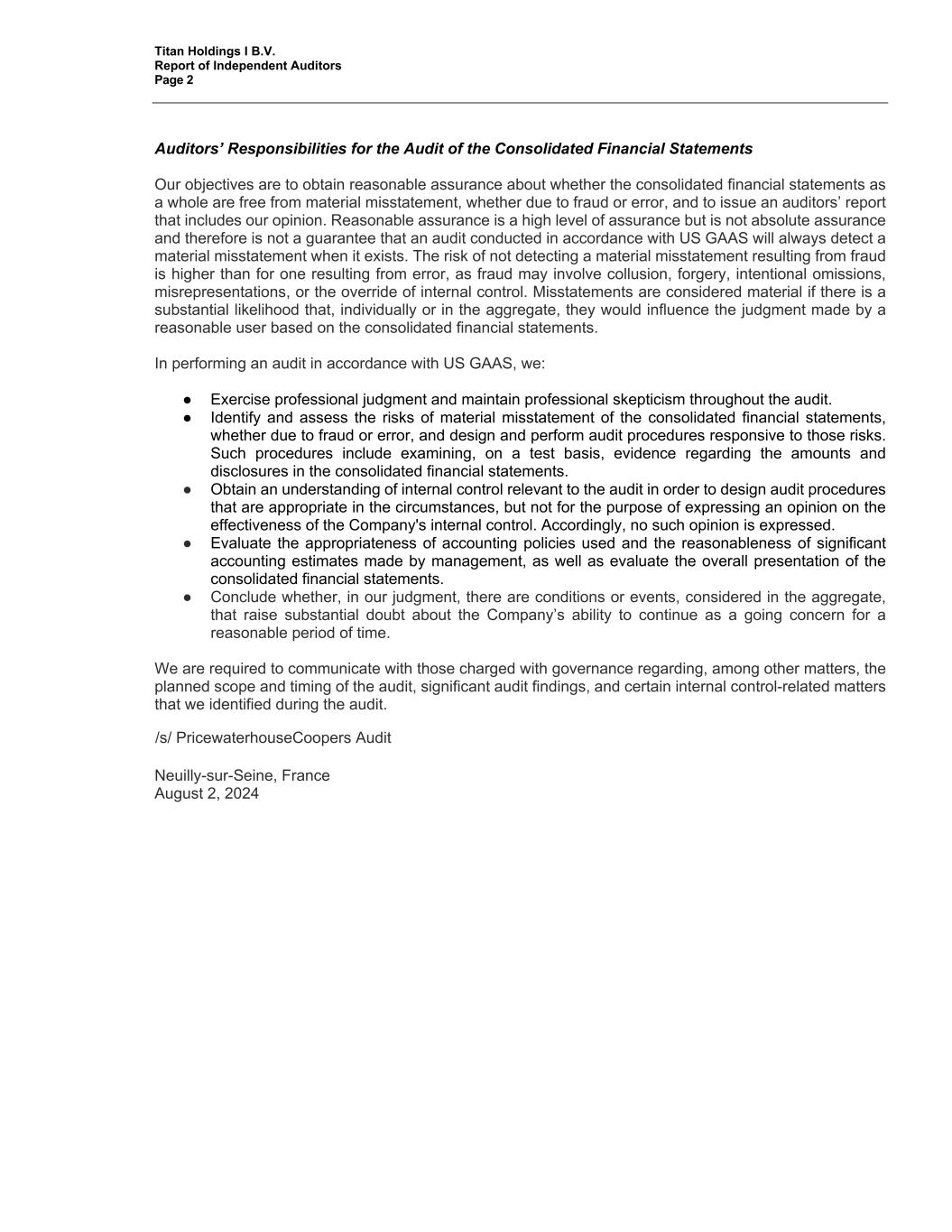 Titan Holdings I B.V. Report of Independent Auditors Page 2 Auditors’ Responsibilities for the Audit of the Consolidated Financial Statements Our objectives are to obtain reasonable assurance about whether the consolidated financial statements as a whole are free from material misstatement, whether due to fraud or error, and to issue an auditors’ report that includes our opinion. Reasonable assurance is a high level of assurance but is not absolute assurance and therefore is not a guarantee that an audit conducted in accordance with US GAAS will always detect a material misstatement when it exists. The risk of not detecting a material misstatement resulting from fraud is higher than for one resulting from error, as fraud may involve collusion, forgery, intentional omissions, misrepresentations, or the override of internal control. Misstatements are considered material if there is a substantial likelihood that, individually or in the aggregate, they would influence the judgment made by a reasonable user based on the consolidated financial statements. In performing an audit in accordance with US GAAS, we: ● Exercise professional judgment and maintain professional skepticism throughout the audit. ● Identify and assess the risks of material misstatement of the consolidated financial statements, whether due to fraud or error, and design and perform audit procedures responsive to those risks. Such procedures include examining, on a test basis, evidence regarding the amounts and disclosures in the consolidated financial statements. ● Obtain an understanding of internal control relevant to the audit in order to design audit procedures that are appropriate in the circumstances, but not for the purpose of expressing an opinion on the effectiveness of the Company's internal control. Accordingly, no such opinion is expressed. ● Evaluate the appropriateness of accounting policies used and the reasonableness of significant accounting estimates made by management, as well as evaluate the overall presentation of the consolidated financial statements. ● Conclude whether, in our judgment, there are conditions or events, considered in the aggregate, that raise substantial doubt about the Company’s ability to continue as a going concern for a reasonable period of time. We are required to communicate with those charged with governance regarding, among other matters, the planned scope and timing of the audit, significant audit findings, and certain internal control-related matters that we identified during the audit. Neuilly-sur-Seine, France August 2, 2024 /s/ PricewaterhouseCoopers Audit