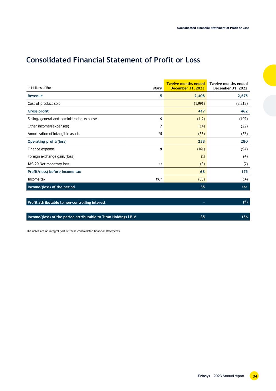 Eviosys 2023 Annual report 04 Consolidated Financial Statement of Profit or Loss Consolidated Financial Statement of Profit or Loss in Millions of Eur Note Twelve months ended December 31, 2023 Twelve months ended December 31, 2022 Revenue 5 2,408 2,675 Cost of product sold (1,991) (2,213) Gross profit 417 462 Selling, general and administration expenses 6 (112) (107) Other income/(expenses) 7 (14) (22) Amortization of intangible assets 18 (53) (53) Operating profit/(loss) 238 280 Finance expense 8 (161) (94) Foreign exchange gain/(loss) (1) (4) IAS 29 Net monetary loss 11 (8) (7) Profit/(loss) before income tax 68 175 Income tax 19.1 (33) (14) Income/(loss) of the period 35 161 Profit attributable to non‑controlling interest - (5) Income/(loss) of the period attributable to Titan Holdings I B.V 35 156 The notes are an integral part of these consolidated financial statements.