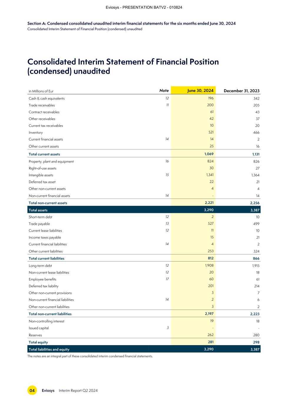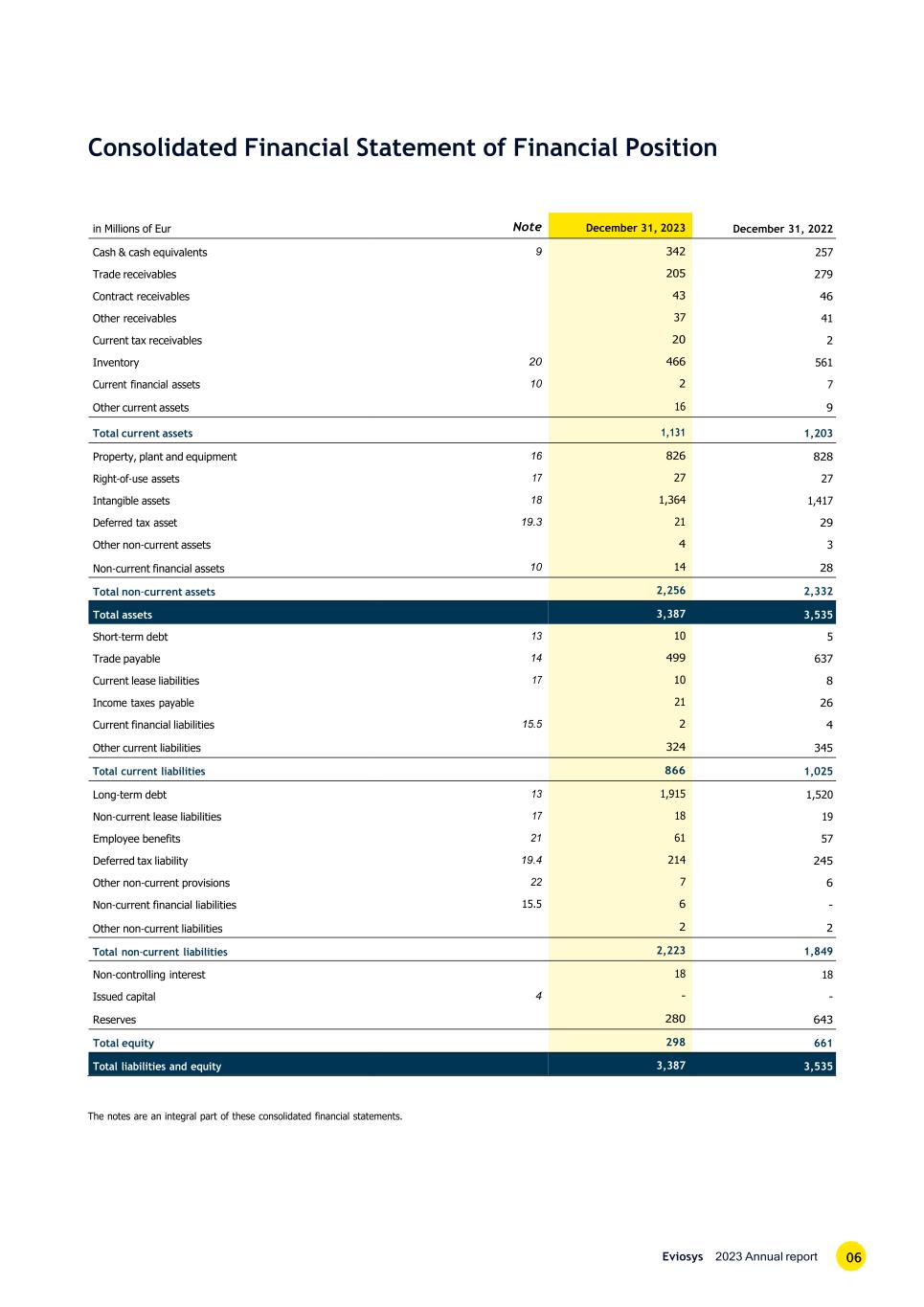 Eviosys 2023 Annual report 06 Consolidated Financial Statement of Financial Position in Millions of Eur Note December 31, 2023 December 31, 2022 Cash & cash equivalents 9 342 257 Trade receivables 205 279 Contract receivables 43 46 Other receivables 37 41 Current tax receivables 20 2 Inventory 20 466 561 Current financial assets 10 2 7 Other current assets 16 9 Total current assets 1,131 1,203 Property, plant and equipment 16 826 828 Right‑of‑use assets 17 27 27 Intangible assets 18 1,364 1,417 Deferred tax asset 19.3 21 29 Other non‑current assets 4 3 Non‑current financial assets 10 14 28 Total non‑current assets 2,256 2,332 Total assets 3,387 3,535 Short‑term debt 13 10 5 Trade payable 14 499 637 Current lease liabilities 17 10 8 Income taxes payable 21 26 Current financial liabilities 15.5 2 4 Other current liabilities 324 345 Total current liabilities 866 1,025 Long‑term debt 13 1,915 1,520 Non‑current lease liabilities 17 18 19 Employee benefits 21 61 57 Deferred tax liability 19.4 214 245 Other non‑current provisions 22 7 6 Non‑current financial liabilities 15.5 6 - Other non‑current liabilities 2 2 Total non‑current liabilities 2,223 1,849 Non‑controlling interest 18 18 Issued capital 4 - - Reserves 280 643 Total equity 298 661 Total liabilities and equity 3,387 3,535 The notes are an integral part of these consolidated financial statements.
