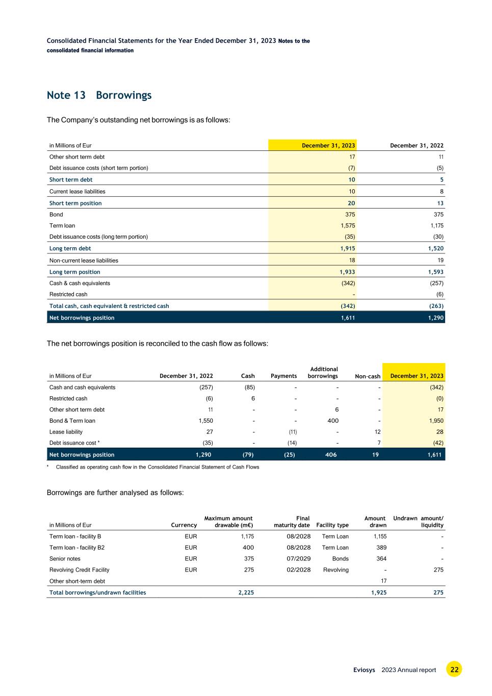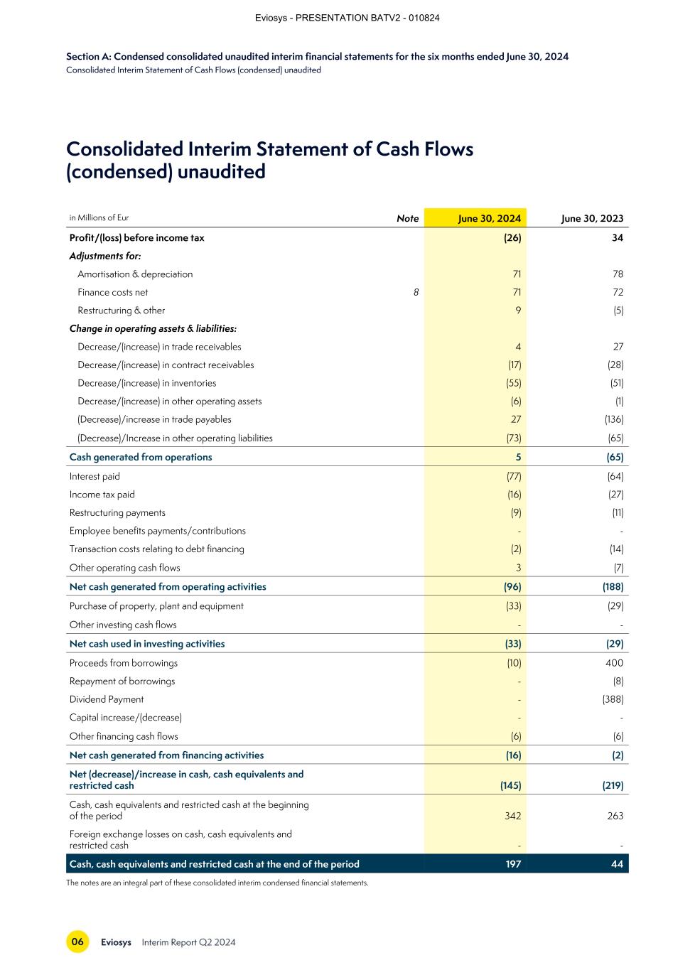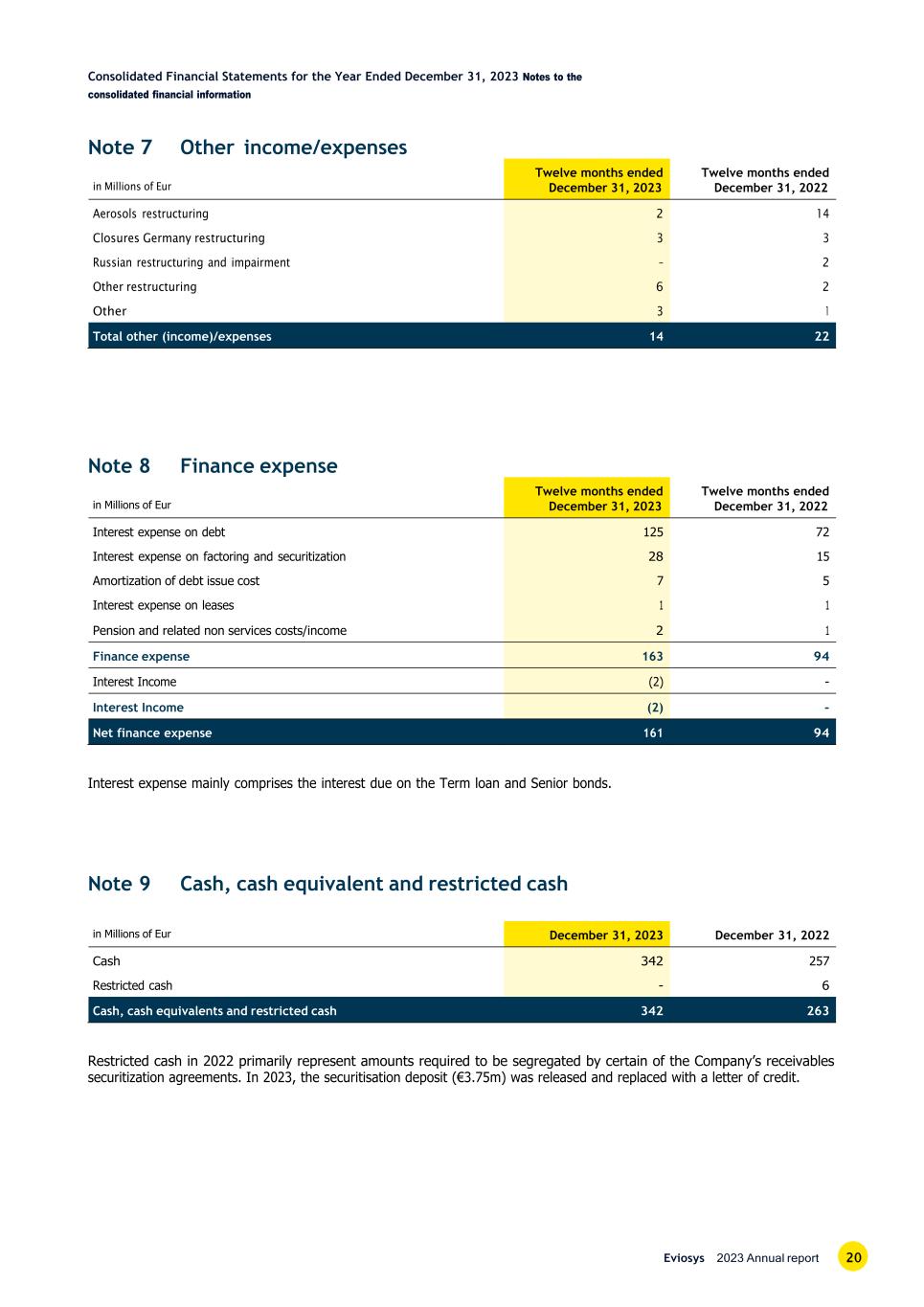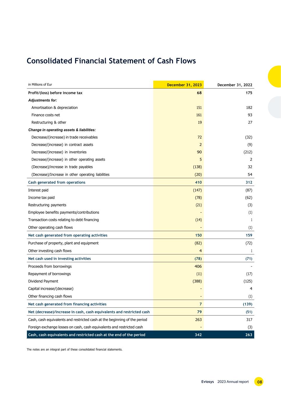 Eviosys 2023 Annual report 08 Consolidated Financial Statement of Cash Flows in Millions of Eur December 31, 2023 December 31, 2022 Profit/(loss) before income tax 68 175 Adjustments for: Amortisation & depreciation 151 182 Finance costs net 161 93 Restructuring & other 19 27 Change in operating assets & liabilities: Decrease/(increase) in trade receivables 72 (32) Decrease/(increase) in contract assets 2 (9) Decrease/(increase) in inventories 90 (212) Decrease/(increase) in other operating assets 5 2 (Decrease)/increase in trade payables (138) 32 (Decrease)/Increase in other operating liabilities (20) 54 Cash generated from operations 410 312 Interest paid (147) (87) Income tax paid (78) (62) Restructuring payments (21) (3) Employee benefits payments/contributions - (1) Transaction costs relating to debt financing (14) 1 Other operating cash flows - (1) Net cash generated from operating activities 150 159 Purchase of property, plant and equipment (82) (72) Other investing cash flows 4 1 Net cash used in investing activities (78) (71) Proceeds from borrowings 406 - Repayment of borrowings (11) (17) Dividend Payment (388) (125) Capital increase/(decrease) - 4 Other financing cash flows - (1) Net cash generated from financing activities 7 (139) Net (decrease)/increase in cash, cash equivalents and restricted cash 79 (51) Cash, cash equivalents and restricted cash at the beginning of the period 263 317 Foreign exchange losses on cash, cash equivalents and restricted cash - (3) Cash, cash equivalents and restricted cash at the end of the period 342 263 The notes are an integral part of these consolidated financial statements.