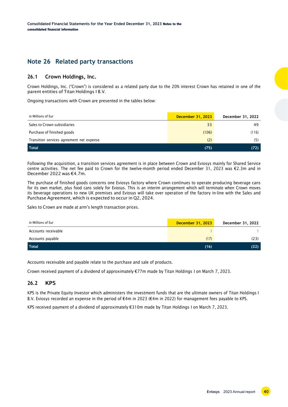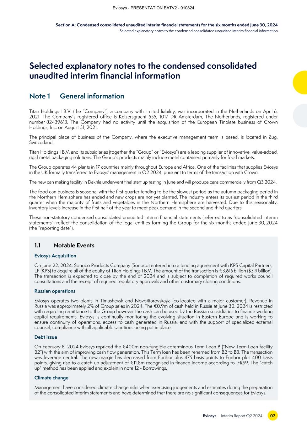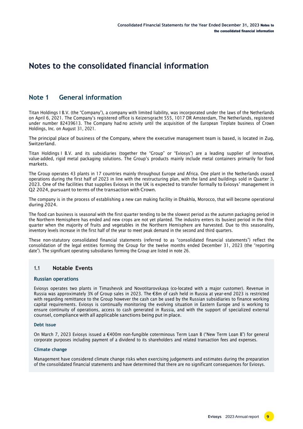 Consolidated Financial Statements for the Year Ended December 31, 2023 Notes to the consolidated financial information Eviosys 2023 Annual report 9 1.1 Notable Events Russian operations Eviosys operates two plants in Timashevsk and Novotitarovskaya (co‑located with a major customer). Revenue in Russia was approximately 3% of Group sales in 2023. The €8m of cash held in Russia at year‑end 2023 is restricted with regarding remittance to the Group however the cash can be used by the Russian subsidiaries to finance working capital requirements. Eviosys is continually monitoring the evolving situation in Eastern Europe and is working to ensure continuity of operations, access to cash generated in Russia, and with the support of specialized external counsel, compliance with all applicable sanctions being put in place. Debt issue On March 7, 2023 Eviosys issued a €400m non‑fungible coterminous Term Loan B (“New Term Loan B”) for general corporate purposes including payment of a dividend to its shareholders and related transaction fees and expenses. Climate change Management have considered climate change risks when exercising judgements and estimates during the preparation of the consolidated financial statements and have determined that there are no significant consequences for Eviosys. Notes to the consolidated financial information Note 1 General information Titan Holdings I B.V. (the “Company”), a company with limited liability, was incorporated under the laws of the Netherlands on April 6, 2021. The Company’s registered office is Keizersgracht 555, 1017 DR Amsterdam, The Netherlands, registered under number 82439613. The Company had no activity until the acquisition of the European Tinplate business of Crown Holdings, Inc. on August 31, 2021. The principal place of business of the Company, where the executive management team is based, is located in Zug, Switzerland. Titan Holdings I B.V. and its subsidiaries (together the “Group” or “Eviosys”) are a leading supplier of innovative, value‑added, rigid metal packaging solutions. The Group’s products mainly include metal containers primarily for food markets. The Group operates 43 plants in 17 countries mainly throughout Europe and Africa. One plant in the Netherlands ceased operations during the first half of 2023 in line with the restructuring plan, with the land and buildings sold in Quarter 3, 2023. One of the facilities that supplies Eviosys in the UK is expected to transfer formally to Eviosys’ management in Q2 2024, pursuant to terms of the transaction with Crown. The company is in the process of establishing a new can making facility in Dhakhla, Morocco, that will become operational during 2024. The food can business is seasonal with the first quarter tending to be the slowest period as the autumn packaging period in the Northern Hemisphere has ended and new crops are not yet planted. The industry enters its busiest period in the third quarter when the majority of fruits and vegetables in the Northern Hemisphere are harvested. Due to this seasonality, inventory levels increase in the first half of the year to meet peak demand in the second and third quarters. These non‑statutory consolidated financial statements (referred to as “consolidated financial statements”) reflect the consolidation of the legal entities forming the Group for the twelve months ended December 31, 2023 (the “reporting date”). The significant operating subsidiaries forming the Group are listed in note 26.