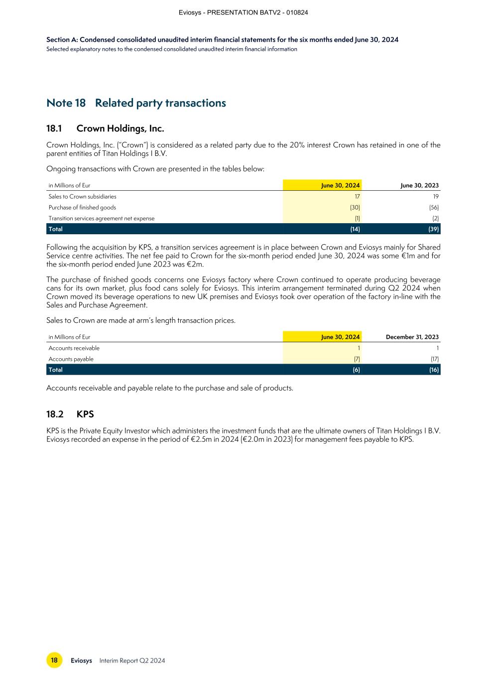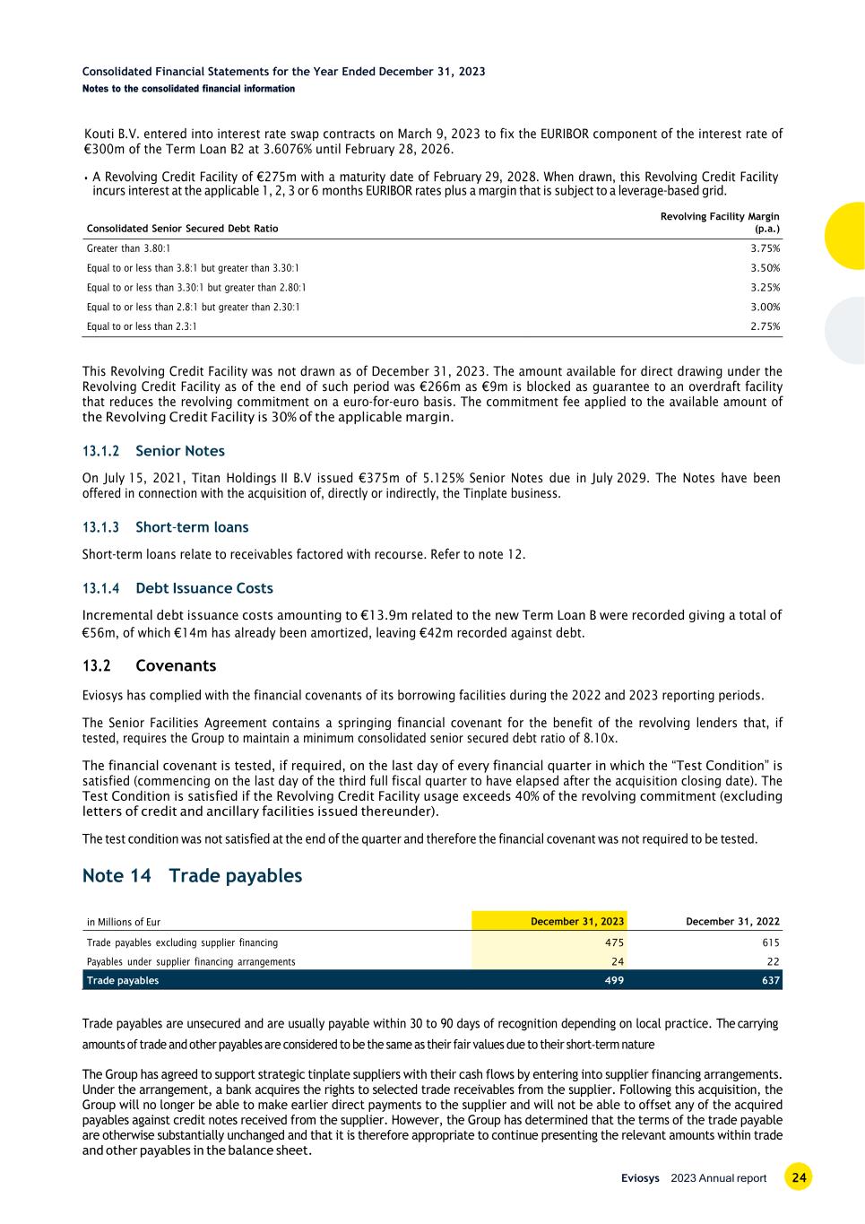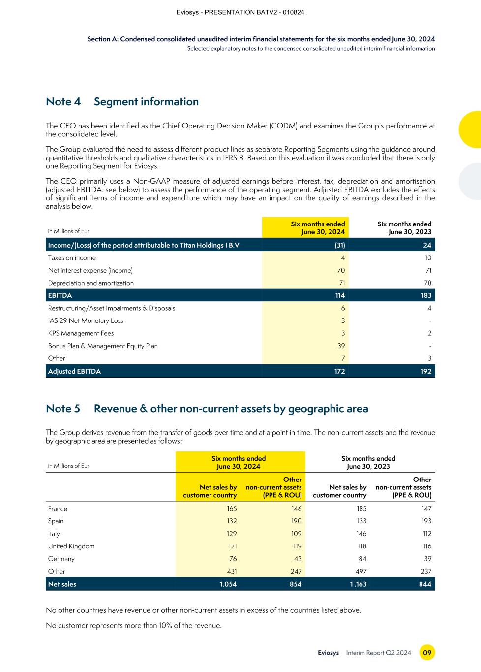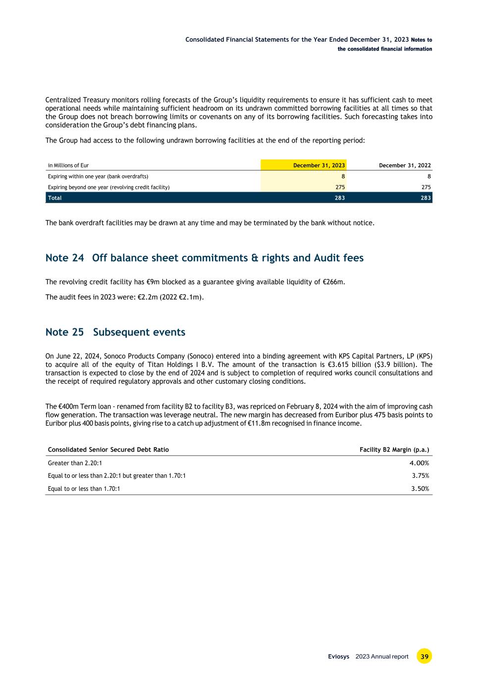Consolidated Financial Statements for the Year Ended December 31, 2023 Notes to the consolidated financial information Eviosys 2023 Annual report 9 1.1 Notable Events Russian operations Eviosys operates two plants in Timashevsk and Novotitarovskaya (co‑located with a major customer). Revenue in Russia was approximately 3% of Group sales in 2023. The €8m of cash held in Russia at year‑end 2023 is restricted with regarding remittance to the Group however the cash can be used by the Russian subsidiaries to finance working capital requirements. Eviosys is continually monitoring the evolving situation in Eastern Europe and is working to ensure continuity of operations, access to cash generated in Russia, and with the support of specialized external counsel, compliance with all applicable sanctions being put in place. Debt issue On March 7, 2023 Eviosys issued a €400m non‑fungible coterminous Term Loan B (“New Term Loan B”) for general corporate purposes including payment of a dividend to its shareholders and related transaction fees and expenses. Climate change Management have considered climate change risks when exercising judgements and estimates during the preparation of the consolidated financial statements and have determined that there are no significant consequences for Eviosys. Notes to the consolidated financial information Note 1 General information Titan Holdings I B.V. (the “Company”), a company with limited liability, was incorporated under the laws of the Netherlands on April 6, 2021. The Company’s registered office is Keizersgracht 555, 1017 DR Amsterdam, The Netherlands, registered under number 82439613. The Company had no activity until the acquisition of the European Tinplate business of Crown Holdings, Inc. on August 31, 2021. The principal place of business of the Company, where the executive management team is based, is located in Zug, Switzerland. Titan Holdings I B.V. and its subsidiaries (together the “Group” or “Eviosys”) are a leading supplier of innovative, value‑added, rigid metal packaging solutions. The Group’s products mainly include metal containers primarily for food markets. The Group operates 43 plants in 17 countries mainly throughout Europe and Africa. One plant in the Netherlands ceased operations during the first half of 2023 in line with the restructuring plan, with the land and buildings sold in Quarter 3, 2023. One of the facilities that supplies Eviosys in the UK is expected to transfer formally to Eviosys’ management in Q2 2024, pursuant to terms of the transaction with Crown. The company is in the process of establishing a new can making facility in Dhakhla, Morocco, that will become operational during 2024. The food can business is seasonal with the first quarter tending to be the slowest period as the autumn packaging period in the Northern Hemisphere has ended and new crops are not yet planted. The industry enters its busiest period in the third quarter when the majority of fruits and vegetables in the Northern Hemisphere are harvested. Due to this seasonality, inventory levels increase in the first half of the year to meet peak demand in the second and third quarters. These non‑statutory consolidated financial statements (referred to as “consolidated financial statements”) reflect the consolidation of the legal entities forming the Group for the twelve months ended December 31, 2023 (the “reporting date”). The significant operating subsidiaries forming the Group are listed in note 26.