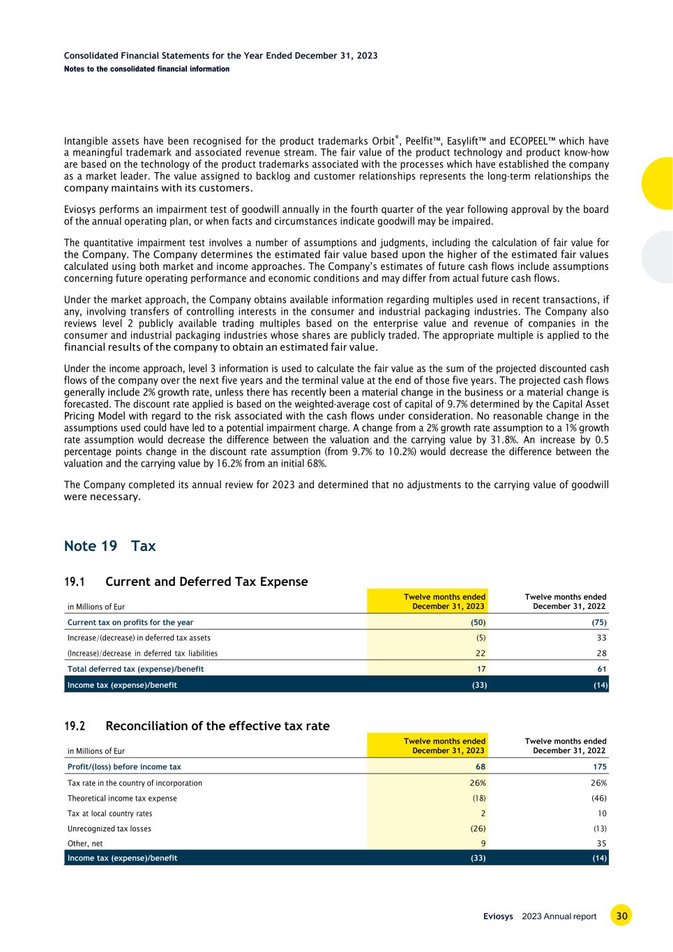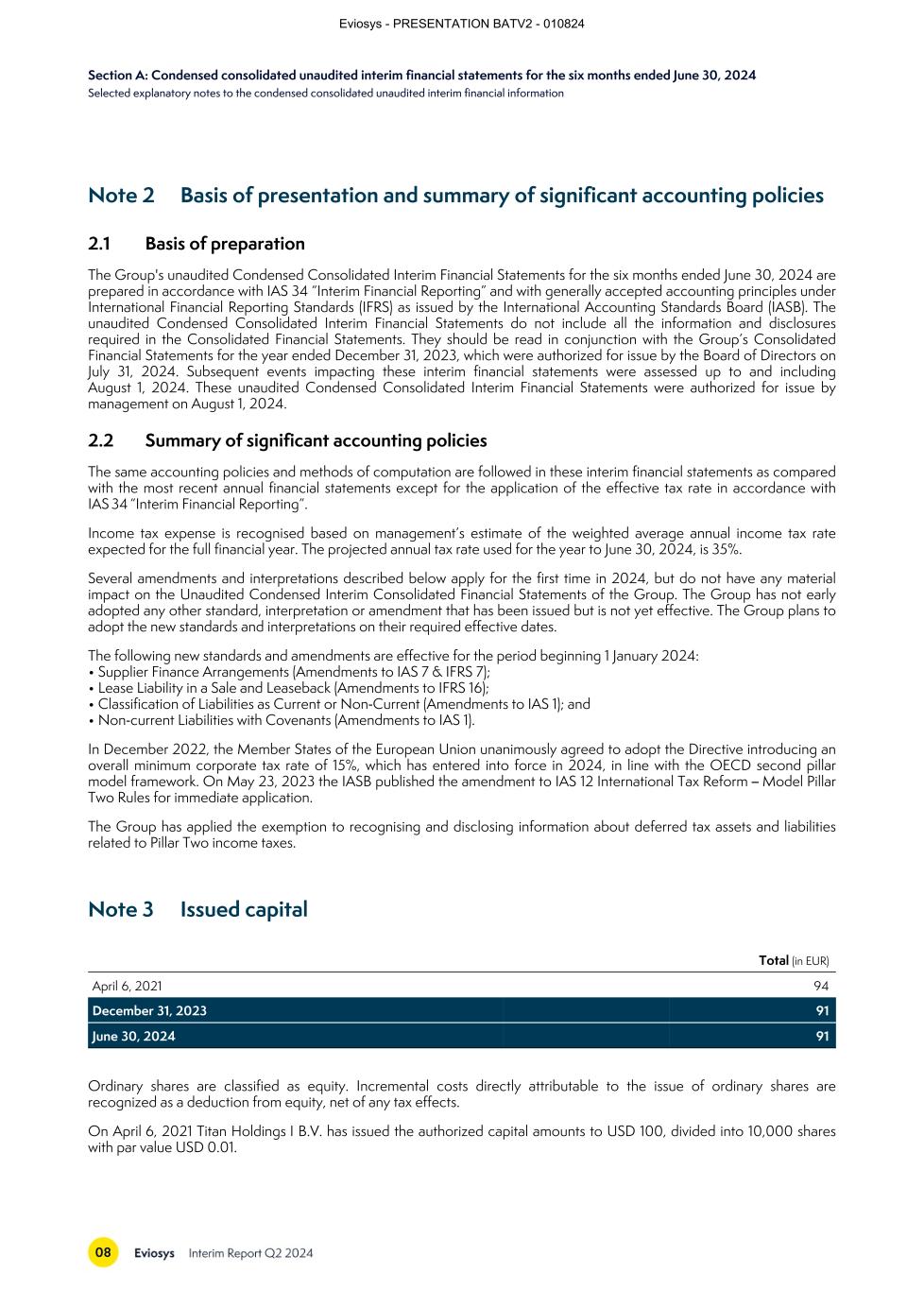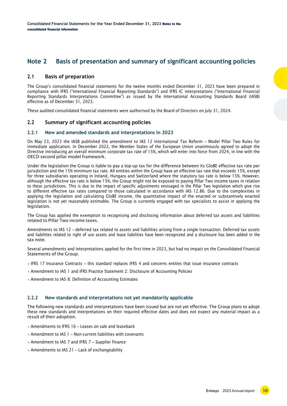 Consolidated Financial Statements for the Year Ended December 31, 2023 Notes to the consolidated financial information Eviosys 2023 Annual report 10 Note 2 Basis of presentation and summary of significant accounting policies 2.1 Basis of preparation The Group’s consolidated financial statements for the twelve months ended December 31, 2023 have been prepared in compliance with IFRS (“International Financial Reporting Standards”) and IFRS IC interpretations (“International Financial Reporting Standards Interpretations Committee”) as issued by the International Accounting Standards Board (IASB) effective as of December 31, 2023. These audited consolidated financial statements were authorised by the Board of Directors on July 31, 2024. 2.2 Summary of significant accounting policies 2.2.1 New and amended standards and interpretations in 2023 On May 23, 2023 the IASB published the amendment to IAS 12 International Tax Reform – Model Pillar Two Rules for immediate application. In December 2022, the Member States of the European Union unanimously agreed to adopt the Directive introducing an overall minimum corporate tax rate of 15%, which will enter into force from 2024, in line with the OECD second pillar model framework. Under the legislation the Group is liable to pay a top‑up tax for the difference between its GloBE effective tax rate per jurisdiction and the 15% minimum tax rate. All entities within the Group have an effective tax rate that exceeds 15%, except for three subsidiaries operating in Ireland, Hungary and Switzerland where the statutory tax rate is below 15%. However, although the effective tax rate is below 15%, the Group might not be exposed to paying Pillar Two income taxes in relation to these jurisdictions. This is due to the impact of specific adjustments envisaged in the Pillar Two legislation which give rise to different effective tax rates compared to those calculated in accordance with IAS 12.86. Due to the complexities in applying the legislation and calculating GloBE income, the quantitative impact of the enacted or substantively enacted legislation is not yet reasonably estimable. The Group is currently engaged with tax specialists to assist in applying the legislation. The Group has applied the exemption to recognising and disclosing information about deferred tax assets and liabilities related to Pillar Two income taxes. Amendments to IAS 12 – deferred tax related to assets and liabilities arising from a single transaction. Deferred tax assets and liabilities related to right of use assets and lease liabilities have been recognized and a disclosure has been added in the tax note. Several amendments and interpretations applied for the first time in 2023, but had no impact on the Consolidated Financial Statements of the Group. • IFRS 17 Insurance Contracts – this standard replaces IFRS 4 and concerns entities that issue insurance contracts • Amendment to IAS 1 and IFRS Practice Statement 2: Disclosure of Accounting Policies • Amendment to IAS 8: Definition of Accounting Estimates 2.2.2 New standards and interpretations not yet mandatorily applicable The following new standards and interpretations have been issued but are not yet effective. The Group plans to adopt these new standards and interpretations on their required effective dates and does not expect any material impact as a result of their adoption. • Amendments to IFRS 16 – Leases on sale and leaseback • Amendment to IAS 1 – Non‑current liabilities with covenants • Amendment to IAS 7 and IFRS 7 – Supplier finance • Amendments to IAS 21 – Lack of exchangeability