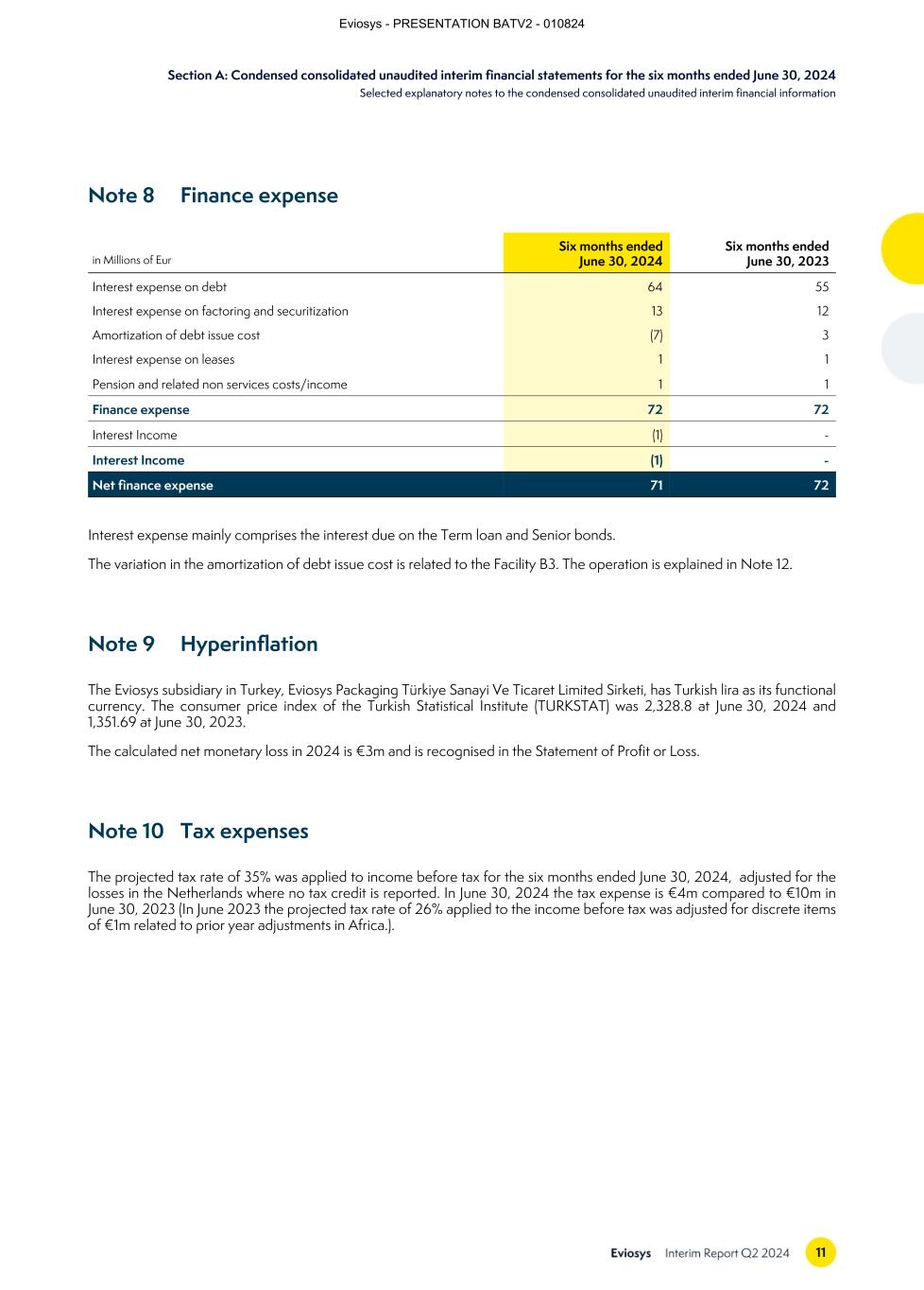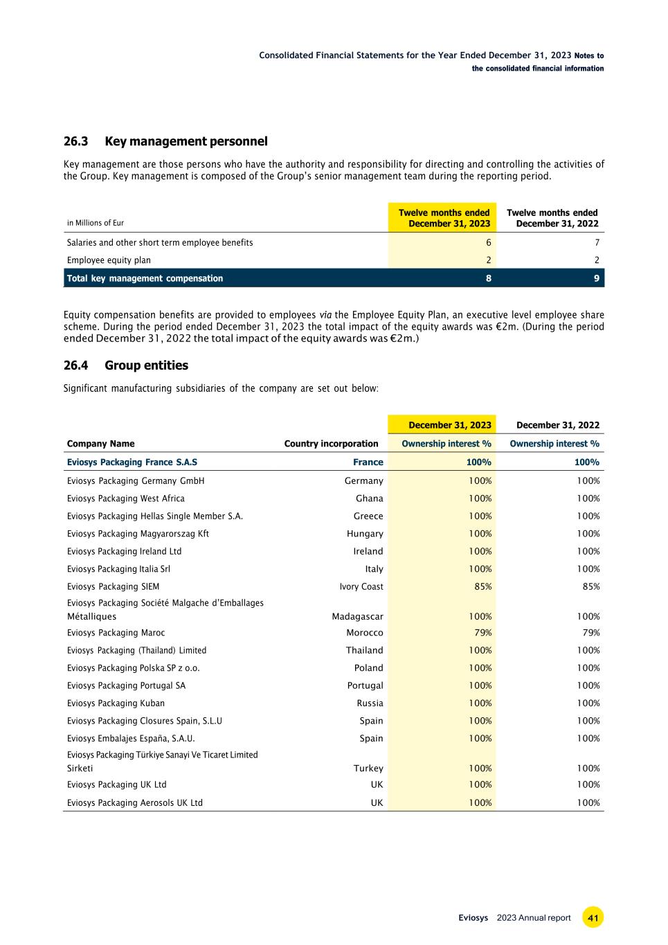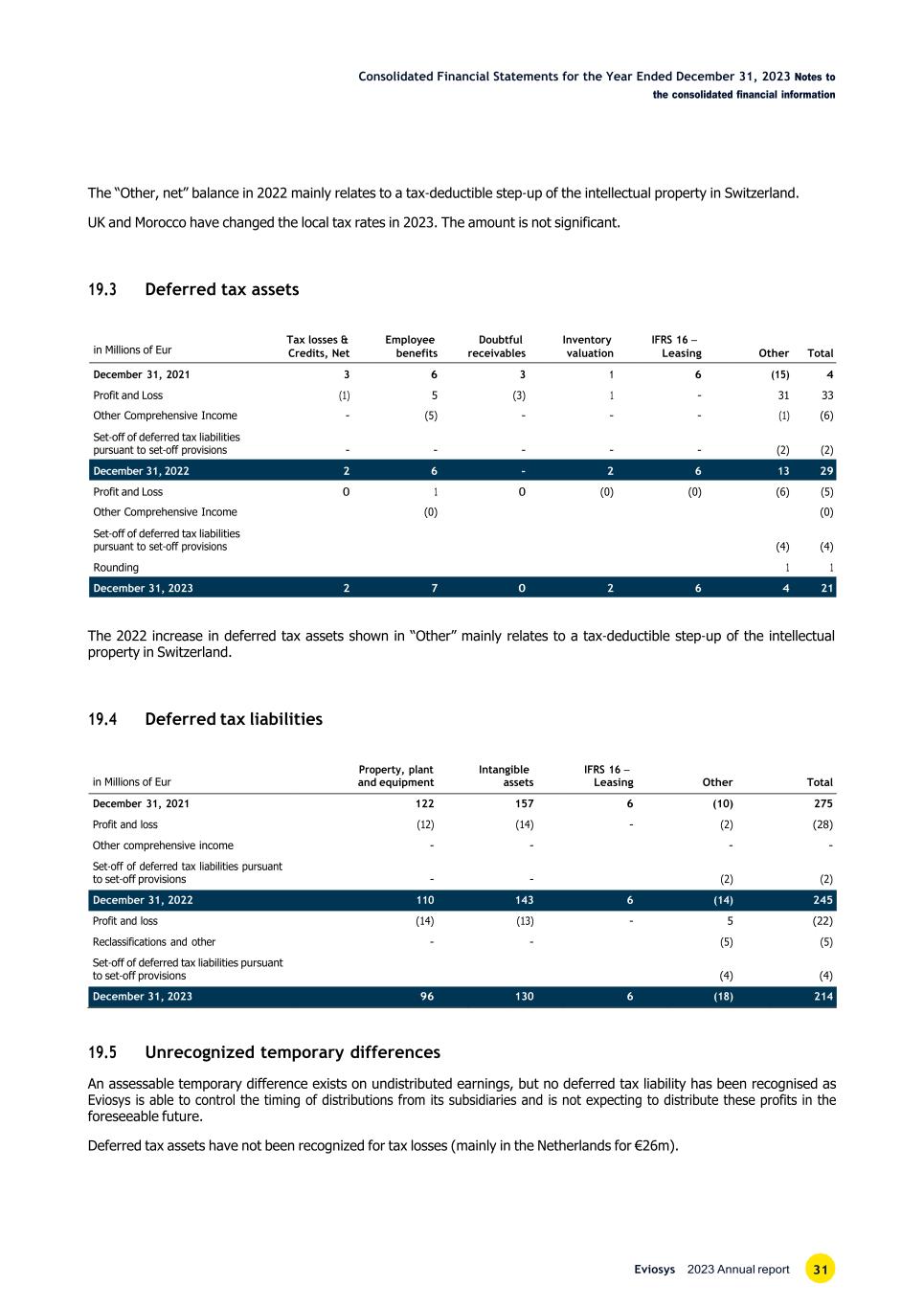 Consolidated Financial Statements for the Year Ended December 31, 2023 Notes to the consolidated financial information Eviosys 2023 Annual report 10 Note 2 Basis of presentation and summary of significant accounting policies 2.1 Basis of preparation The Group’s consolidated financial statements for the twelve months ended December 31, 2023 have been prepared in compliance with IFRS (“International Financial Reporting Standards”) and IFRS IC interpretations (“International Financial Reporting Standards Interpretations Committee”) as issued by the International Accounting Standards Board (IASB) effective as of December 31, 2023. These audited consolidated financial statements were authorised by the Board of Directors on July 31, 2024. 2.2 Summary of significant accounting policies 2.2.1 New and amended standards and interpretations in 2023 On May 23, 2023 the IASB published the amendment to IAS 12 International Tax Reform – Model Pillar Two Rules for immediate application. In December 2022, the Member States of the European Union unanimously agreed to adopt the Directive introducing an overall minimum corporate tax rate of 15%, which will enter into force from 2024, in line with the OECD second pillar model framework. Under the legislation the Group is liable to pay a top‑up tax for the difference between its GloBE effective tax rate per jurisdiction and the 15% minimum tax rate. All entities within the Group have an effective tax rate that exceeds 15%, except for three subsidiaries operating in Ireland, Hungary and Switzerland where the statutory tax rate is below 15%. However, although the effective tax rate is below 15%, the Group might not be exposed to paying Pillar Two income taxes in relation to these jurisdictions. This is due to the impact of specific adjustments envisaged in the Pillar Two legislation which give rise to different effective tax rates compared to those calculated in accordance with IAS 12.86. Due to the complexities in applying the legislation and calculating GloBE income, the quantitative impact of the enacted or substantively enacted legislation is not yet reasonably estimable. The Group is currently engaged with tax specialists to assist in applying the legislation. The Group has applied the exemption to recognising and disclosing information about deferred tax assets and liabilities related to Pillar Two income taxes. Amendments to IAS 12 – deferred tax related to assets and liabilities arising from a single transaction. Deferred tax assets and liabilities related to right of use assets and lease liabilities have been recognized and a disclosure has been added in the tax note. Several amendments and interpretations applied for the first time in 2023, but had no impact on the Consolidated Financial Statements of the Group. • IFRS 17 Insurance Contracts – this standard replaces IFRS 4 and concerns entities that issue insurance contracts • Amendment to IAS 1 and IFRS Practice Statement 2: Disclosure of Accounting Policies • Amendment to IAS 8: Definition of Accounting Estimates 2.2.2 New standards and interpretations not yet mandatorily applicable The following new standards and interpretations have been issued but are not yet effective. The Group plans to adopt these new standards and interpretations on their required effective dates and does not expect any material impact as a result of their adoption. • Amendments to IFRS 16 – Leases on sale and leaseback • Amendment to IAS 1 – Non‑current liabilities with covenants • Amendment to IAS 7 and IFRS 7 – Supplier finance • Amendments to IAS 21 – Lack of exchangeability