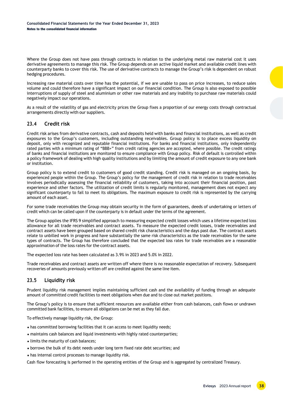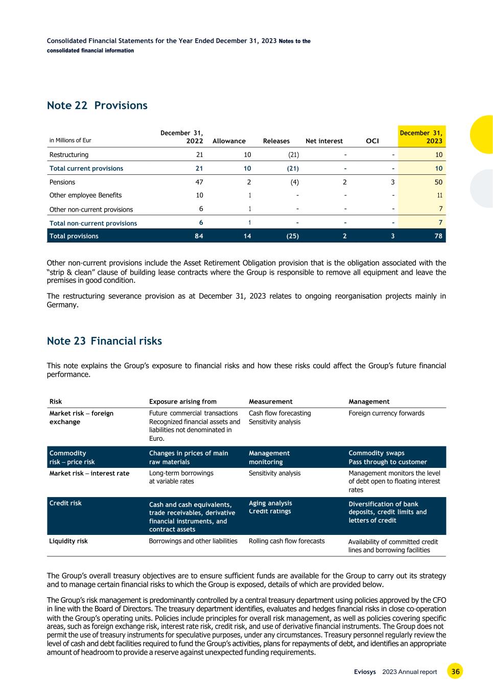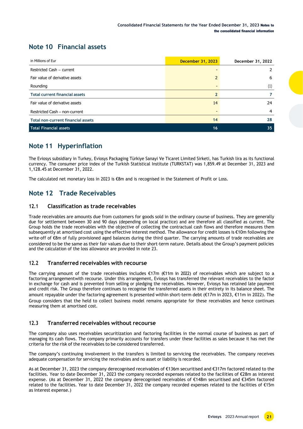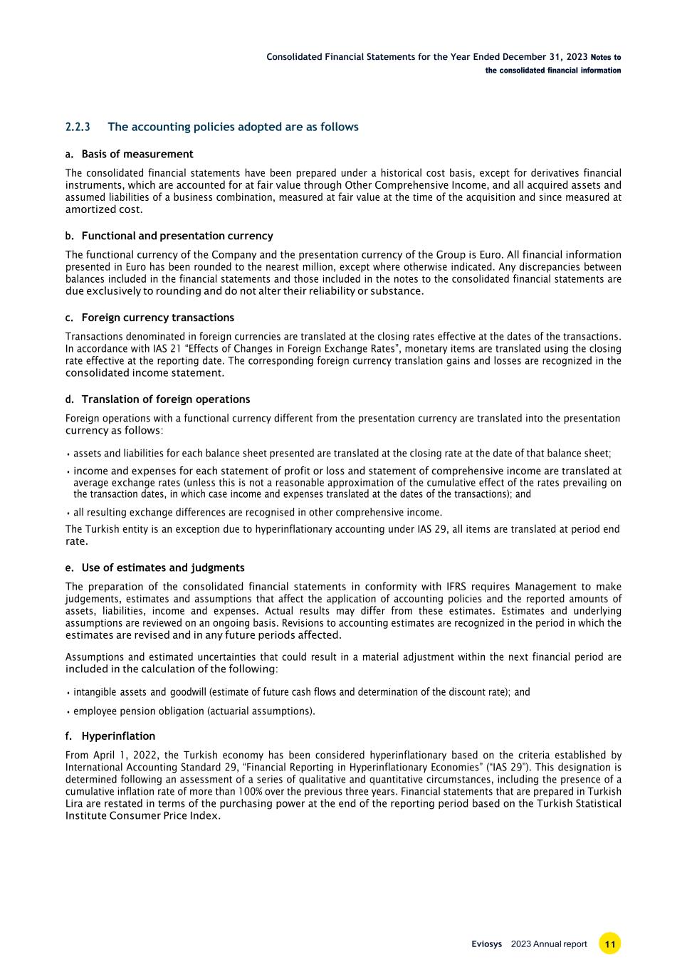 Consolidated Financial Statements for the Year Ended December 31, 2023 Notes to the consolidated financial information Eviosys 2023 Annual report 11 2.2.3 The accounting policies adopted are as follows a. Basis of measurement The consolidated financial statements have been prepared under a historical cost basis, except for derivatives financial instruments, which are accounted for at fair value through Other Comprehensive Income, and all acquired assets and assumed liabilities of a business combination, measured at fair value at the time of the acquisition and since measured at amortized cost. b. Functional and presentation currency The functional currency of the Company and the presentation currency of the Group is Euro. All financial information presented in Euro has been rounded to the nearest million, except where otherwise indicated. Any discrepancies between balances included in the financial statements and those included in the notes to the consolidated financial statements are due exclusively to rounding and do not alter their reliability or substance. c. Foreign currency transactions Transactions denominated in foreign currencies are translated at the closing rates effective at the dates of the transactions. In accordance with IAS 21 “Effects of Changes in Foreign Exchange Rates”, monetary items are translated using the closing rate effective at the reporting date. The corresponding foreign currency translation gains and losses are recognized in the consolidated income statement. d. Translation of foreign operations Foreign operations with a functional currency different from the presentation currency are translated into the presentation currency as follows: • assets and liabilities for each balance sheet presented are translated at the closing rate at the date of that balance sheet; • income and expenses for each statement of profit or loss and statement of comprehensive income are translated at average exchange rates (unless this is not a reasonable approximation of the cumulative effect of the rates prevailing on the transaction dates, in which case income and expenses translated at the dates of the transactions); and • all resulting exchange differences are recognised in other comprehensive income. The Turkish entity is an exception due to hyperinflationary accounting under IAS 29, all items are translated at period end rate. e. Use of estimates and judgments The preparation of the consolidated financial statements in conformity with IFRS requires Management to make judgements, estimates and assumptions that affect the application of accounting policies and the reported amounts of assets, liabilities, income and expenses. Actual results may differ from these estimates. Estimates and underlying assumptions are reviewed on an ongoing basis. Revisions to accounting estimates are recognized in the period in which the estimates are revised and in any future periods affected. Assumptions and estimated uncertainties that could result in a material adjustment within the next financial period are included in the calculation of the following: • intangible assets and goodwill (estimate of future cash flows and determination of the discount rate); and • employee pension obligation (actuarial assumptions). f. Hyperinflation From April 1, 2022, the Turkish economy has been considered hyperinflationary based on the criteria established by International Accounting Standard 29, “Financial Reporting in Hyperinflationary Economies” (“IAS 29”). This designation is determined following an assessment of a series of qualitative and quantitative circumstances, including the presence of a cumulative inflation rate of more than 100% over the previous three years. Financial statements that are prepared in Turkish Lira are restated in terms of the purchasing power at the end of the reporting period based on the Turkish Statistical Institute Consumer Price Index.
