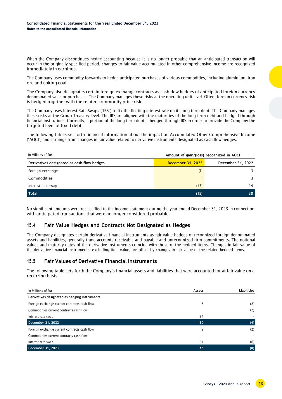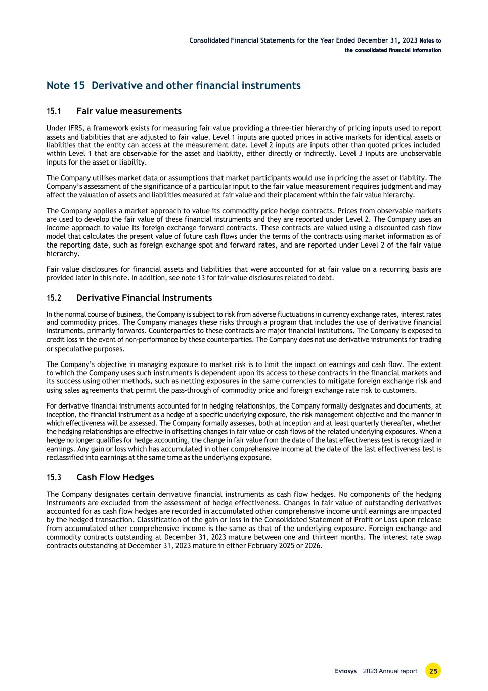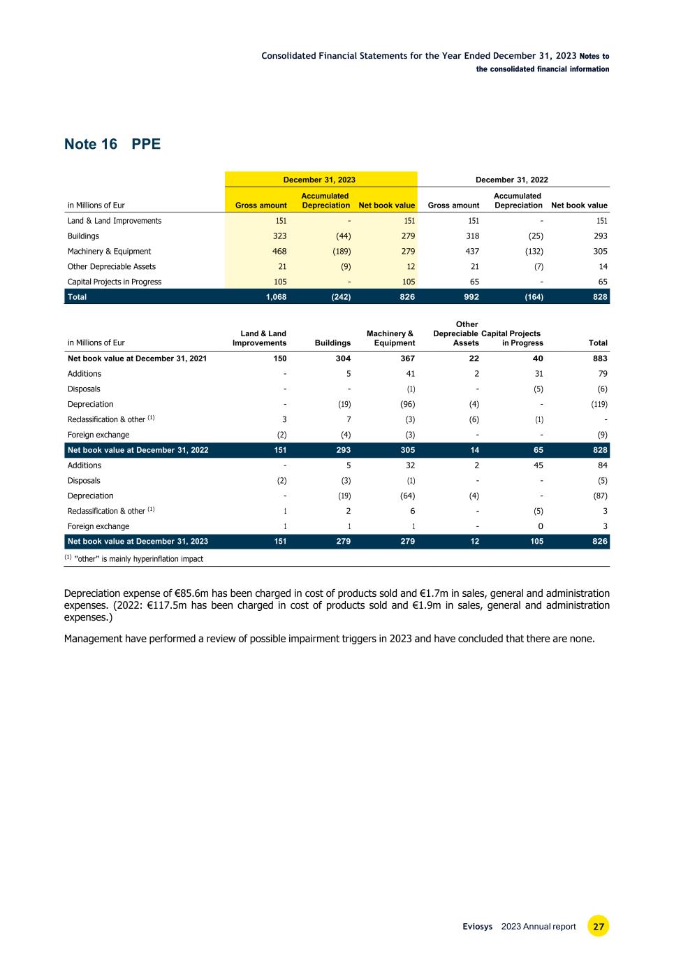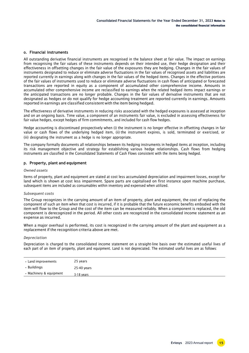 Consolidated Financial Statements for the Year Ended December 31, 2023 Notes to the consolidated financial information Eviosys 2023 Annual report 15 o. Financial instruments All outstanding derivative financial instruments are recognised in the balance sheet at fair value. The impact on earnings from recognising the fair values of these instruments depends on their intended use, their hedge designation and their effectiveness in offsetting changes in the fair value of the exposures they are hedging. Changes in the fair values of instruments designated to reduce or eliminate adverse fluctuations in the fair values of recognised assets and liabilities are reported currently in earnings along with changes in the fair values of the hedged items. Changes in the effective portions of the fair values of instruments used to reduce or eliminate adverse fluctuations in cash flows of anticipated or forecasted transactions are reported in equity as a component of accumulated other comprehensive income. Amounts in accumulated other comprehensive income are reclassified to earnings when the related hedged items impact earnings or the anticipated transactions are no longer probable. Changes in the fair values of derivative instruments that are not designated as hedges or do not qualify for hedge accounting treatment are reported currently in earnings. Amounts reported in earnings are classified consistent with the item being hedged. The effectiveness of derivative instruments in reducing risks associated with the hedged exposures is assessed at inception and on an ongoing basis. Time value, a component of an instruments fair value, is excluded in assessing effectiveness for fair value hedges, except hedges of firm commitments, and included for cash flow hedges. Hedge accounting is discontinued prospectively when (i) the instrument is no longer effective in offsetting changes in fair value or cash flows of the underlying hedged item, (ii) the instrument expires, is sold, terminated or exercised, or (iii) designating the instrument as a hedge is no longer appropriate. The company formally documents all relationships between its hedging instruments in hedged items at inception, including its risk management objective and strategy for establishing various hedge relationships. Cash flows from hedging instruments are classified in the Consolidated Statements of Cash Flows consistent with the items being hedged. p. Property, plant and equipment Owned assets Items of property, plant and equipment are stated at cost less accumulated depreciation and impairment losses, except for land which is shown at cost less impairment. Spare parts are capitalised on first instance upon machine purchase, subsequent items are included as consumables within inventory and expensed when utilized. Subsequent costs The Group recognizes in the carrying amount of an item of property, plant and equipment, the cost of replacing the component of such an item when that cost is incurred, if it is probable that the future economic benefits embodied with the item will flow to the Group and the cost of the item can be measured reliably. When a component is replaced, the old component is derecognized in the period. All other costs are recognized in the consolidated income statement as an expense as incurred. When a major overhaul is performed, its cost is recognized in the carrying amount of the plant and equipment as a replacement if the recognition criteria above are met. Depreciation Depreciation is charged to the consolidated income statement on a straight‑line basis over the estimated useful lives of each part of an item of property, plant and equipment. Land is not depreciated. The estimated useful lives are as follows: • Land improvements • Buildings • Machinery & equipment 25 years 25‑40 years 3‑18 years