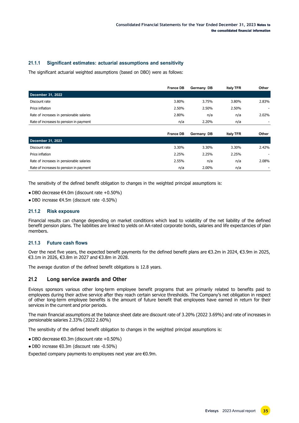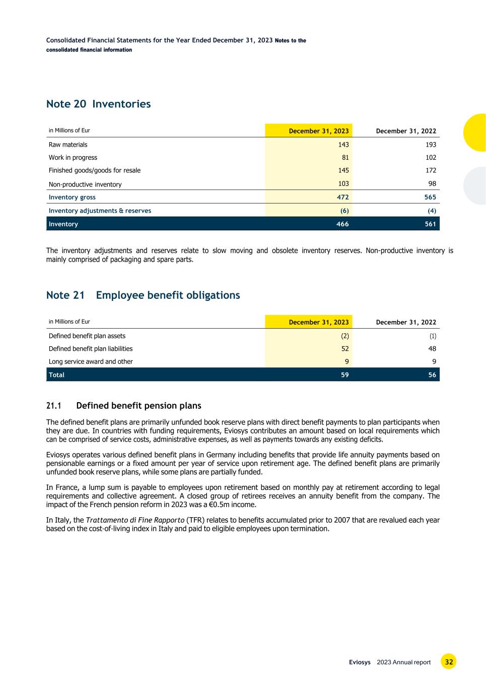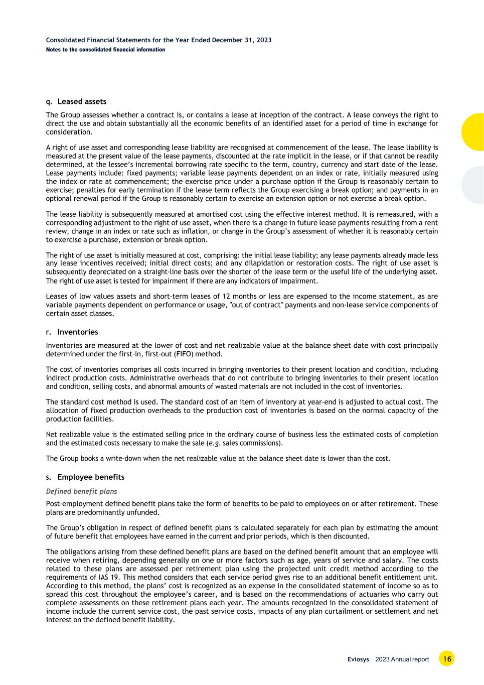 Eviosys 2023 Annual report 16 Consolidated Financial Statements for the Year Ended December 31, 2023 Notes to the consolidated financial information q. Leased assets The Group assesses whether a contract is, or contains a lease at inception of the contract. A lease conveys the right to direct the use and obtain substantially all the economic benefits of an identified asset for a period of time in exchange for consideration. A right of use asset and corresponding lease liability are recognised at commencement of the lease. The lease liability is measured at the present value of the lease payments, discounted at the rate implicit in the lease, or if that cannot be readily determined, at the lessee’s incremental borrowing rate specific to the term, country, currency and start date of the lease. Lease payments include: fixed payments; variable lease payments dependent on an index or rate, initially measured using the index or rate at commencement; the exercise price under a purchase option if the Group is reasonably certain to exercise; penalties for early termination if the lease term reflects the Group exercising a break option; and payments in an optional renewal period if the Group is reasonably certain to exercise an extension option or not exercise a break option. The lease liability is subsequently measured at amortised cost using the effective interest method. It is remeasured, with a corresponding adjustment to the right of use asset, when there is a change in future lease payments resulting from a rent review, change in an index or rate such as inflation, or change in the Group’s assessment of whether it is reasonably certain to exercise a purchase, extension or break option. The right of use asset is initially measured at cost, comprising: the initial lease liability; any lease payments already made less any lease incentives received; initial direct costs; and any dilapidation or restoration costs. The right of use asset is subsequently depreciated on a straight‑line basis over the shorter of the lease term or the useful life of the underlying asset. The right of use asset is tested for impairment if there are any indicators of impairment. Leases of low values assets and short‑term leases of 12 months or less are expensed to the income statement, as are variable payments dependent on performance or usage, "out of contract" payments and non‑lease service components of certain asset classes. r. Inventories Inventories are measured at the lower of cost and net realizable value at the balance sheet date with cost principally determined under the first‑in, first‑out (FIFO) method. The cost of inventories comprises all costs incurred in bringing inventories to their present location and condition, including indirect production costs. Administrative overheads that do not contribute to bringing inventories to their present location and condition, selling costs, and abnormal amounts of wasted materials are not included in the cost of inventories. The standard cost method is used. The standard cost of an item of inventory at year‑end is adjusted to actual cost. The allocation of fixed production overheads to the production cost of inventories is based on the normal capacity of the production facilities. Net realizable value is the estimated selling price in the ordinary course of business less the estimated costs of completion and the estimated costs necessary to make the sale (e.g. sales commissions). The Group books a write‑down when the net realizable value at the balance sheet date is lower than the cost. s. Employee benefits Defined benefit plans Post‑employment defined benefit plans take the form of benefits to be paid to employees on or after retirement. These plans are predominantly unfunded. The Group’s obligation in respect of defined benefit plans is calculated separately for each plan by estimating the amount of future benefit that employees have earned in the current and prior periods, which is then discounted. The obligations arising from these defined benefit plans are based on the defined benefit amount that an employee will receive when retiring, depending generally on one or more factors such as age, years of service and salary. The costs related to these plans are assessed per retirement plan using the projected unit credit method according to the requirements of IAS 19. This method considers that each service period gives rise to an additional benefit entitlement unit. According to this method, the plans’ cost is recognized as an expense in the consolidated statement of income so as to spread this cost throughout the employee’s career, and is based on the recommendations of actuaries who carry out complete assessments on these retirement plans each year. The amounts recognized in the consolidated statement of income include the current service cost, the past service costs, impacts of any plan curtailment or settlement and net interest on the defined benefit liability.
