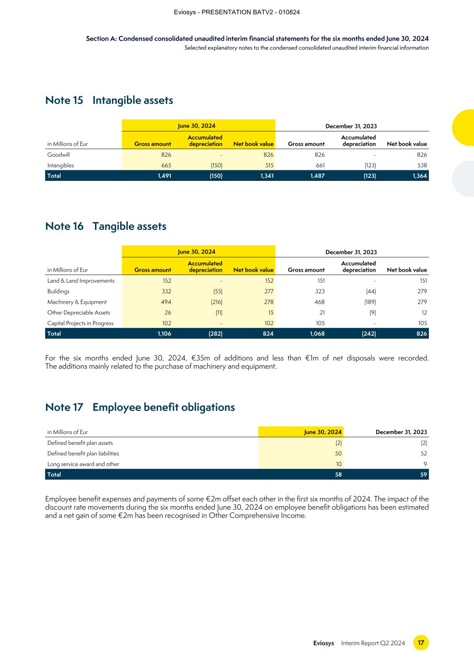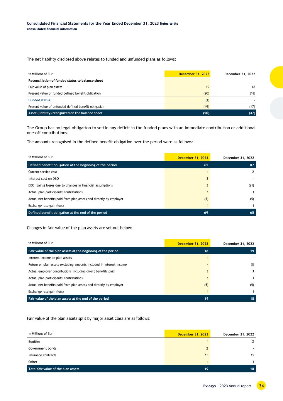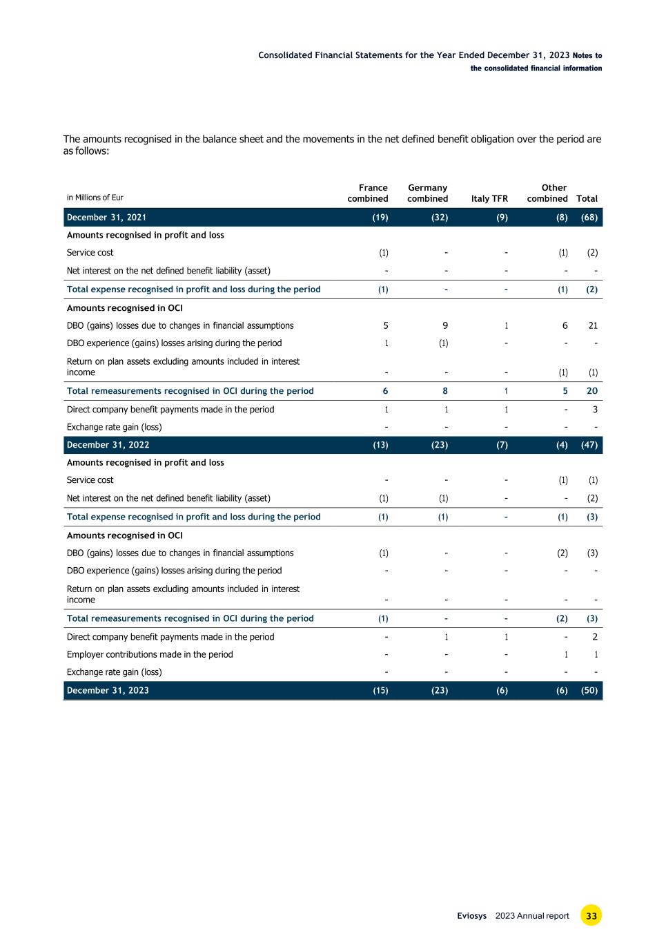 Eviosys 2023 Annual report 16 Consolidated Financial Statements for the Year Ended December 31, 2023 Notes to the consolidated financial information q. Leased assets The Group assesses whether a contract is, or contains a lease at inception of the contract. A lease conveys the right to direct the use and obtain substantially all the economic benefits of an identified asset for a period of time in exchange for consideration. A right of use asset and corresponding lease liability are recognised at commencement of the lease. The lease liability is measured at the present value of the lease payments, discounted at the rate implicit in the lease, or if that cannot be readily determined, at the lessee’s incremental borrowing rate specific to the term, country, currency and start date of the lease. Lease payments include: fixed payments; variable lease payments dependent on an index or rate, initially measured using the index or rate at commencement; the exercise price under a purchase option if the Group is reasonably certain to exercise; penalties for early termination if the lease term reflects the Group exercising a break option; and payments in an optional renewal period if the Group is reasonably certain to exercise an extension option or not exercise a break option. The lease liability is subsequently measured at amortised cost using the effective interest method. It is remeasured, with a corresponding adjustment to the right of use asset, when there is a change in future lease payments resulting from a rent review, change in an index or rate such as inflation, or change in the Group’s assessment of whether it is reasonably certain to exercise a purchase, extension or break option. The right of use asset is initially measured at cost, comprising: the initial lease liability; any lease payments already made less any lease incentives received; initial direct costs; and any dilapidation or restoration costs. The right of use asset is subsequently depreciated on a straight‑line basis over the shorter of the lease term or the useful life of the underlying asset. The right of use asset is tested for impairment if there are any indicators of impairment. Leases of low values assets and short‑term leases of 12 months or less are expensed to the income statement, as are variable payments dependent on performance or usage, "out of contract" payments and non‑lease service components of certain asset classes. r. Inventories Inventories are measured at the lower of cost and net realizable value at the balance sheet date with cost principally determined under the first‑in, first‑out (FIFO) method. The cost of inventories comprises all costs incurred in bringing inventories to their present location and condition, including indirect production costs. Administrative overheads that do not contribute to bringing inventories to their present location and condition, selling costs, and abnormal amounts of wasted materials are not included in the cost of inventories. The standard cost method is used. The standard cost of an item of inventory at year‑end is adjusted to actual cost. The allocation of fixed production overheads to the production cost of inventories is based on the normal capacity of the production facilities. Net realizable value is the estimated selling price in the ordinary course of business less the estimated costs of completion and the estimated costs necessary to make the sale (e.g. sales commissions). The Group books a write‑down when the net realizable value at the balance sheet date is lower than the cost. s. Employee benefits Defined benefit plans Post‑employment defined benefit plans take the form of benefits to be paid to employees on or after retirement. These plans are predominantly unfunded. The Group’s obligation in respect of defined benefit plans is calculated separately for each plan by estimating the amount of future benefit that employees have earned in the current and prior periods, which is then discounted. The obligations arising from these defined benefit plans are based on the defined benefit amount that an employee will receive when retiring, depending generally on one or more factors such as age, years of service and salary. The costs related to these plans are assessed per retirement plan using the projected unit credit method according to the requirements of IAS 19. This method considers that each service period gives rise to an additional benefit entitlement unit. According to this method, the plans’ cost is recognized as an expense in the consolidated statement of income so as to spread this cost throughout the employee’s career, and is based on the recommendations of actuaries who carry out complete assessments on these retirement plans each year. The amounts recognized in the consolidated statement of income include the current service cost, the past service costs, impacts of any plan curtailment or settlement and net interest on the defined benefit liability.