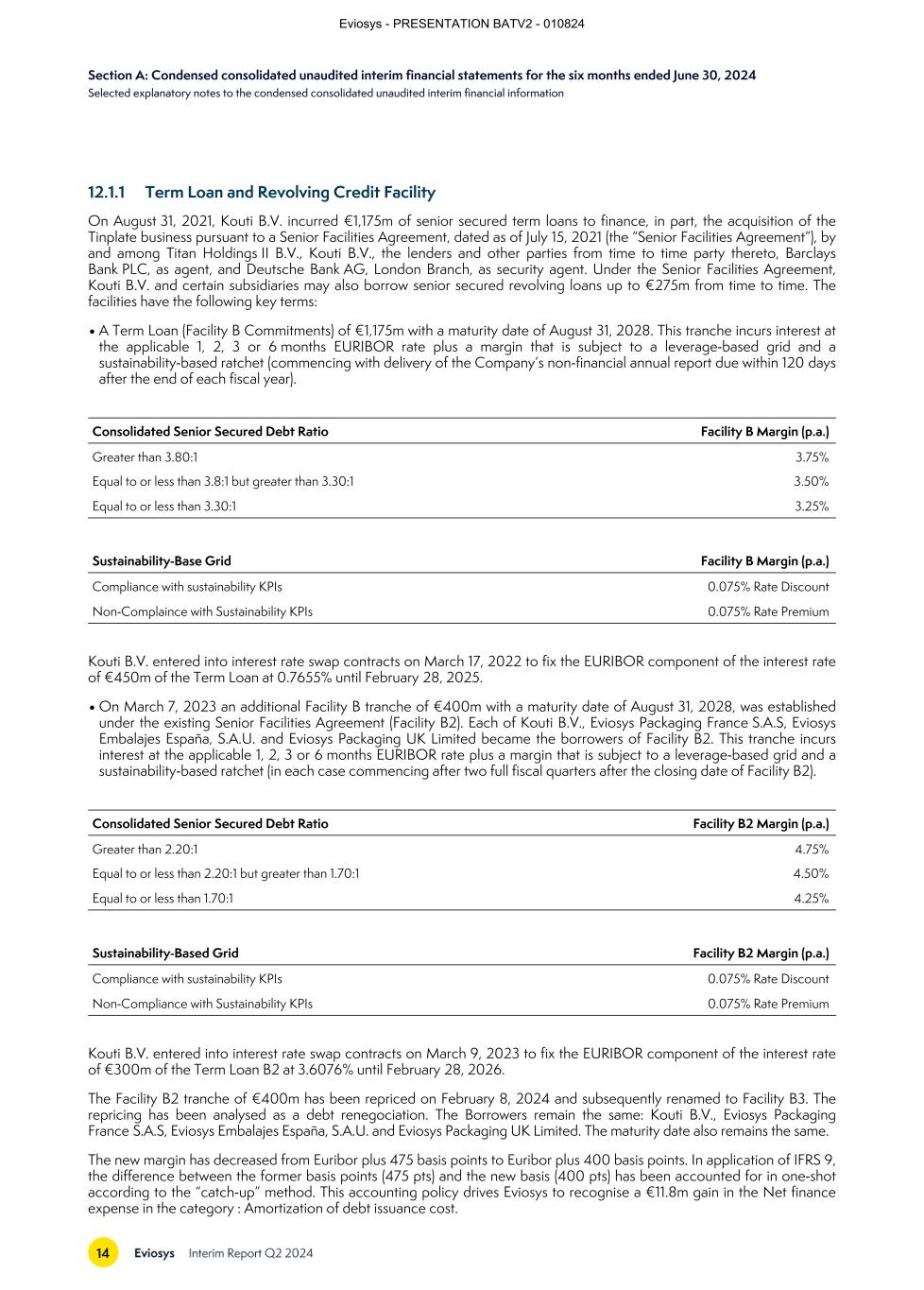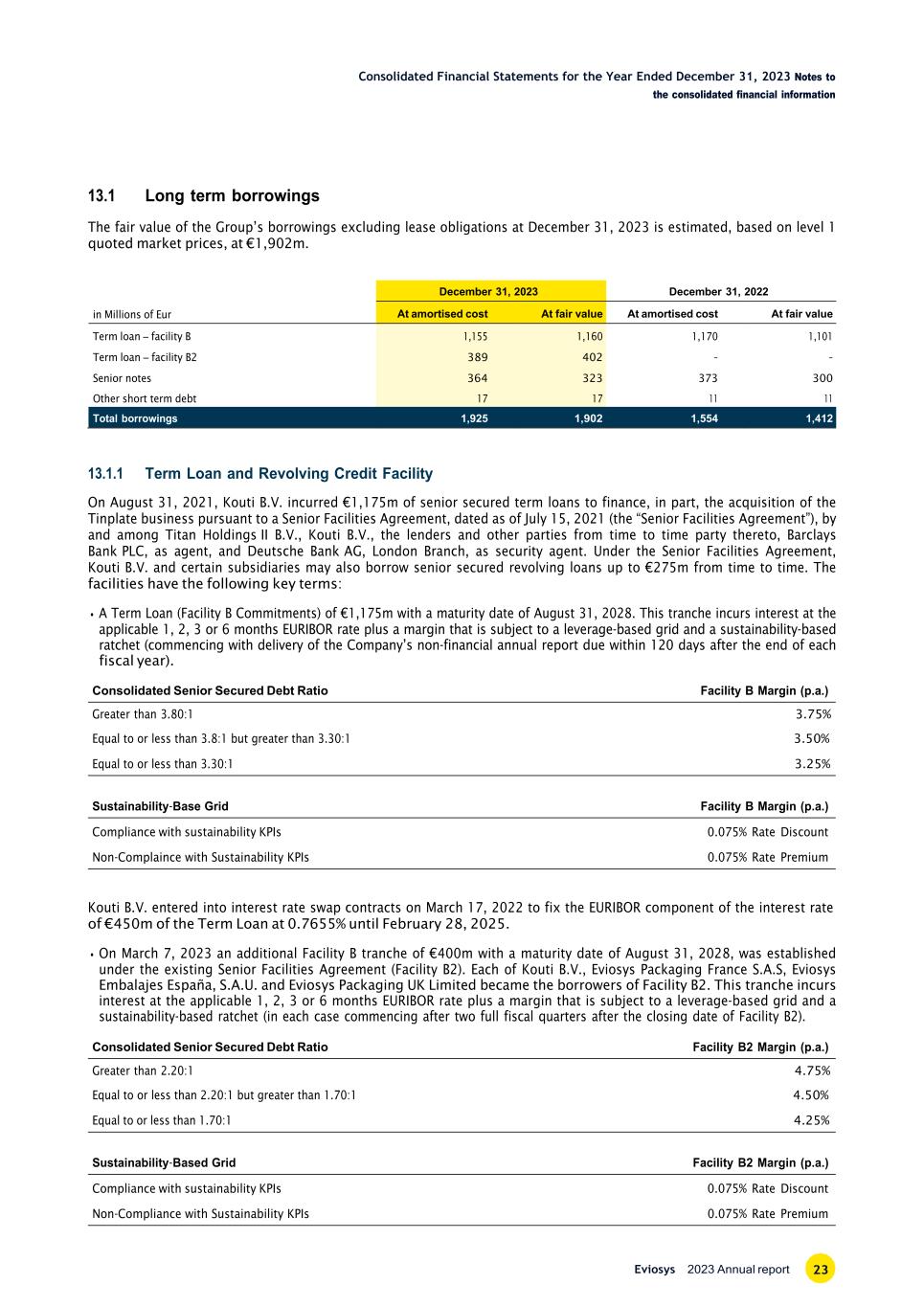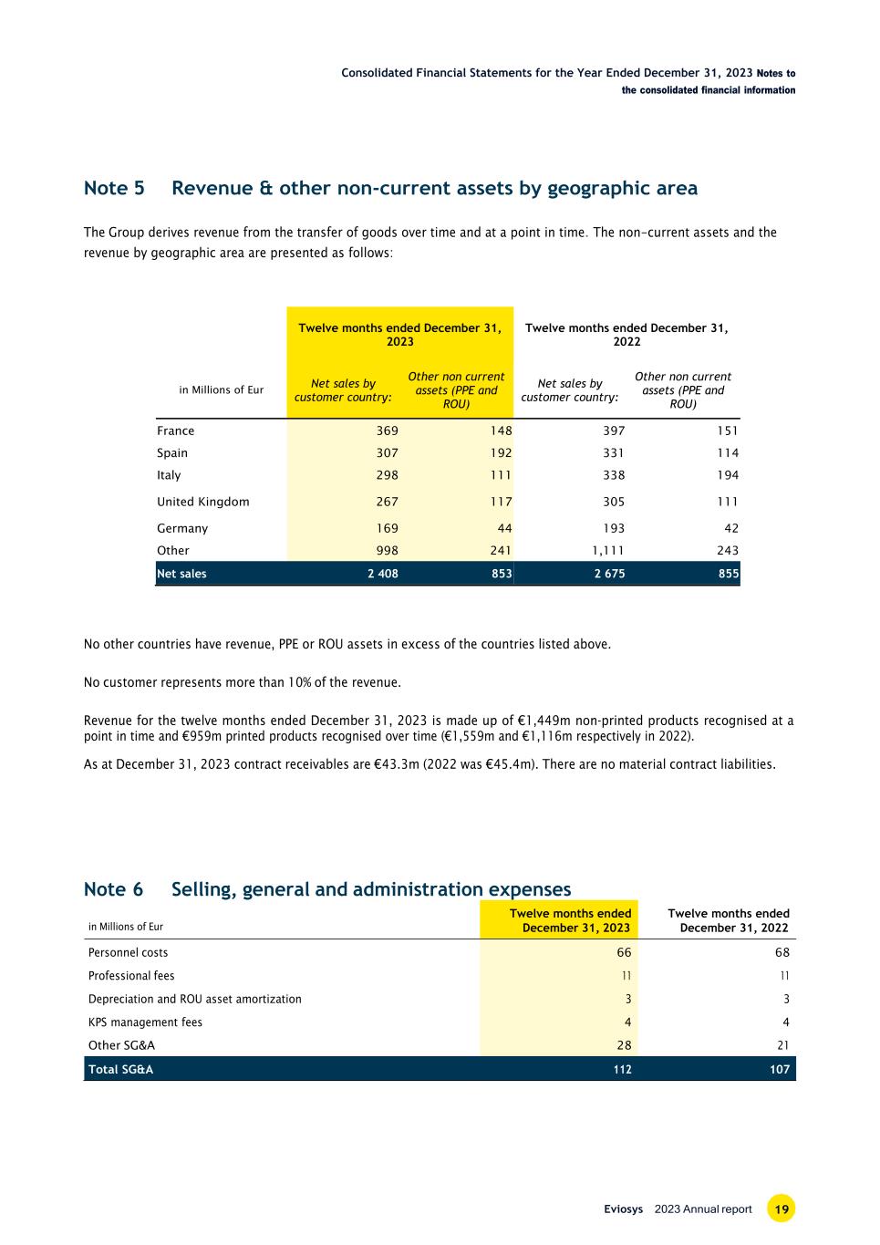 Consolidated Financial Statements for the Year Ended December 31, 2023 Notes to the consolidated financial information Eviosys 2023 Annual report 17 t. Provisions In the ordinary course of business, the Group may be involved in several administrative, judicial and arbitration proceedings. A provision is recognized only when: • The Group has a present obligation to transfer economic benefits as a result of past events • it is probable (more likely than not) that such a transfer will be required to settle the obligation; and • a reliable estimate of the amount of the obligation can be made. u. Revenue The majority of the Company’s revenues are derived from multi‑year requirement contracts with leading manufacturers and marketers of packaged consumer products for can sets, comprising a can and an end. As requirement contracts do not typically include fixed volumes, customers often purchase products pursuant to purchase orders or other communications of a short‑term nature. The can and the end are considered separate performance obligations because they are distinct and separately identifiable. The company manufactures certain products that have no alternative use to the Company once they are printed or manufactured to customer specifications. If the company has enforceable right to payment for customer products at all times in the manufacturing process, revenue is recognized over time. The cost‑to‑cost input method is used as the products involve an intermediary step that results in customized work in progress inventory. For products that follow a “point in time model”, revenue is generally recognized when the control of the goods transfer (i.e. title and risk of loss transfer). Revenue is measured as the amount of consideration the Company expects to receive in exchange for transferring goods. Stand‑alone selling prices for each performance obligation are generally stated in the contract. When the company offers variable consideration in the form of volume rebates to customers, it estimates the most likely amount of revenue to which it is expected to be entitled and includes the estimate in the transaction price, limited to the amount which is probable will not result in reversal of cumulative revenue recognized when the variable consideration is resolved. When the Company offers customers options to purchase additional product at discounted prices, judgement is required to determine if the discounted prices represent material rights. If so, the transaction price allocated to the discount is based on its relative standalone price and is recognised upon purchase of the additional product. Customer payment terms are typically less than one year and as such the company has applied the practical expedient to exclude consideration of significant financing components from the determination of transaction price. Taxes collected from customers and remitted to governmental authorities are excluded from net sales. Shipping and handling fees from product sales are reported as cost of product sold and are accrued when the company recognises revenue overtime before the shipping and handling activities occur. Costs to obtain a contract are generally immaterial but the company has elected the practical expedient to expense these costs as incurred if the duration of the contract is one year or less. Unbilled receivables are recorded for revenue recognised overtime when the company has determined that control has passed to the customer but the customer has not yet been invoiced because the company does not have the present right to payment. The company generally has a present right to payment when title of product transfers. Unbilled receivables are included in receivables in the consolidated balance sheet with a corresponding decrease to inventory. v. Finance income and finance costs Finance costs comprise interest expense on borrowings and financial leases, bank commissions and loss on derivatives. Borrowing costs that are not directly attributable to the acquisition, construction or production of a qualifying asset are recognized in profit or loss using the effective interest method. Foreign currency gains or losses are reported on a net basis as either finance income or finance costs.