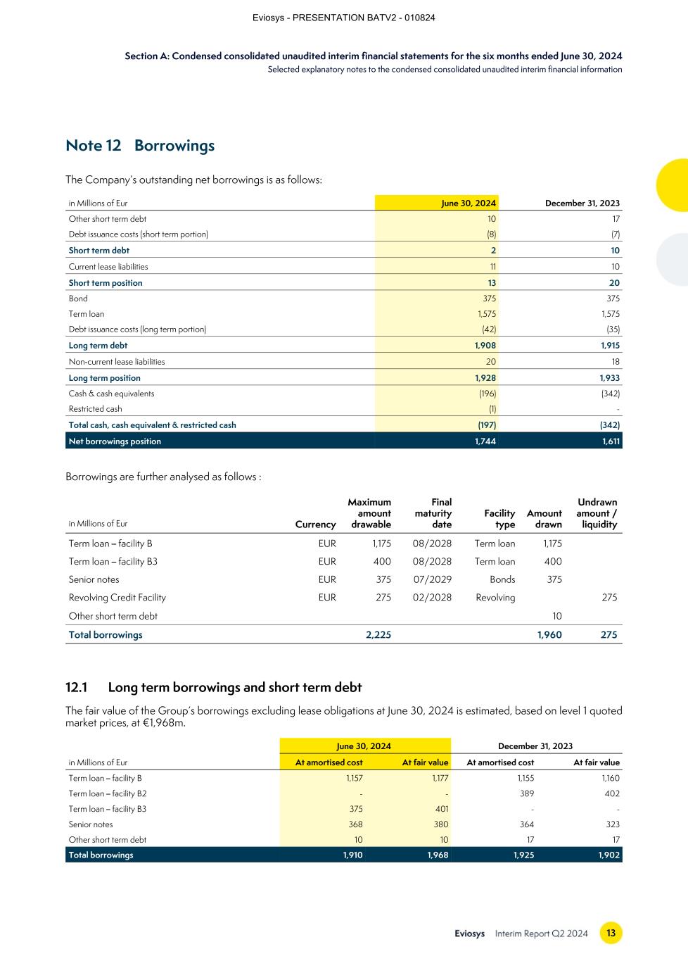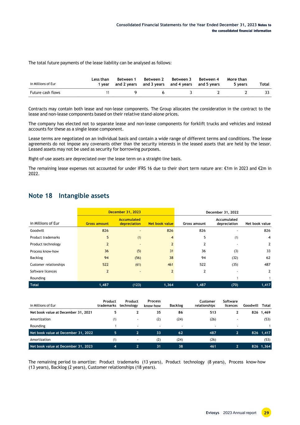 Eviosys 2023 Annual report 14 Consolidated Financial Statements for the Year Ended December 31, 2023 Notes to the consolidated financial information l. Intangible assets Goodwill Goodwill on acquisitions of subsidiaries is included in intangible assets. Goodwill is not amortised but is tested for impairment annually, or more frequently if events or changes in circumstances indicate that it might be impaired and is carried at cost less accumulated impairment losses. Gains and losses on the disposal of an entity include the carrying amount of goodwill relating to the entity sold. The Group is composed of one reporting segment and management have allocated goodwill to only one cash‑generating unit. Trademarks, licences and customer contracts Separately acquired trademarks and licences are shown at historical cost. Trademarks, licences and customer contracts acquired in a business combination are recognised at fair value at the acquisition date. They have a finite useful life and are subsequently carried at cost less accumulated amortisation and impairment losses. Research and development Research expenditure is recognised as an expense as incurred. Development costs are only recognised as assets on the balance sheet if all the recognition criteria set out by IAS 38 – Intangible Assets are met. Development costs previously recognised as an expense are not recognised as an asset in a subsequent period. Amortization methods and useful lives Following the revaluation of the intangible assets, the Group amortises intangible assets with a limited useful life, using the straight‑line method over the following periods: • Backlog • Product Trademarks • Product Technology • Process Knowhow • Customer Relationships • Software 4 years 15 years 10 years 15 years 20 years 10 years m. Borrowings Borrowings are initially recognised at fair value, net of transaction costs incurred. Borrowings are subsequently measured at amortised cost. Any difference between the proceeds (net of transaction costs) and the redemption amount is recognised in profit or loss over the period of the borrowings using the effective interest method. Fees paid on the establishment of loan facilities are recognised as transaction costs of the loan to the extent that it is probable that some or all of the facility will be drawn down. In this case, the fee is deferred until the draw‑down occurs. To the extent there is no evidence that it is probable that some or all of the facility will be drawn down, the fee is capitalised as a prepayment for liquidity services and amortised over the period of the facility to which it relates. Borrowings are removed from the balance sheet when the obligation specified in the contract is discharged, cancelled or expired. The difference between the carrying amount of a financial liability that has been extinguished or transferred to another party and the consideration paid, including any non‑cash assets transferred or liabilities assumed, is recognised in profit or loss as other income or finance cost. Borrowings are classified as current liabilities unless the Group has an unconditional right to defer settlement of the liability for at least 12 months after the reporting period. n. Borrowing costs General and specific borrowing costs that are directly attributable to the acquisition, construction or production of a qualifying asset are capitalised during the period of time that is required to complete and prepare the asset for its intended use or sale. Qualifying assets are assets that necessarily take a substantial period of time to get ready for their intended use or sale. Investment income earned on the temporary investment of specific borrowings, pending their expenditure on qualifying assets, is deducted from the borrowing costs eligible for capitalisation. Other borrowing costs are expensed in the period in which they are incurred.