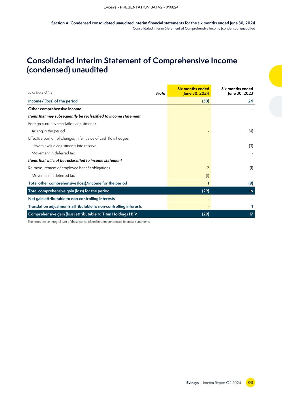 Eviosys 2023 Annual report 05 Consolidated Financial Statement of Comprehensive Income Consolidated Financial Statement of Comprehensive Income in Millions of Eur Note Twelve months ended December 31, 2023 Twelve months ended December 31, 2022 Income of the period 35 161 Other comprehensive income: Items that may subsequently be reclassified to income statement Foreign currency translation adjustments: Arising in the period (6) (12) Effective portion of changes in fair value of cash flow hedges: New fair value adjustments into reserve 15.3 (15) 30 Movement in deferred tax 19.3 - (1) Items that will not be reclassified to income statement Re‑measurement of employee benefit obligations 21 (3) 21 Movement in deferred tax 19.3 - (5) Opening Hyperinflation “catch‑up” adjustment - 2 Total other comprehensive (loss)/income for the period (24) 35 Total comprehensive gain for the period 11 196 Net gain attributable to non‑controlling interests - (5) Translation adjustments attributable to non‑controlling interests - 1 Comprehensive gain attributable to Titan Holdings I B.V 11 192 The notes are an integral part of these consolidated financial statements.