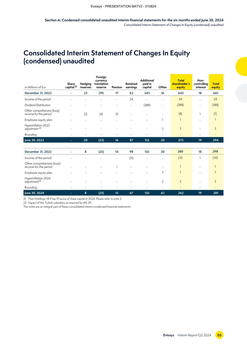 Eviosys 2023 Annual report 07 Consolidated Financial Statement of Changes In Equity Consolidated Financial Statement of Changes In Equity in Millions of Eur Share capital (1) Hedging reserves Foreign currency translation reserve Pension Retained earnings Additional paid in capital Other Non- controlling interest December 31, 2021 - (6) (7) 1 (93) 664 - 560 15 575 Income of the period Capital Increase Dividend Distribution Employee equity plan Other comprehensive (loss)/ income for the period Hyperinflation 2022 adjustment (2) Opening Hyperinflation “catch up” adjustment Dividend paid to NCI Rounding - - - - 156 - - 156 5 161 - - - - - 4 - 4 - 4 - - - - - (125) - (125) - (125) - - - - - - 2 2 - 2 - 29 (12) 16 - - - 33 (1) 32 - - - - - - 10 10 - 10 - - - - - - 2 2 - 2 - - - - - - - - (1) (1) - - - - - - 1 1 - 1 December 31, 2022 - 23 (19) 17 63 543 16 643 18 661 December 31, 2022 23 (19) 17 63 543 16 643 18 661 Income of the period Dividend distribution Employee equity plan Other comprehensive (loss)/ income for the period Hyperinflation adjustment for 2023 (2) Rounding - - - - - - - - (15) - - - - (6) - - - - (3) - 35 - - - - - (388) - - - - - 3 - 11 35 - 35 (388) - (388) 3 - 3 (24) (24) 11 - 11 December 31, 2023 - 8 (25) 14 98 155 30 280 18 298 (1) Titan Holdings I B.V has 91 euros of share capital in 2023. Please refer to note 4 (2) Impact of the Turkish subsidiary as required by IAS 29 The notes are an integral part of these consolidated financial statements. Total equity Total shareholder’s equity