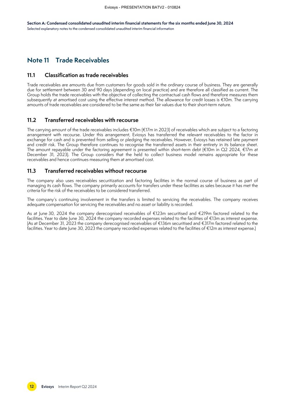 Consolidated Financial Statements for the Year Ended December 31, 2023 Notes to the consolidated financial information Eviosys 2023 Annual report 13 • changes in the Group’s interests in a subsidiary that do not result in a loss of control are accounted for as transactions with owners in their capacity as owners and therefore no goodwill is recognized as a result. Consolidated financial statements are prepared on the basis of Group accounting policies thereby applying uniform accounting policies to similar transactions and other events in similar circumstances. Loss of control Subsidiaries are de‑consolidated from the date on which control ceases. On the loss of control, the Group derecognizes the assets and liabilities of the subsidiary. Any surplus or deficit arising from the loss of control is recognized in consolidated statement of income. If the Group retains any interest in the previous subsidiary, then such interest is measured at fair value at the date that control is lost. Subsequently, it is accounted for as an equity‑accounted investee or as a financial asset depending on the level of influence retained. Investment in associates An associate is an entity in which the investor has significant influence, but which is neither a subsidiary nor a joint venture (see next subsection). Significant influence is the power to participate in the financial and operating policy decisions of the investee when the investor does not have control or joint control. It is presumed to exist when the investor holds between 20% and 50% of the investee’s voting power. This presumption may be rebutted if there is clear evidence to the contrary. The Group does not have any investment in associates over which the Group exercises significant influence. Joint ventures and joint operations The Group does not have any joint arrangement over which the Group exercises joint control (i.e. neither joint ventures nor joint operations). i. Cash, Cash Equivalents and Restricted Cash Cash equivalents represent investments with maturities of three months or less from the time of purchase and are carried at cost, which approximates fair value because of the short maturity of those instruments. The company generally classifies any cash that is legally restricted as to withdrawal or usage as restricted cash. j. Accounts Receivable and Allowance for Credit Losses Trade accounts receivable are recorded at the invoiced amount and do not bear interest. The measurement of expected credit losses is based on past events, historical experience, current conditions and forecasts that affect the collectability of accounts receivable. k. Income Tax The income tax expense or credit for the period is the tax payable on the current period’s taxable income, based on the applicable income tax rate for each jurisdiction, adjusted by changes in deferred tax assets and liabilities attributable to temporary differences and to unused tax losses. The current income tax charge is calculated on the basis of the tax laws enacted or substantively enacted at the end of the reporting period in the countries where the company and its subsidiaries operate and generate taxable income. Management periodically evaluates positions taken in tax returns with respect to situations in which applicable tax regulation is subject to interpretation and considers whether it is probable that a taxation authority will accept an uncertain tax treatment. The Group measures its tax balances either based on the most likely amount or the expected value, depending on which method provides a better prediction of the resolution of the uncertainty. Deferred income tax is provided in full, using the liability method, on temporary differences arising between the tax bases of assets and liabilities and their carrying amounts in the consolidated financial statements. However, deferred tax liabilities are not recognised if they arise from the initial recognition of goodwill. Deferred income tax is accounted if it arises from initial recognition of an asset or liability in a transaction other than a business combination that, at the time of the transaction, affects neither accounting nor taxable profit or loss and does not give rise to equal taxable and deductible temporary differences. Deferred income tax is determined using tax rates (and laws) that have been enacted or substantively enacted by the end of the reporting period and are expected to apply when the related deferred income tax asset is realised or the deferred income tax liability is settled.