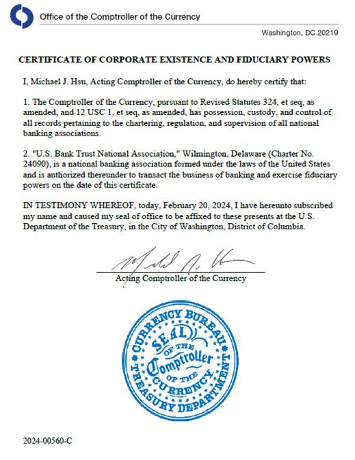 In accordance with Section 321(b) of the Trust Indenture Act of 1939, the undersigned, U.S. BANK TRUST COMPANY, NATIONAL ASSOCIATION hereby consents that reports of examination of the undersigned by Federal, State, Territorial or District authorities may be furnished by such authorities to the Securities and Exchange Commission upon its request therefor.